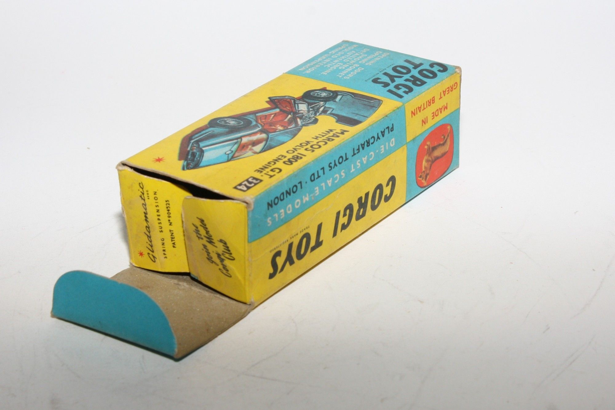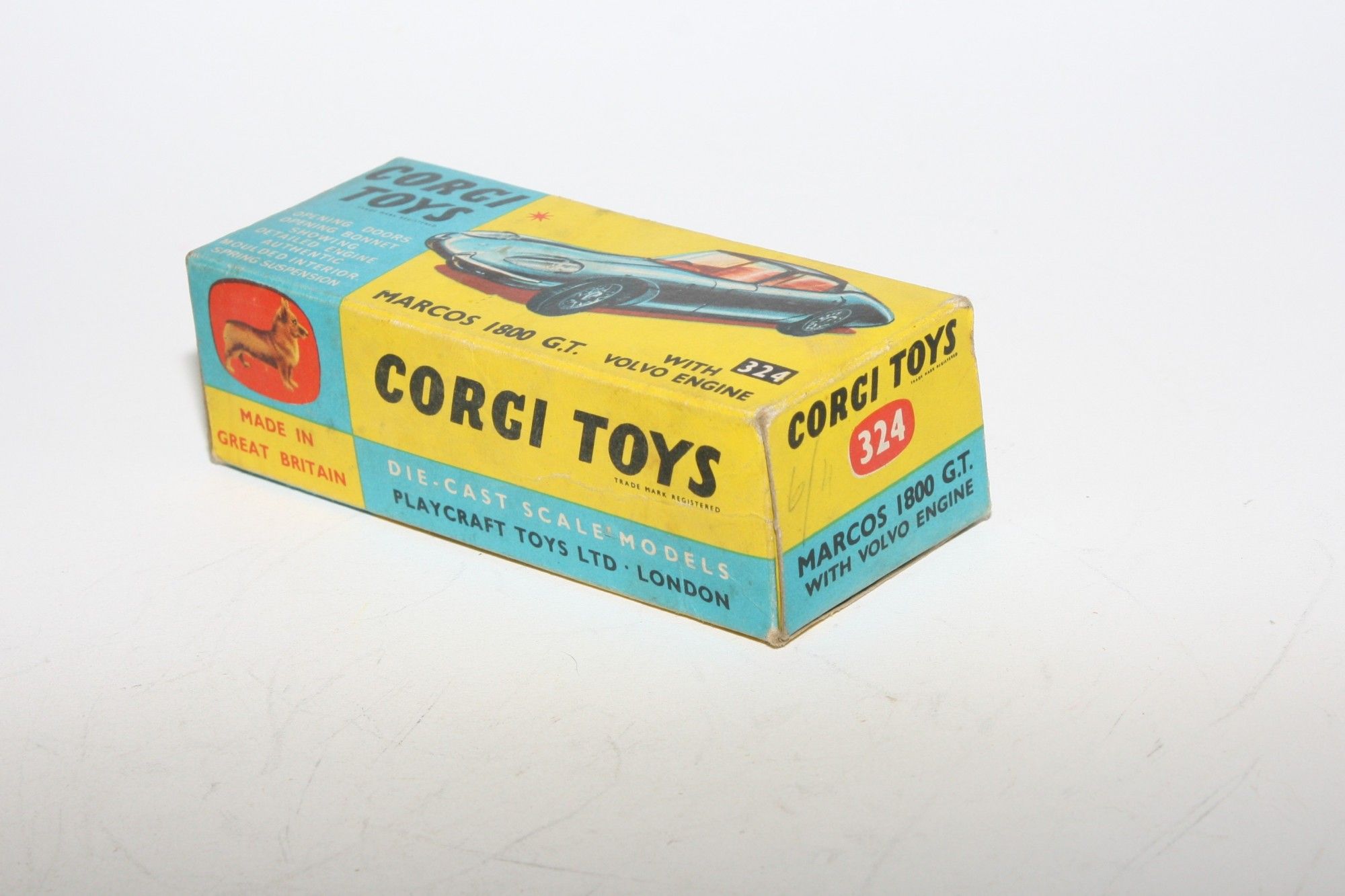 An original yellow and blue carded box for a Corgi 324 which is complete with all flaps attached and in excellent crisp condition, nice bright colours with some minor rubs and marks. Please study the photos.