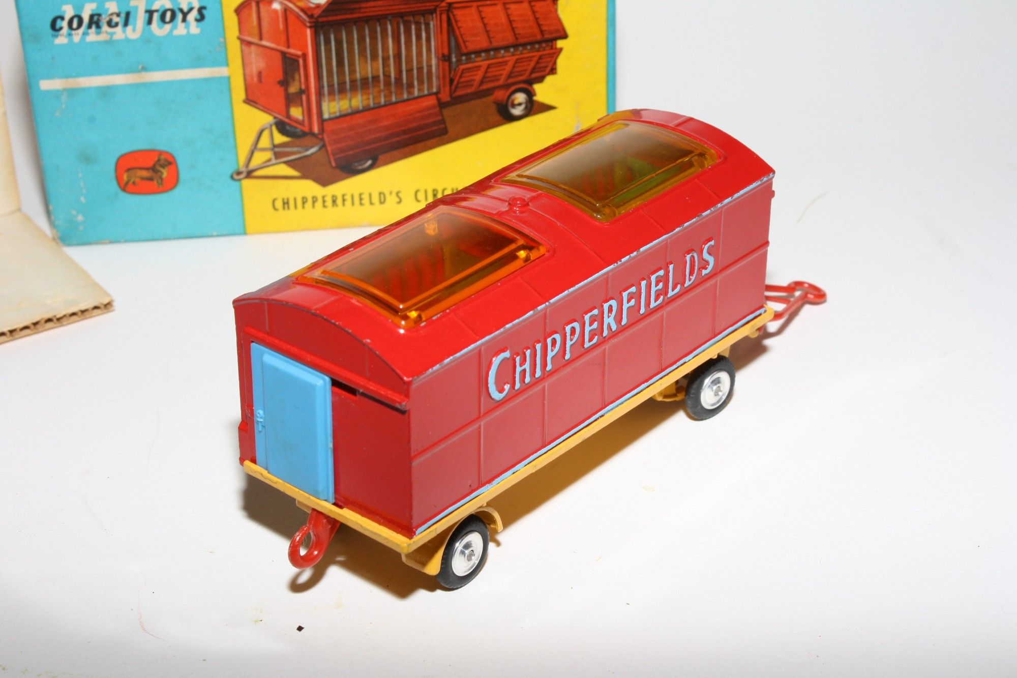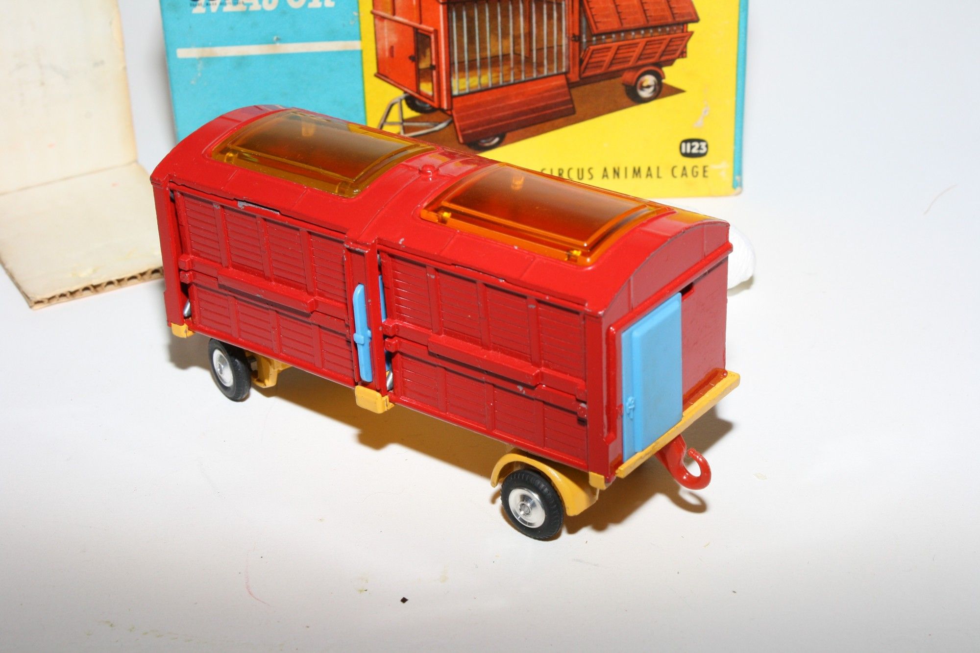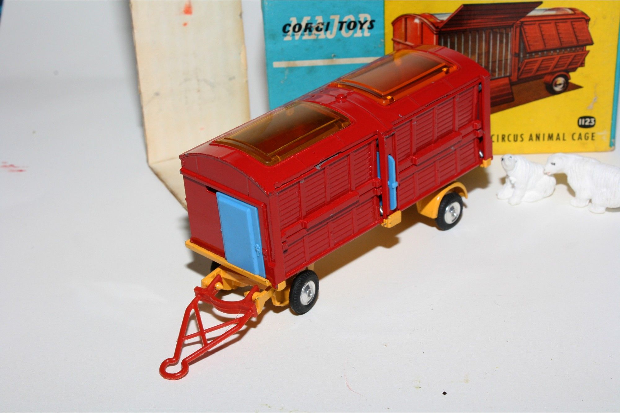 A nice example of this 1960's Corgi Chipperfields model. Gleaming red and yellow paintwork with a few small nicks, please study the high resolution photos for exact condition. Original tyres on spun hubs, skylights fine, main cage door all open as they should, blue plastic end doors and divider all excellent, drawbar and dolly perfect. Comes with two original polar bear figures. Underside excellent