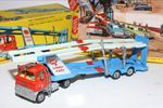A lovely example of this wonderful Corgi Major model. Gleaming original blue and red paintwork is virtually mint, please study the photos for exact condition. Original tyres on shiny spun hubs, sprung suspension, crystal clear windows, interior all fine, horns, exhaust and both mirrors present , all 4 plastic chocs present along with perfect tailgate stickers and fully functioning trailer mechanism present. Mint underside.