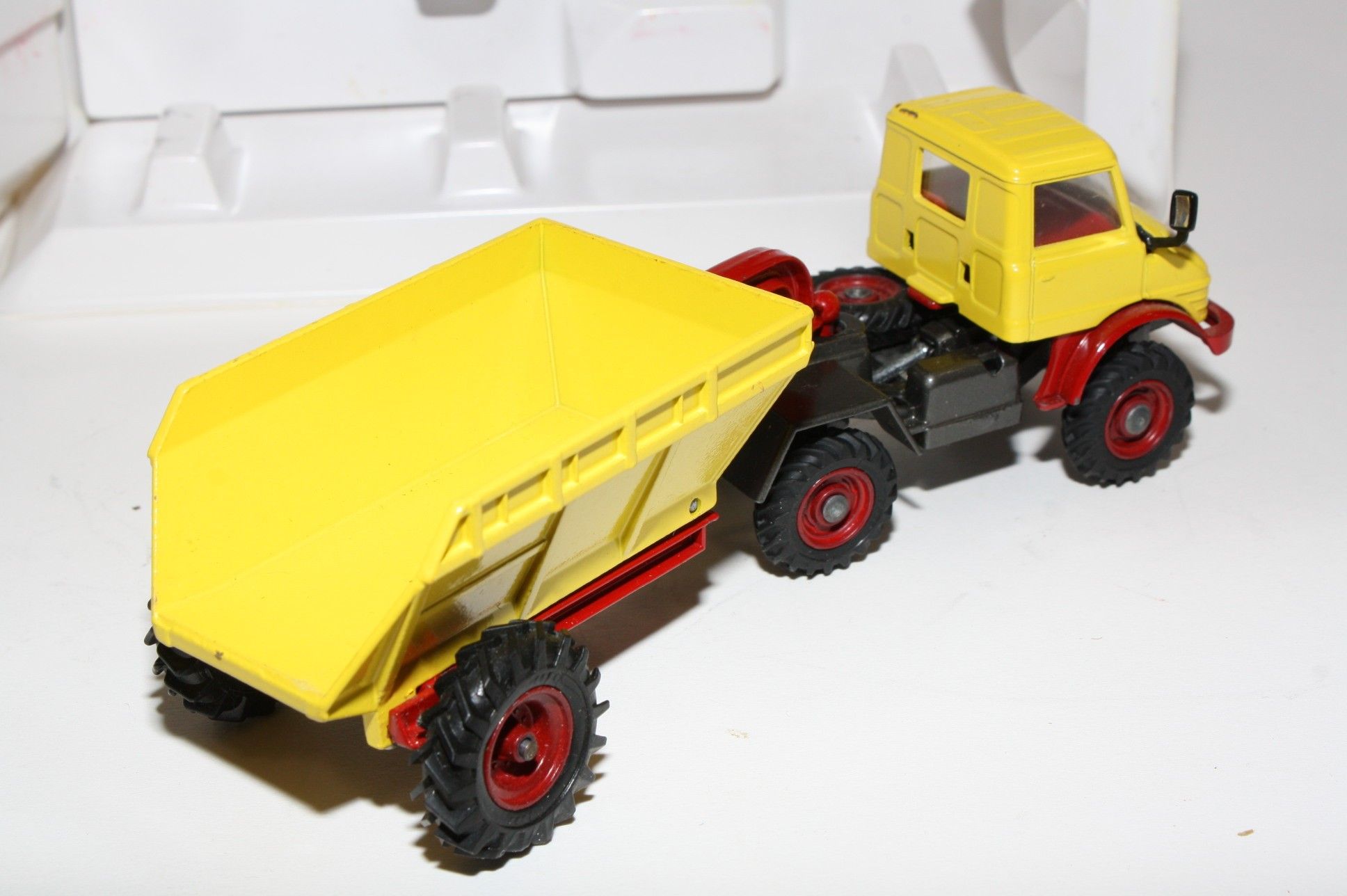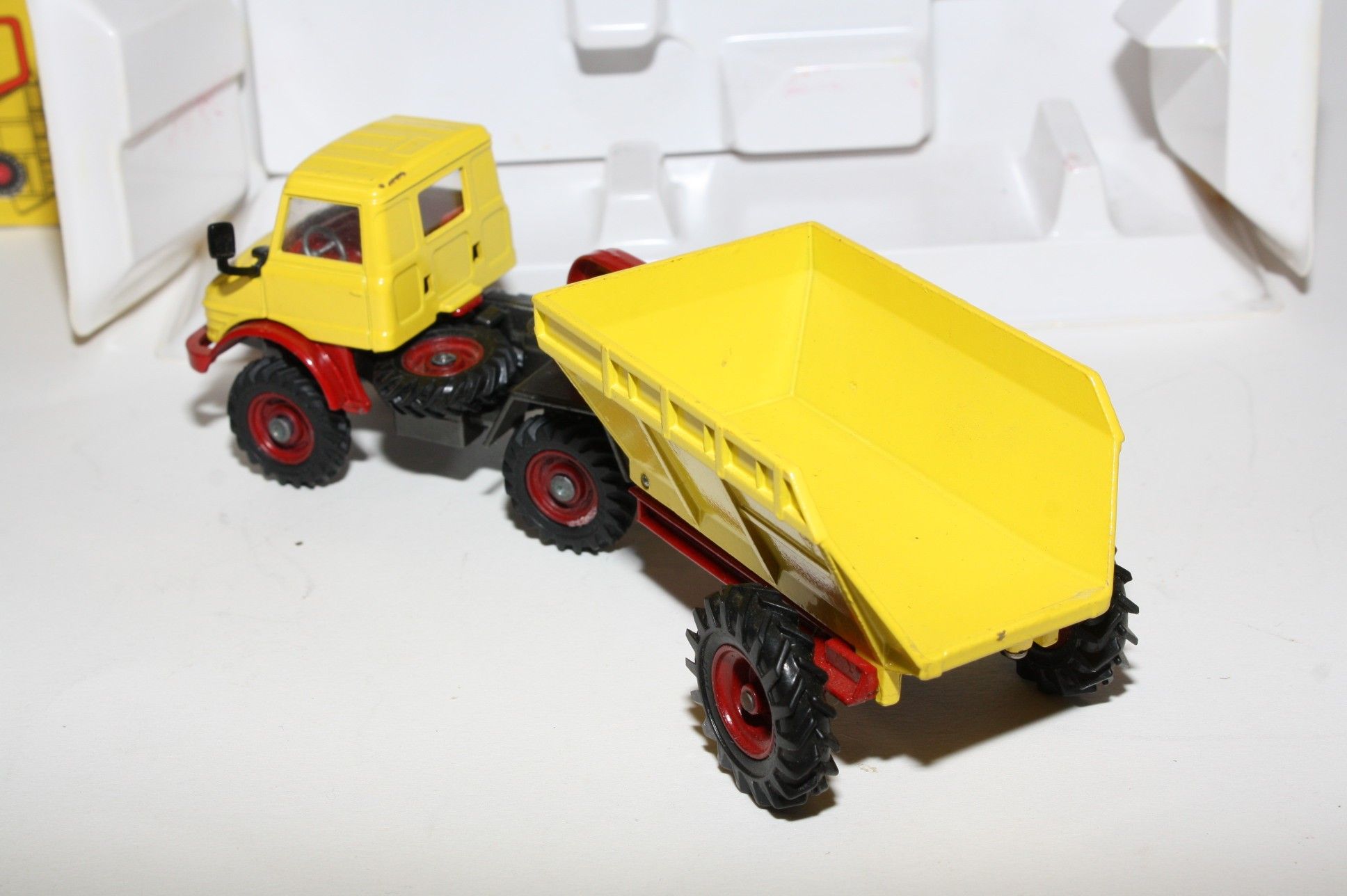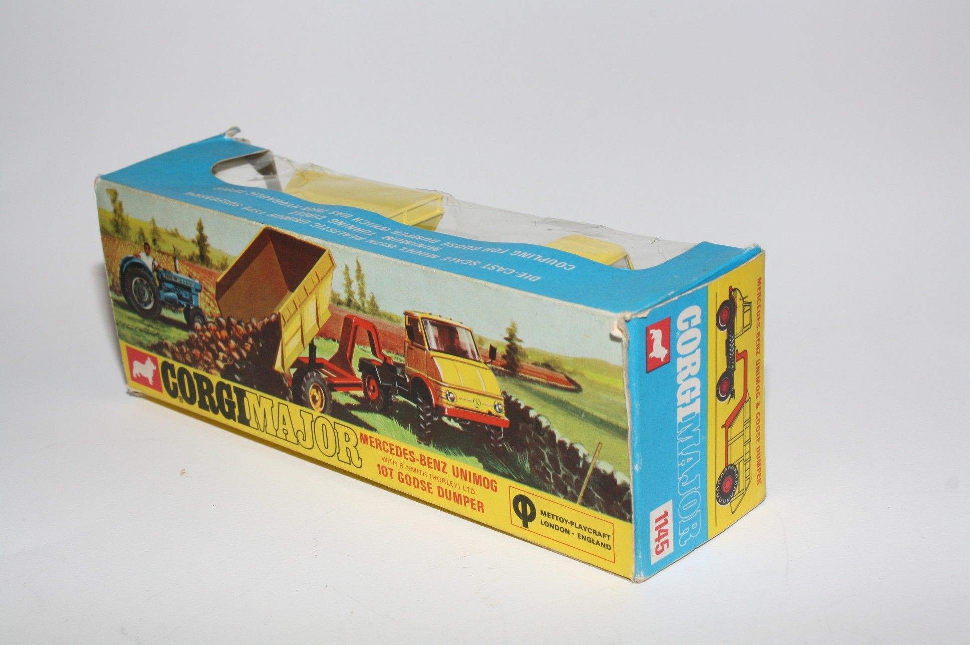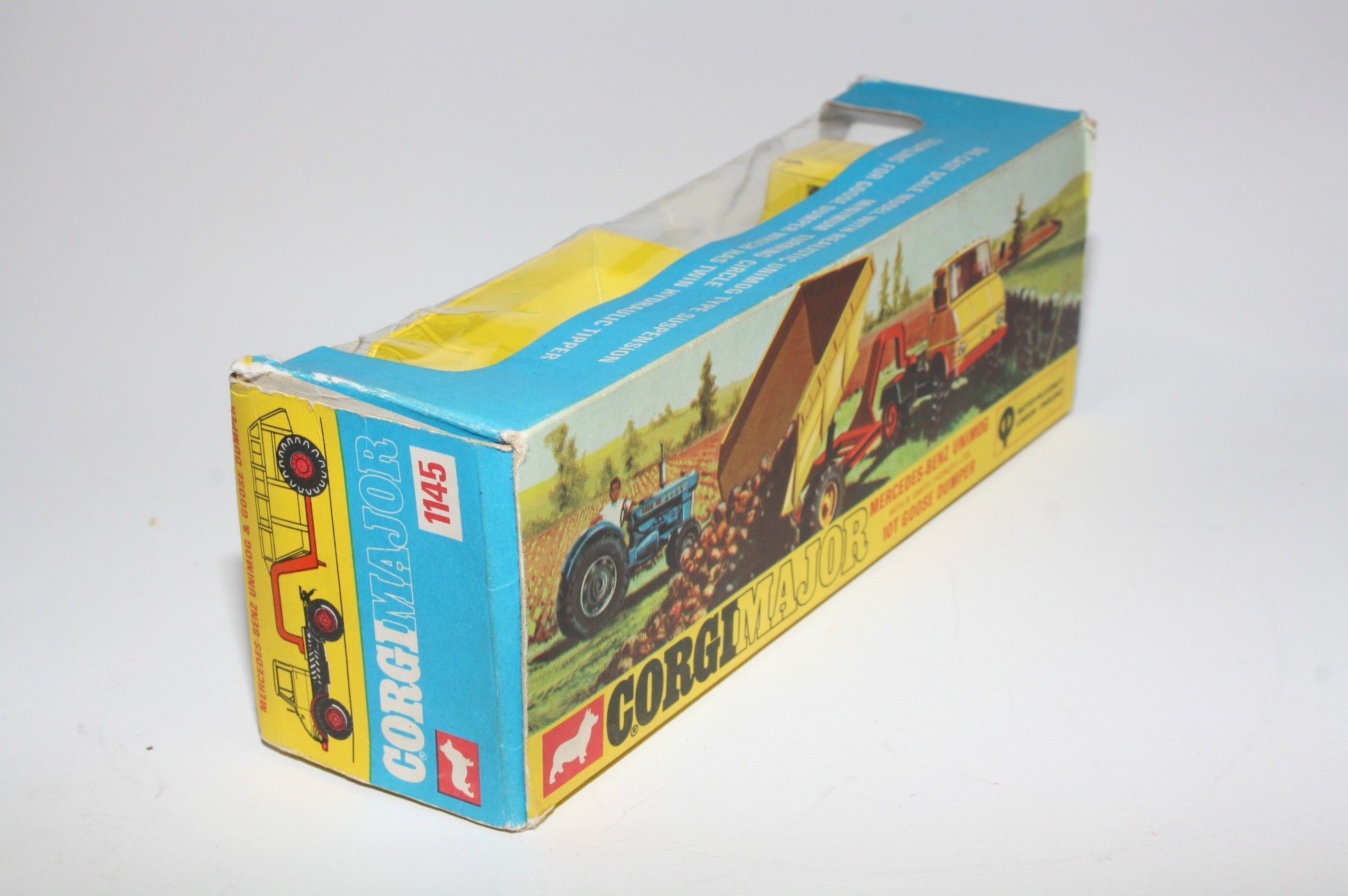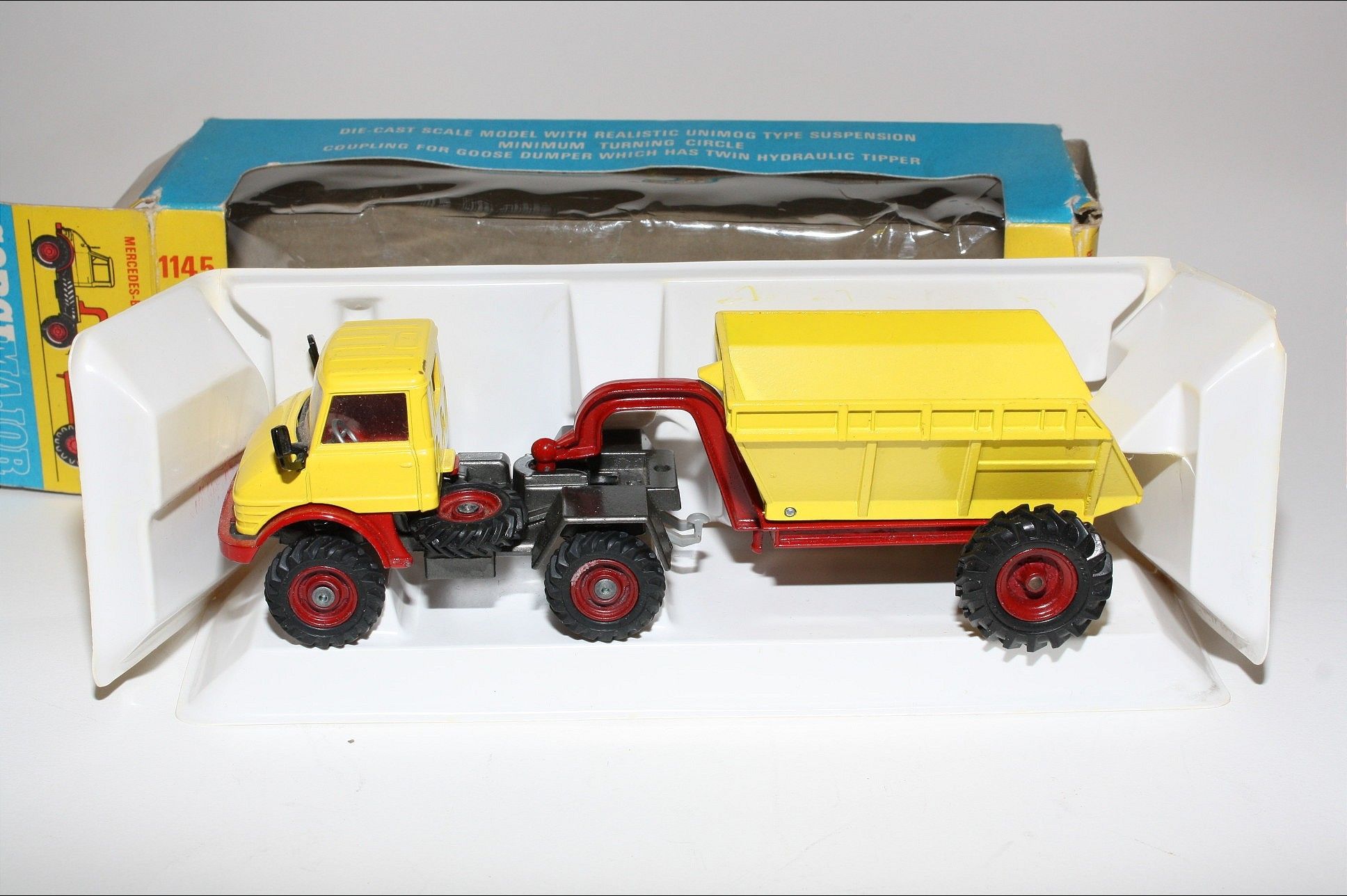 A superb example of this Corgi model. Gleaming original yellow and red paintwork is near mint, has a small scratch across rear of cab roof, please study the photos for exact condition. All perfect hubs and tyres, crystal clear windows and red interior, mirrors, jewelled headlights, perfect Goose dumper. Mint underside.