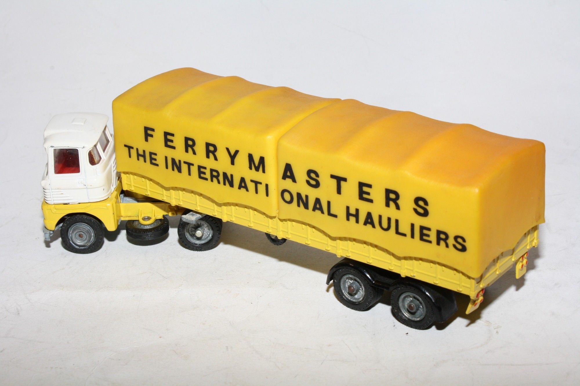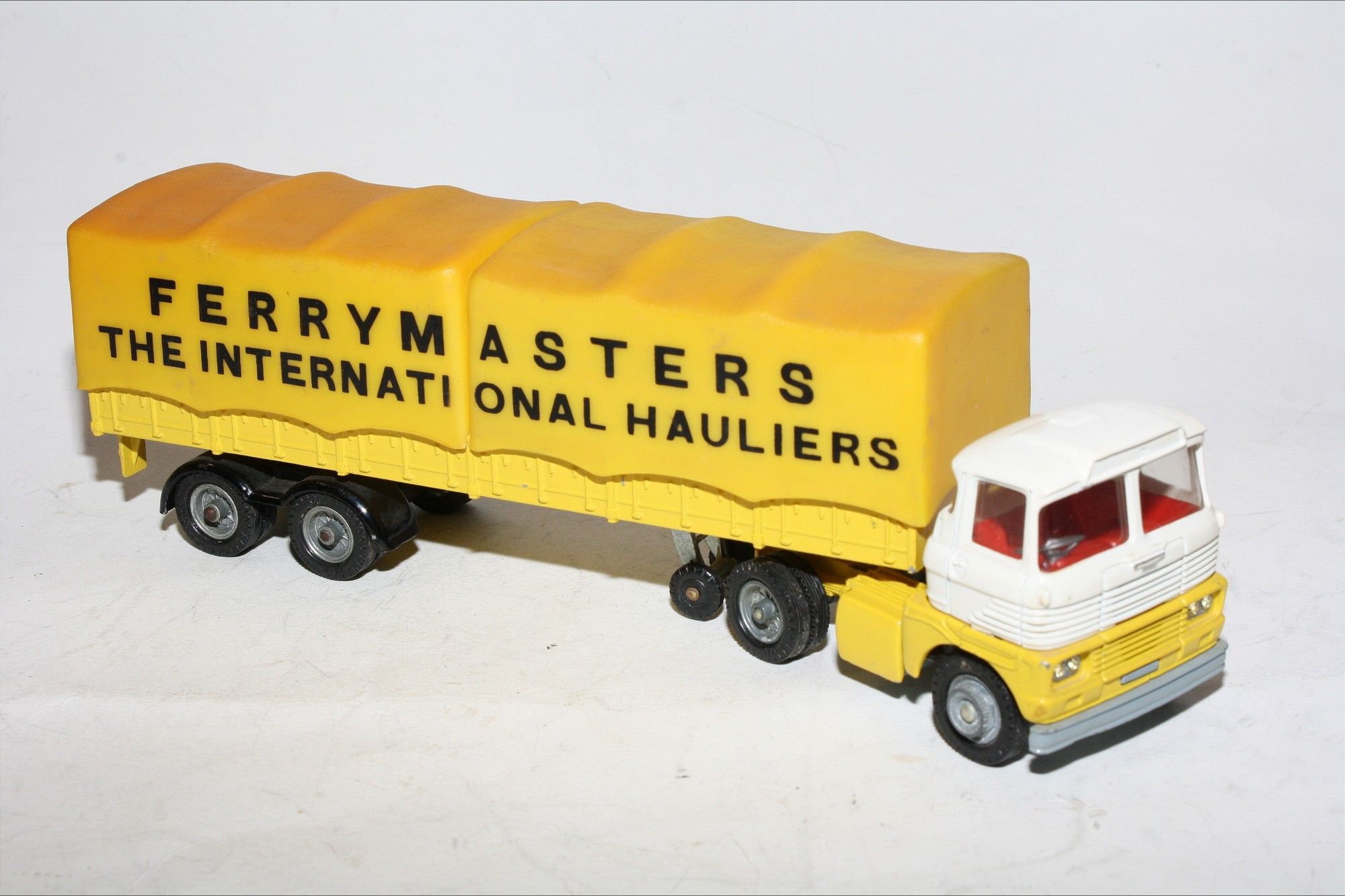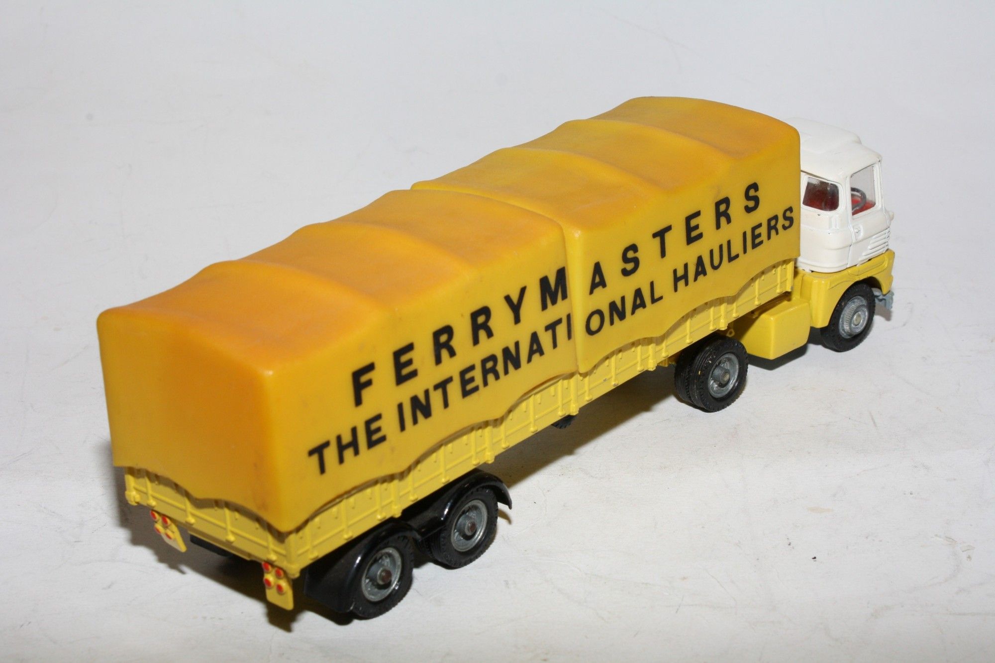 A good example of this Corgi Commercial. Original white and yellow paintwork is near mint with a few small nicks/rubs, please study the photos for exact condition. All original tyres (with some degradation) on cast hubs, good suspension, rear plastic leaf springs all intact, red interior, good clear windows. Perfect coupling, jewelled headlights, plastic tilts all good with a little discolouration. Underside is near mint.