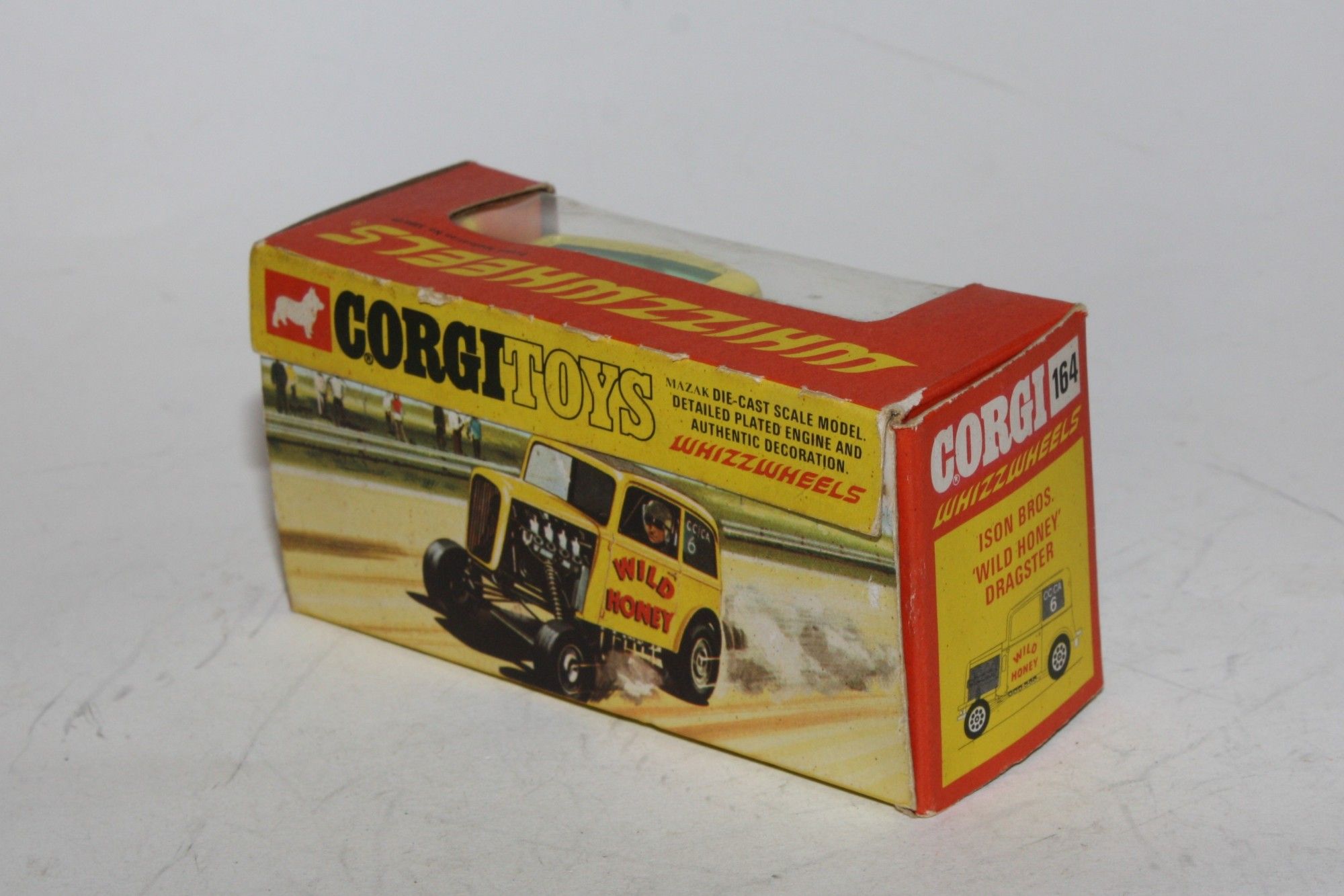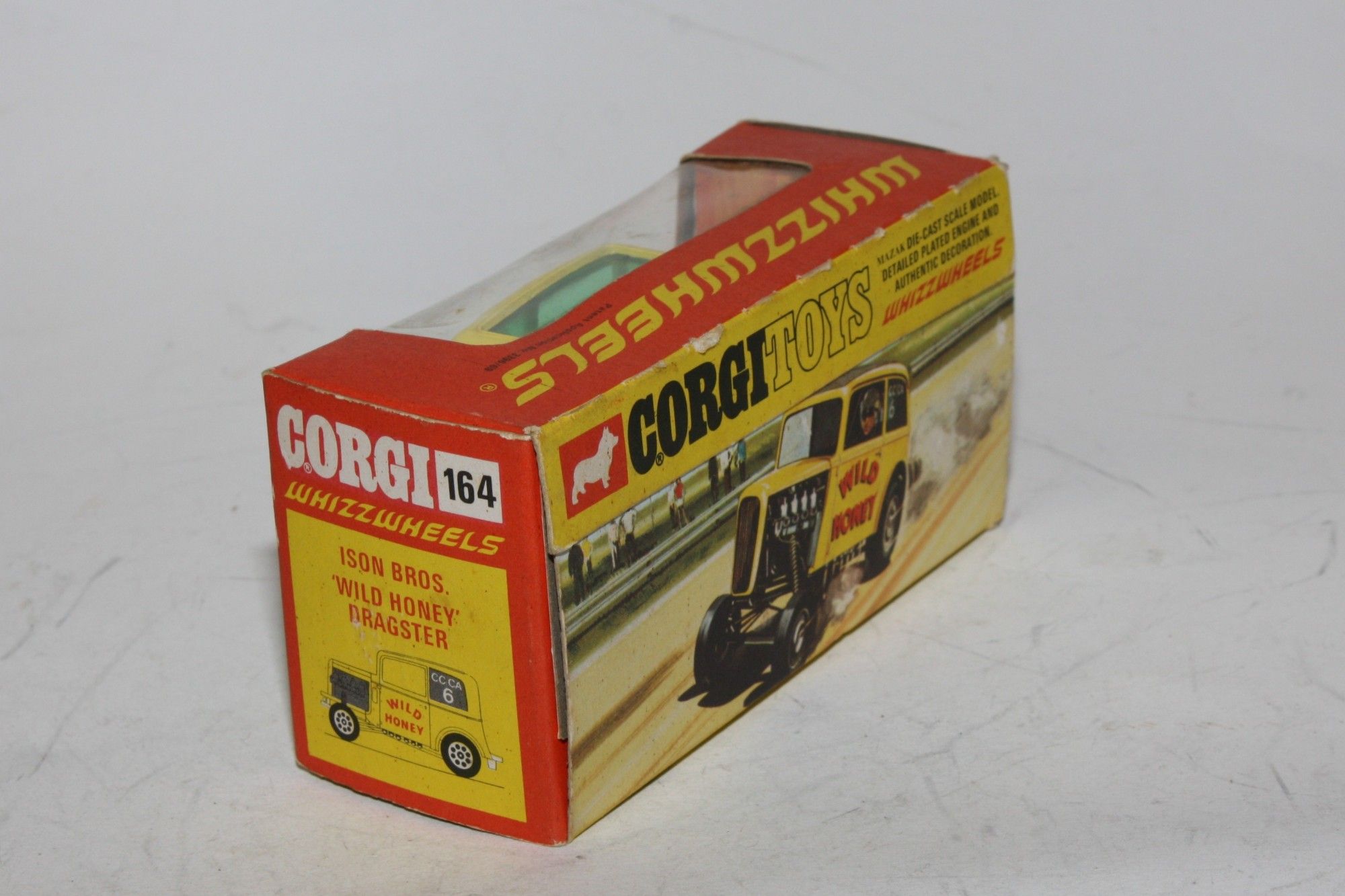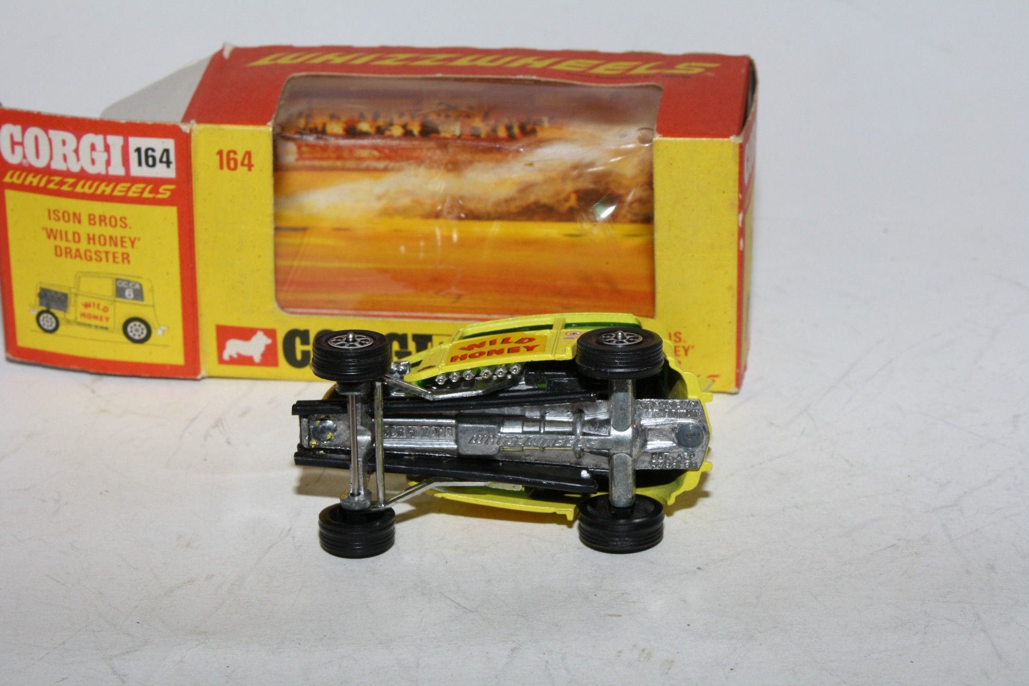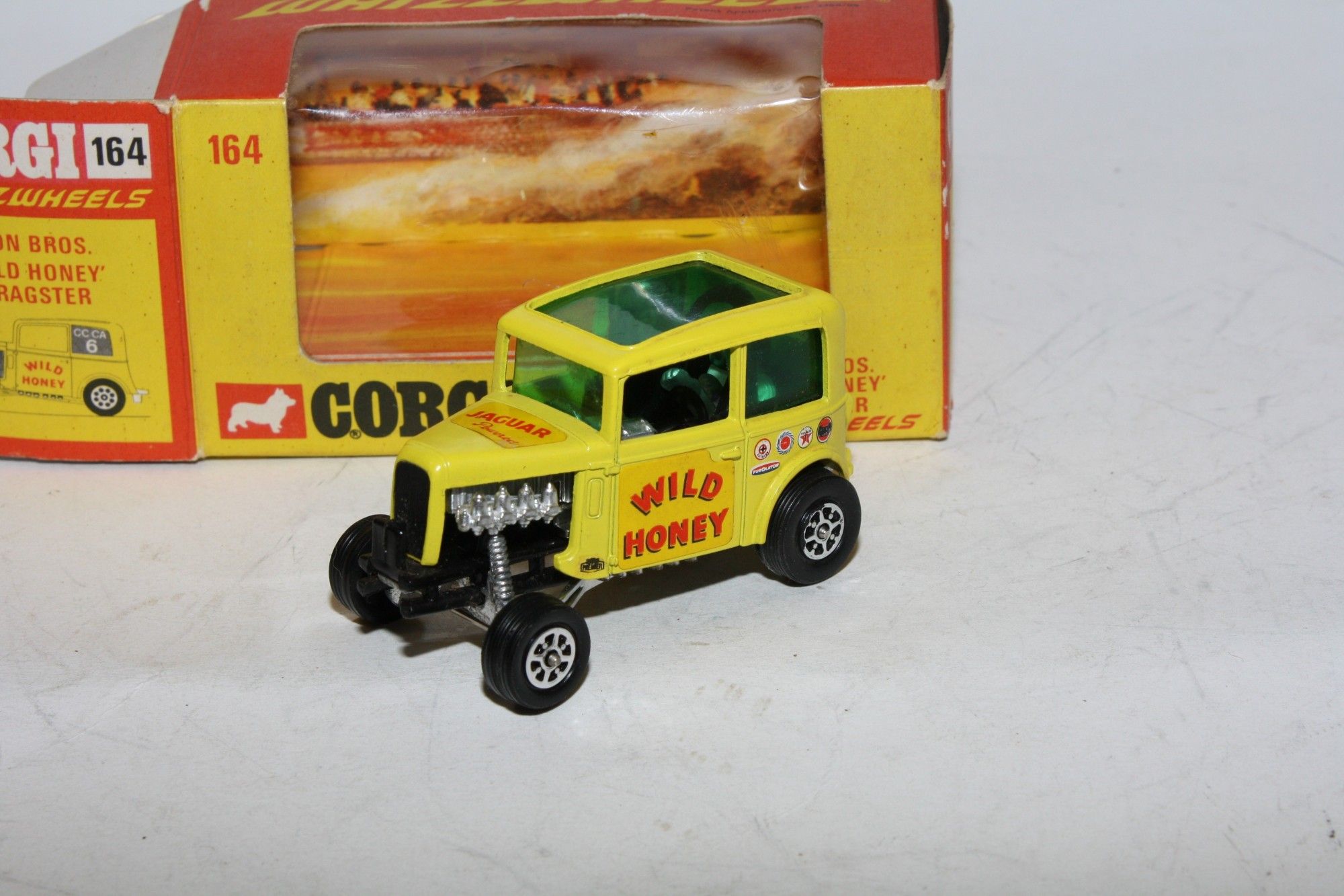 A nice example of this Corgi model. Gleaming yellow paintwork is virtually mint, please study the photos for exact condition. Perfect Whizzwheels, crystal clear green tint windows, perfect stickers/decals, some after market ones added, perfect underside.