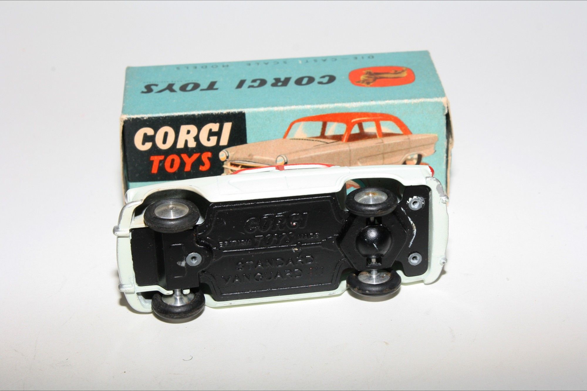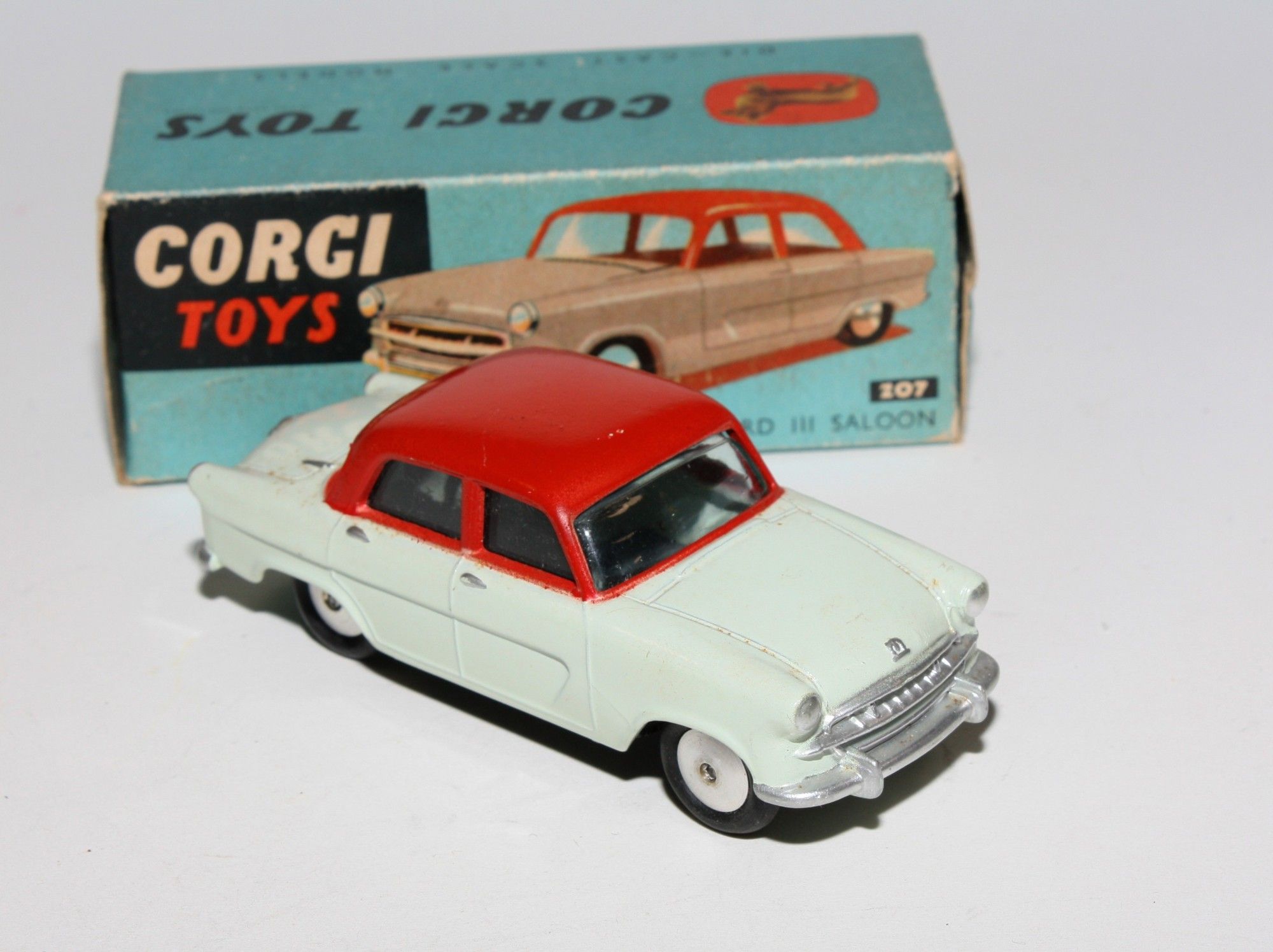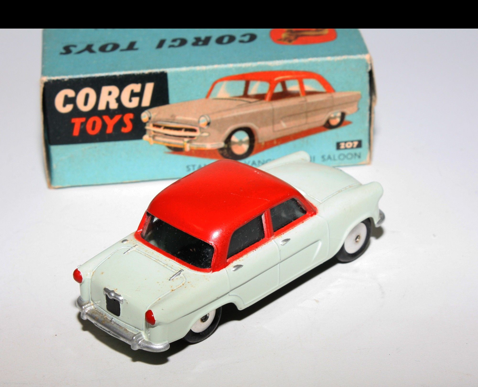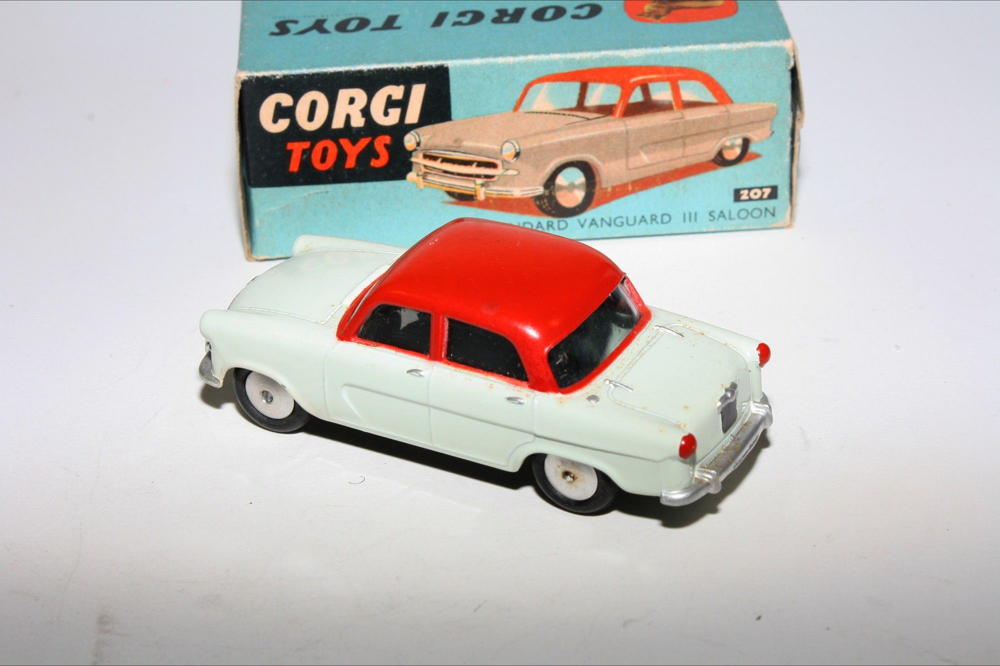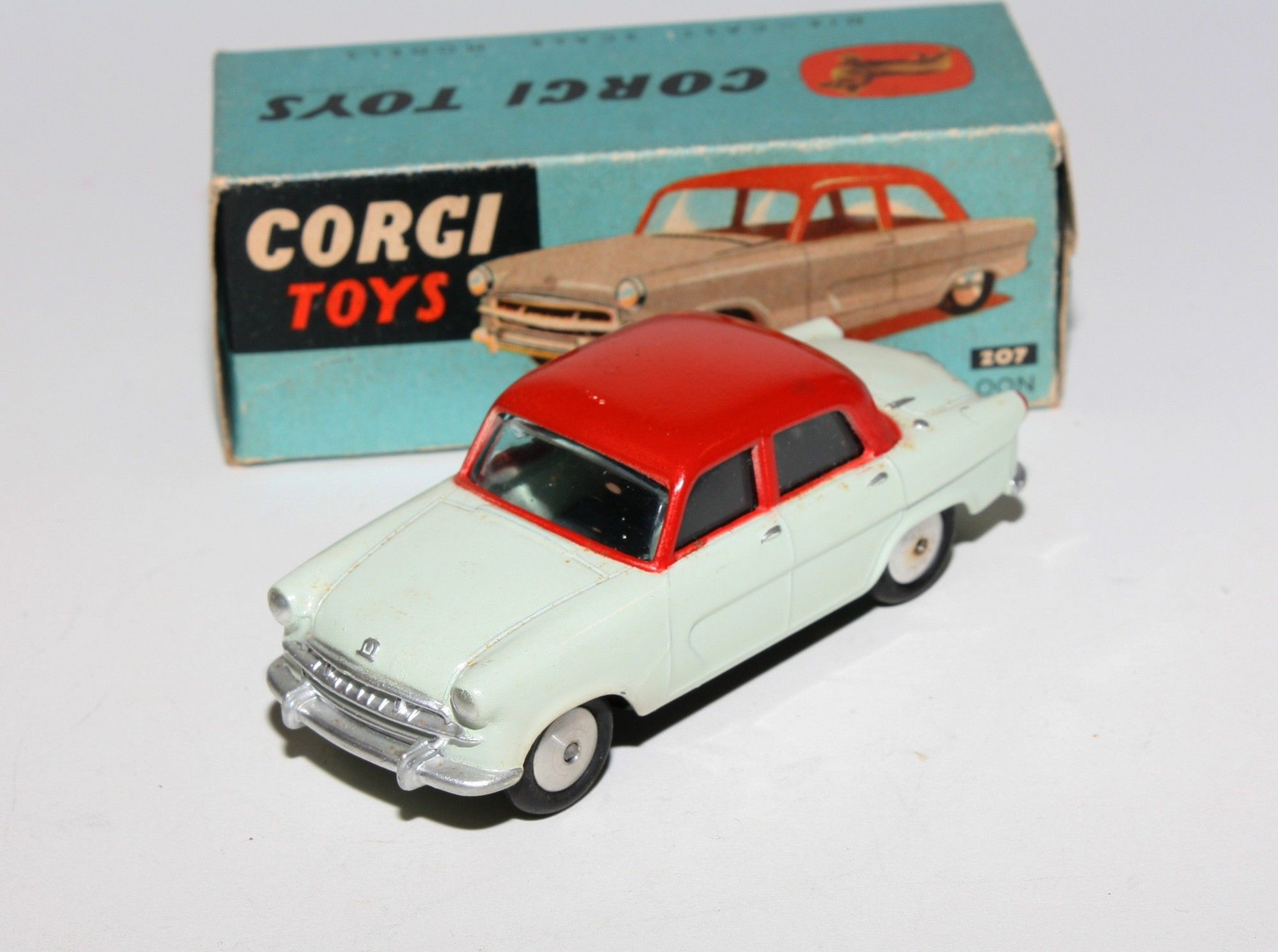 A superb example of this two tone version. Gleaming original red over grey paintwork, very near mint, very small rub to roof and a couple of fleabites, please study the photos for exact condition. Perfect original tyres on smooth hubs, straight free rolling axles, excellent windows. Underside is mint.