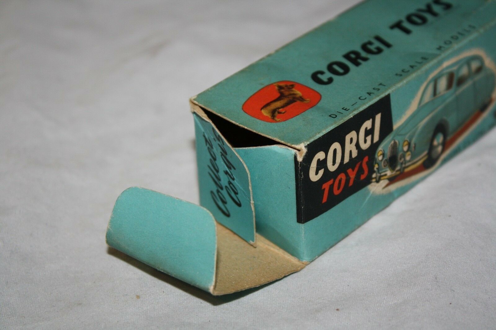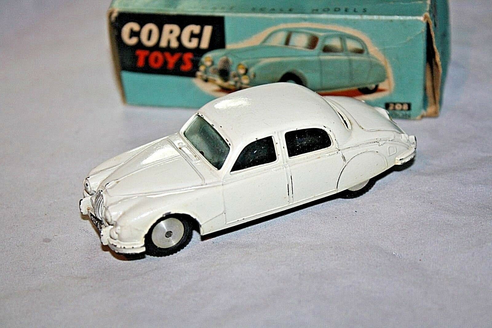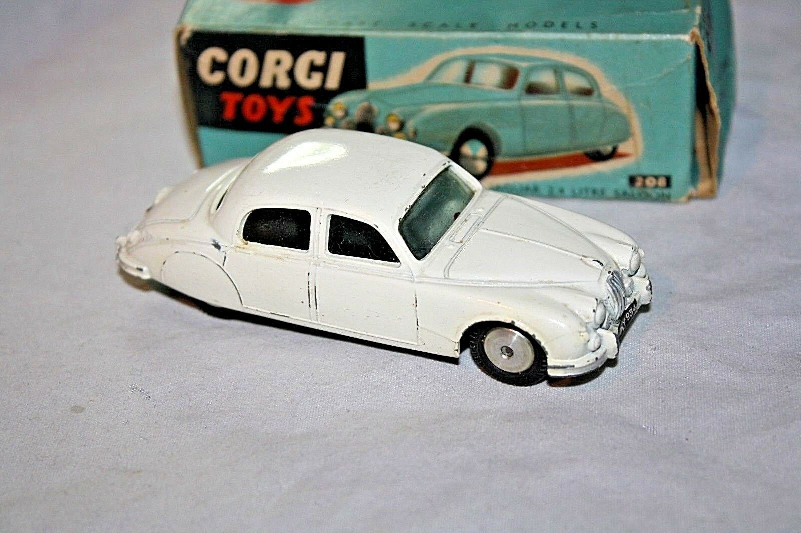 Corgi 208s 2.4 litre Jaguar Saloon Manufactured 1957-1960 A superb example of this beautiful early issue 1950's Corgi model. Excellent paintwork with a few tiny chips and rubs to raised edges, please study the photos for exact condition. Original tyres on smooth hubs, smooth free rolling axles, crystal clear windows, silver detailing, mint tin baseplate. Comes with its original all card blue picture box which is all complete with all flaps attached and in good condition but with some general creasing but mainly on one end flap, a few stains on non picture side. Please study the photos. Any questions, please ask Happy to ship worldwide Combined shipping a pleasure Please take a look at my other Corgi and vintage toy listings