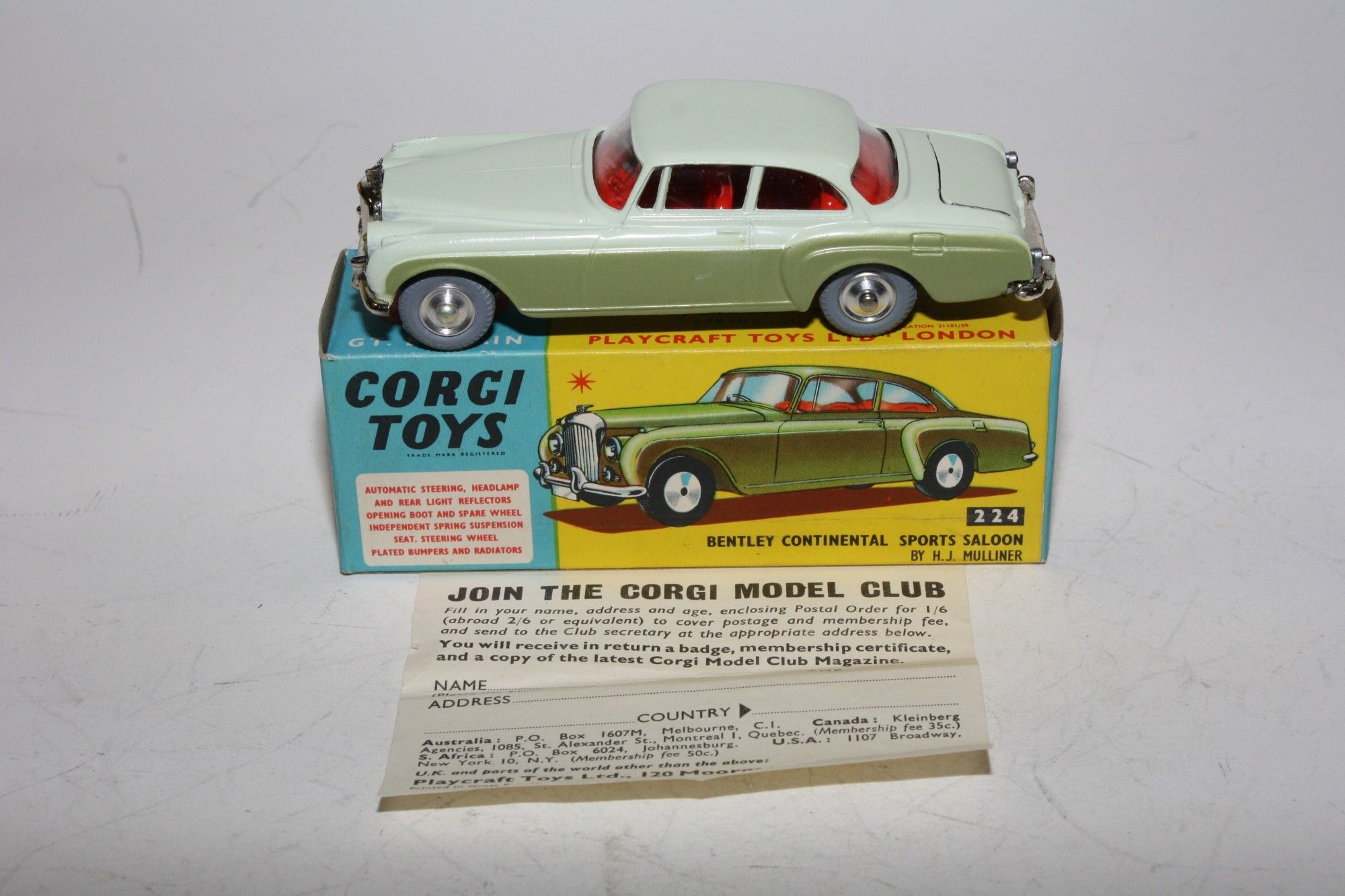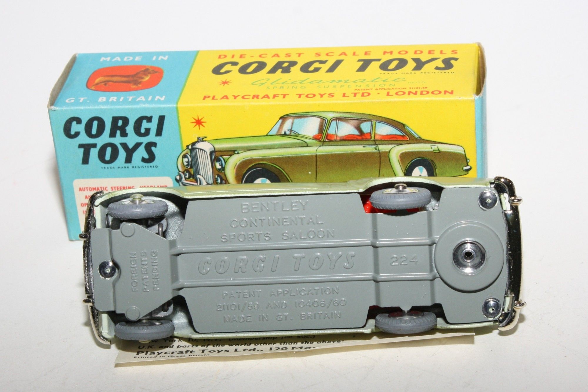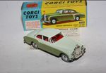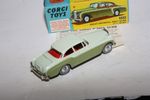 A superb example of this lovely Corgi model. Part of a stunning collection from a client in Italy. Gleaming two tone green paintwork is virtually mint with a fleabite on boot handle, otherwise absolutely as new, please study the photos for exact condition. Perfect original grey tyres including spare in boot on smooth perfect Glidamatic suspension and steering, crystal clear windows, red interior, mascot present, geaming chrome, jewelled lights. Mint grey baseplate. Must be one of the best available.