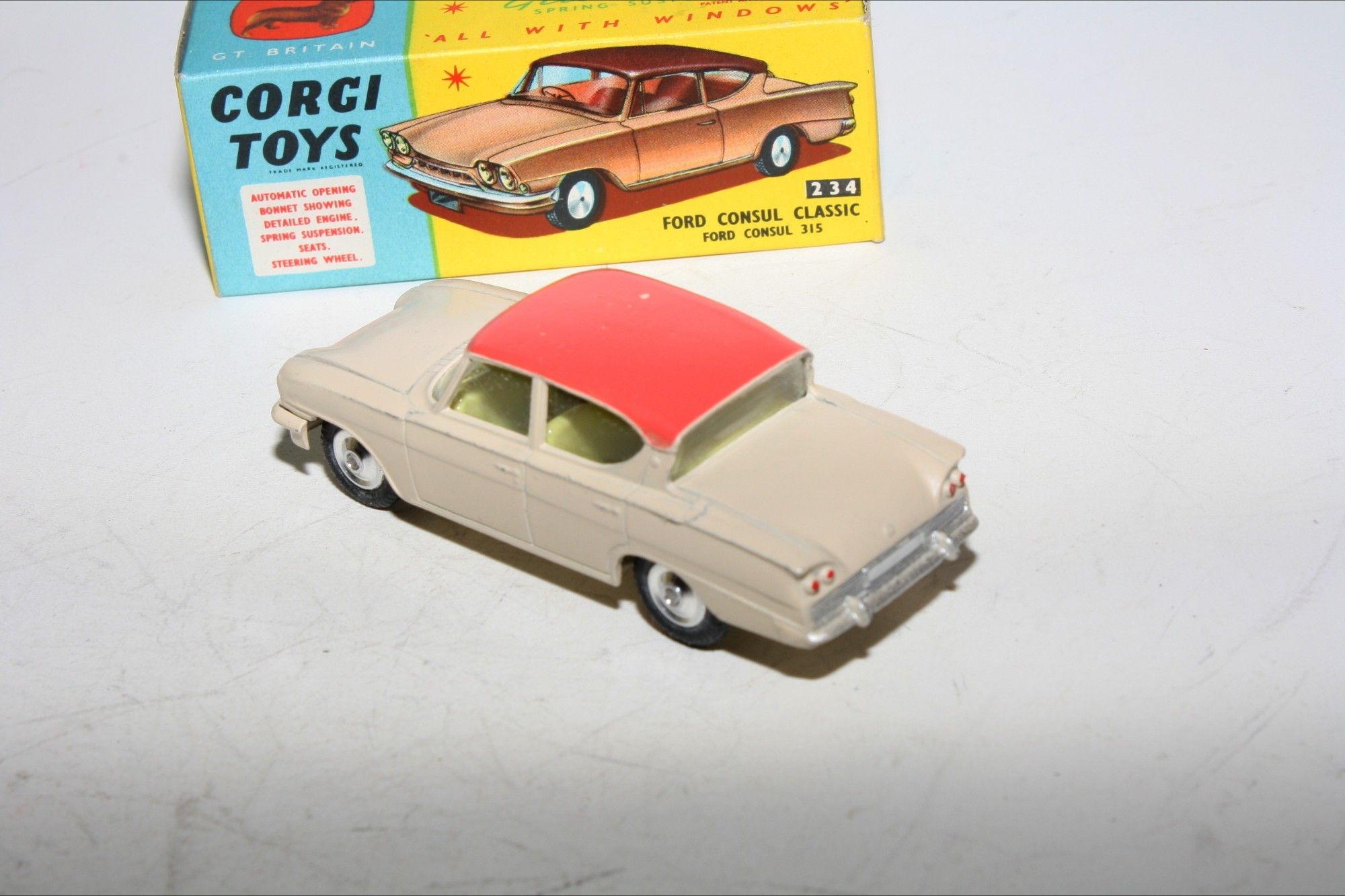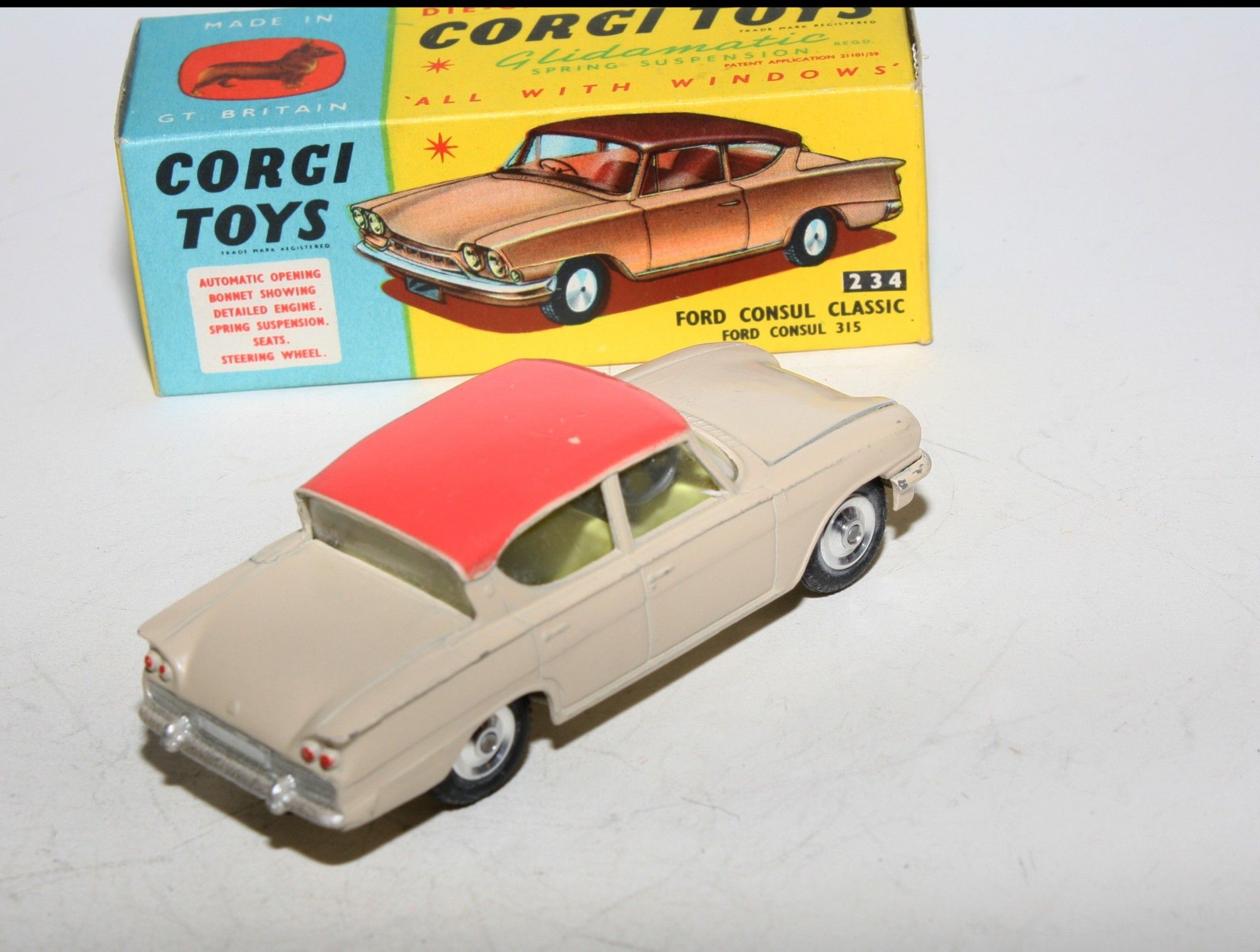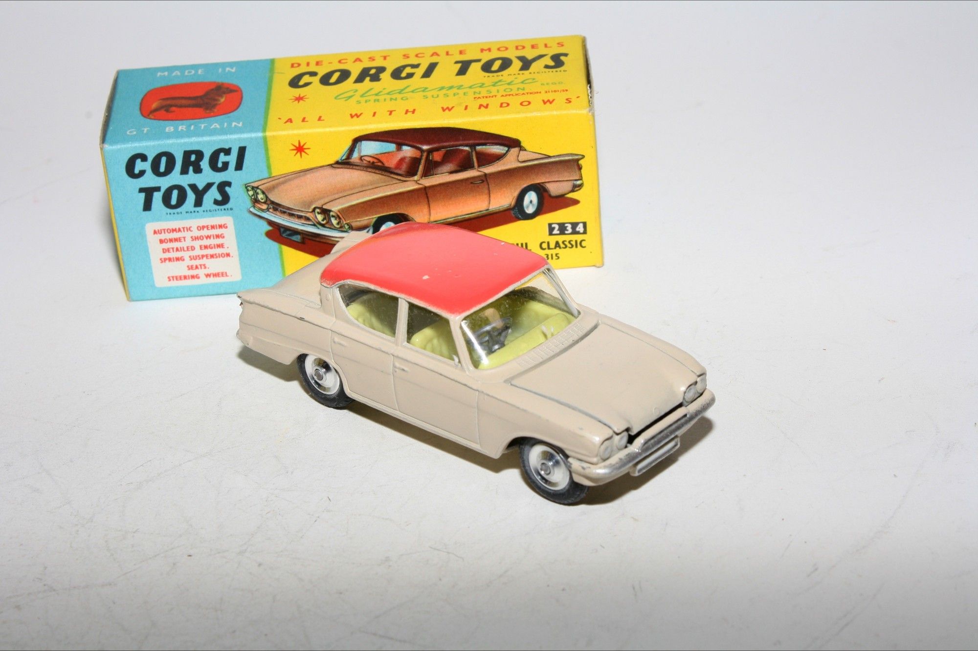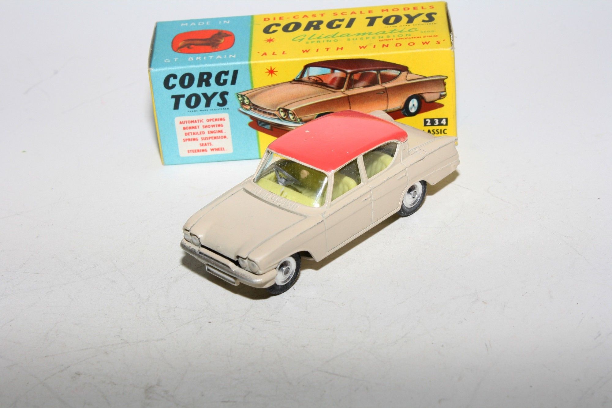 A very nice example of this vintage Corgi. part of a collection recently acquired from a client in Italy Two tone paintwork is excellent , just a tiny pinhead sized nice on roof and some fleabites, please study the photos for exact condition. All original good tyres on spun hubs, strong suspension, crystal clear windows and lemon interior, silver detailing. Mint underside.