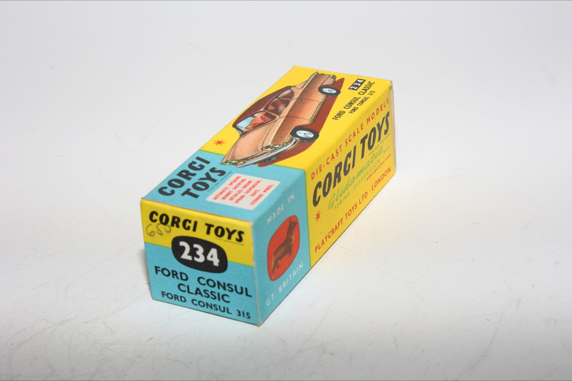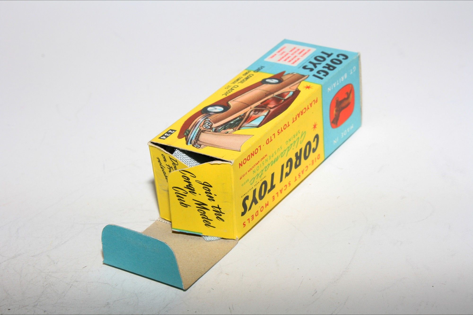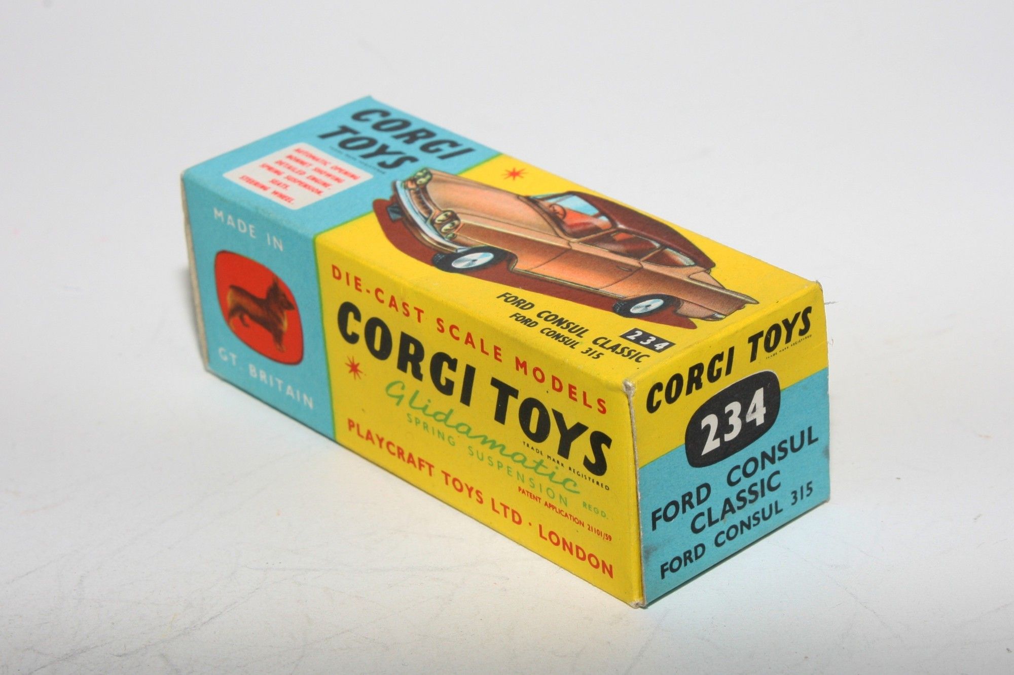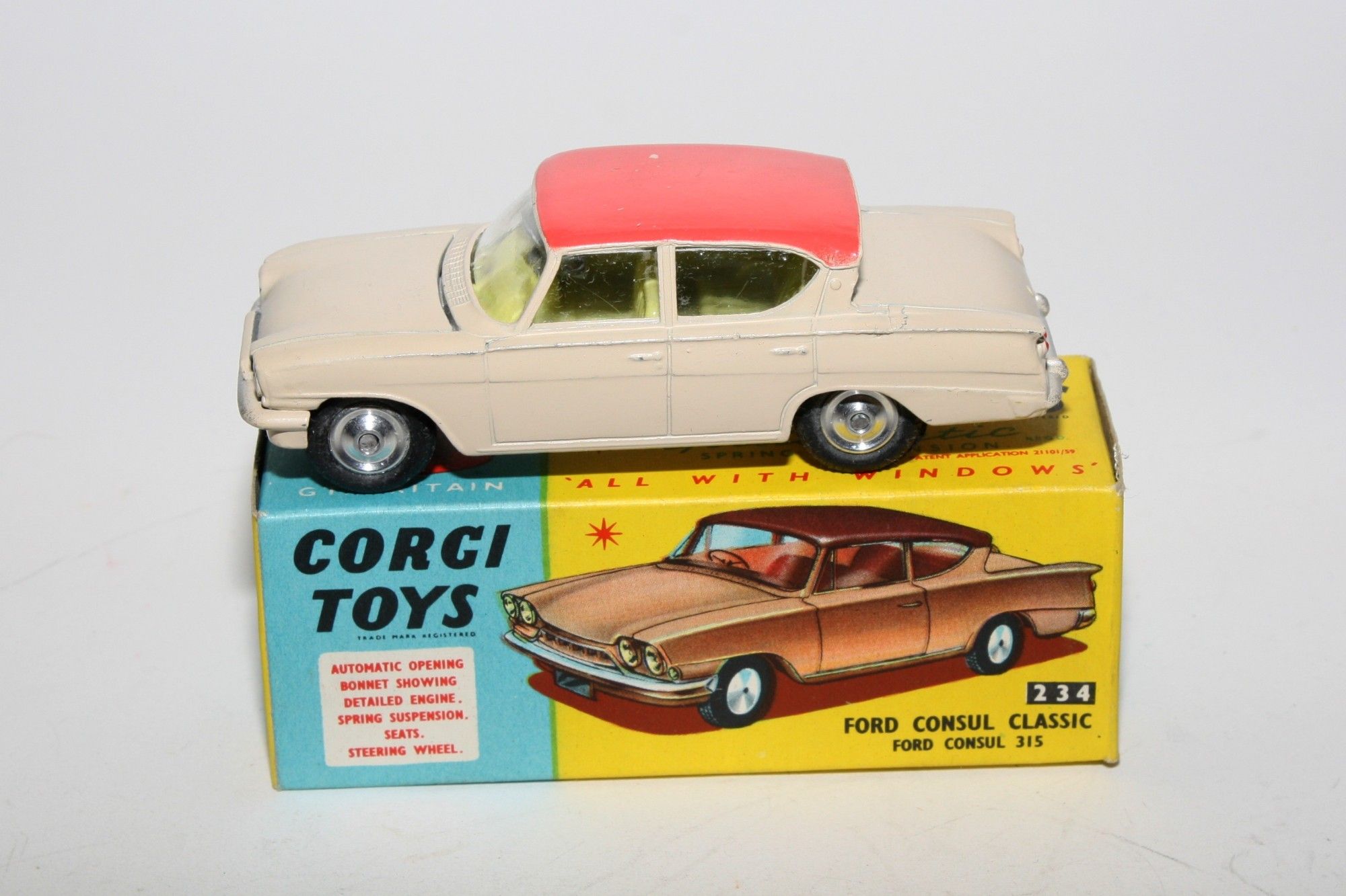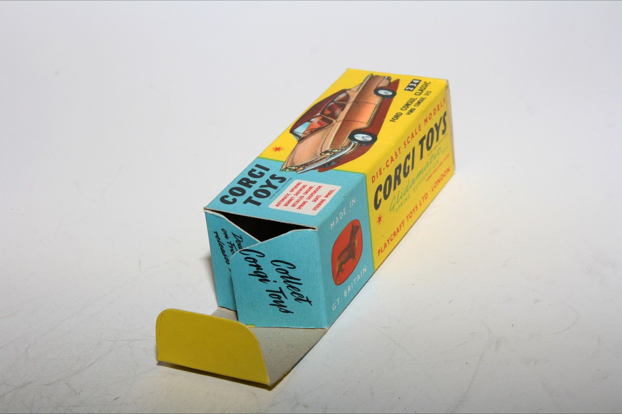 A very nice example of this vintage Corgi. part of a collection recently acquired from a client in Italy Two tone paintwork is excellent , just a tiny pinhead sized nice on roof and some fleabites, please study the photos for exact condition. All original good tyres on spun hubs, strong suspension, crystal clear windows and lemon interior, silver detailing. Mint underside.