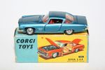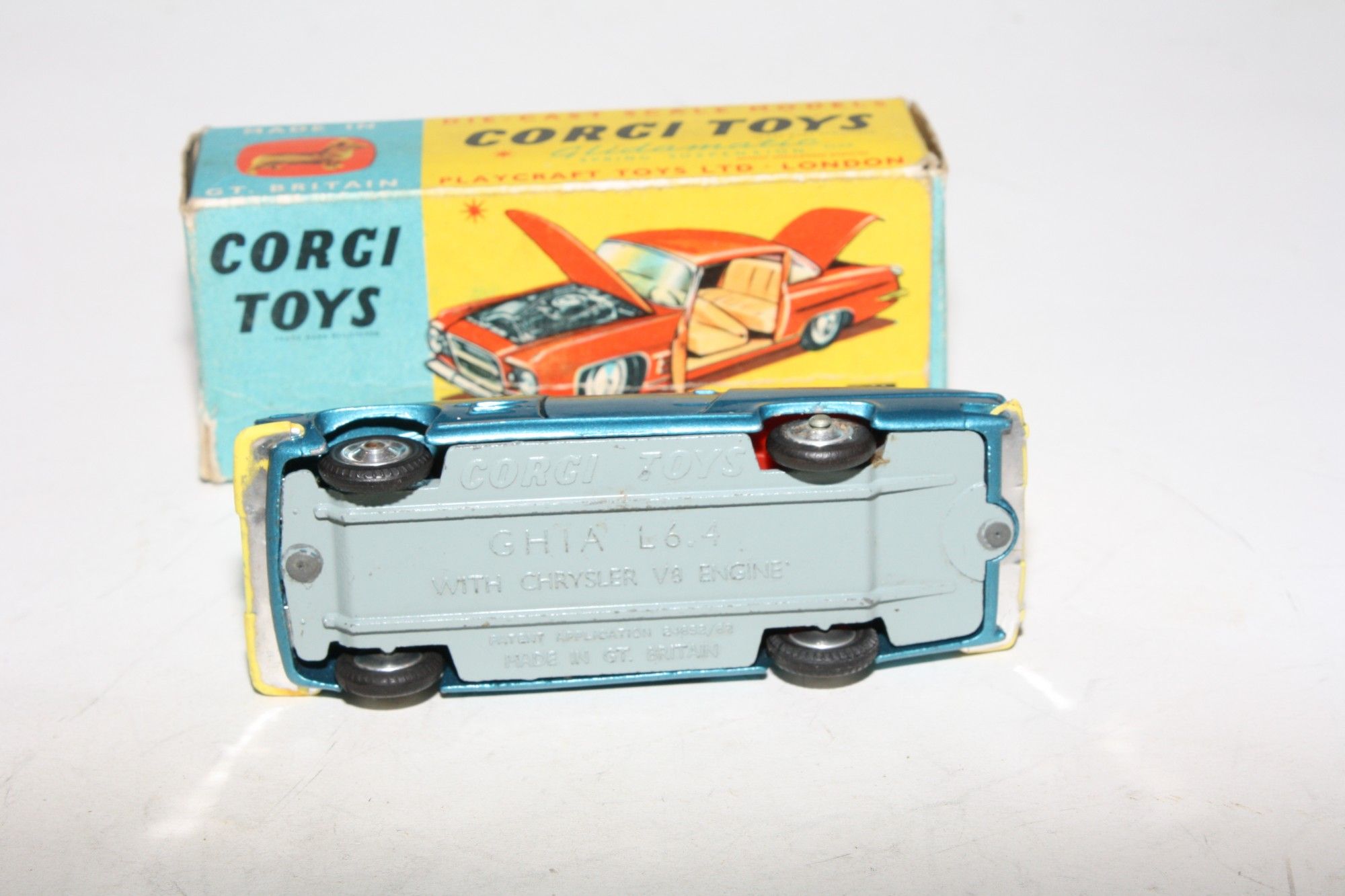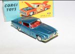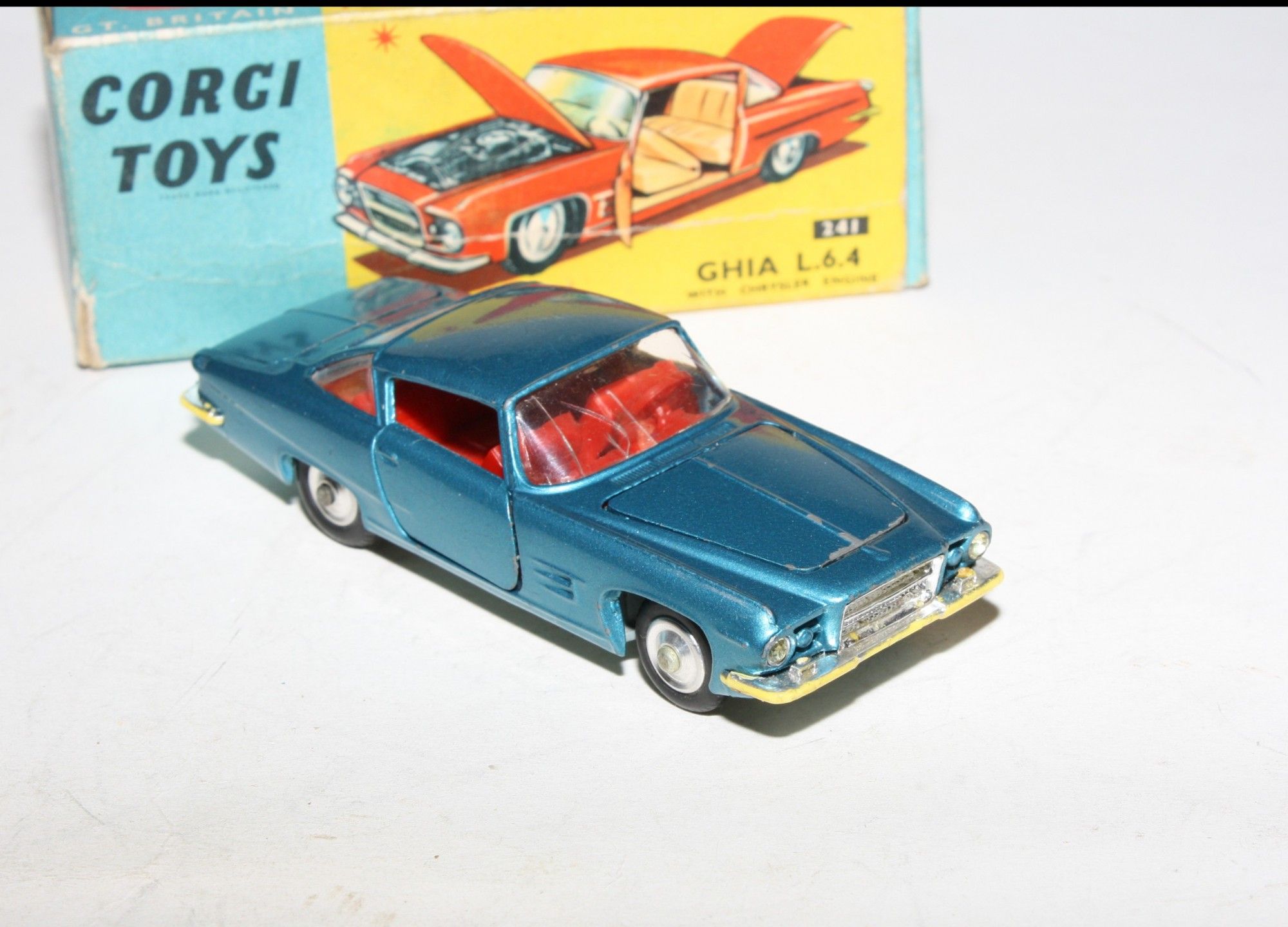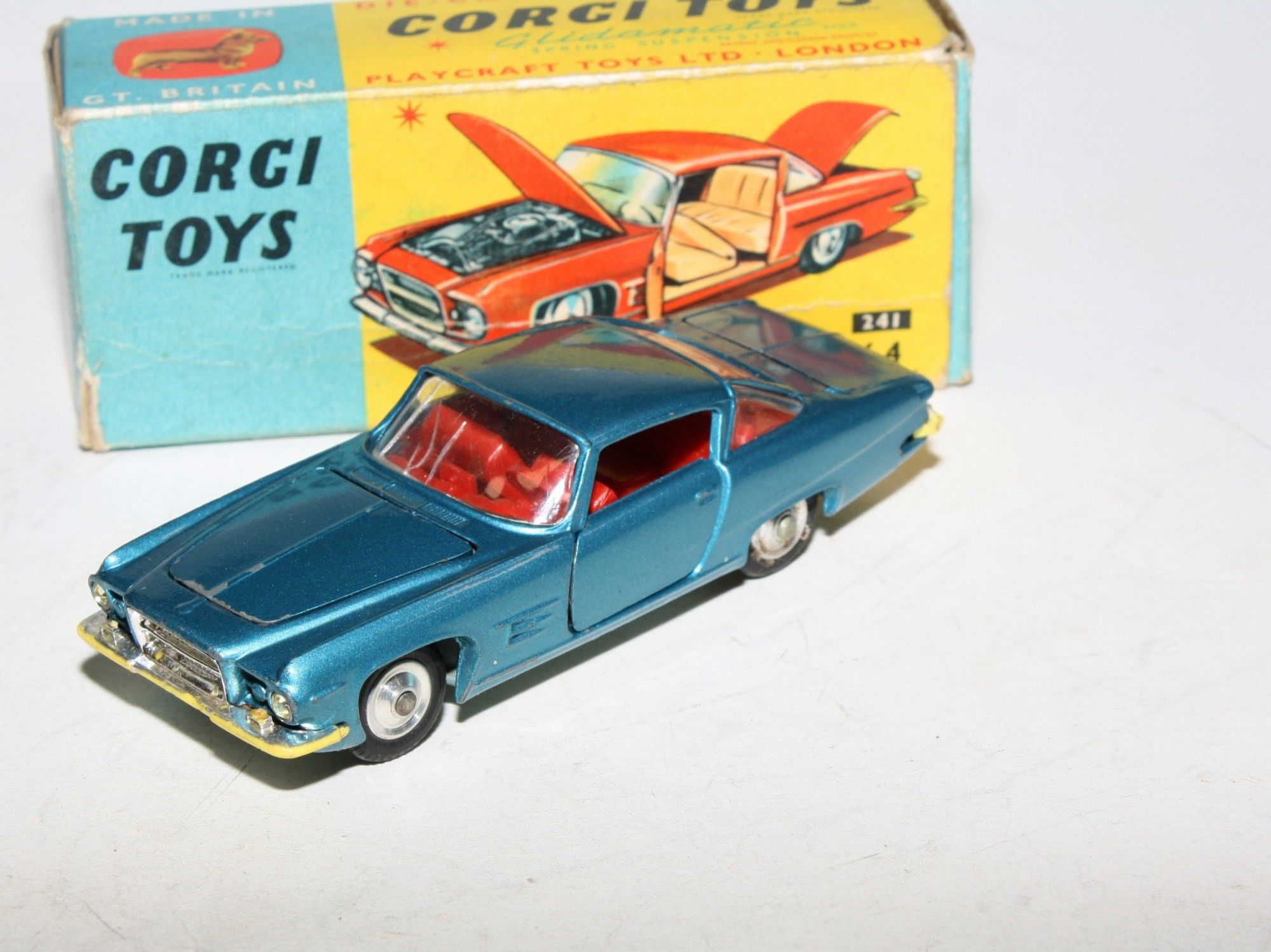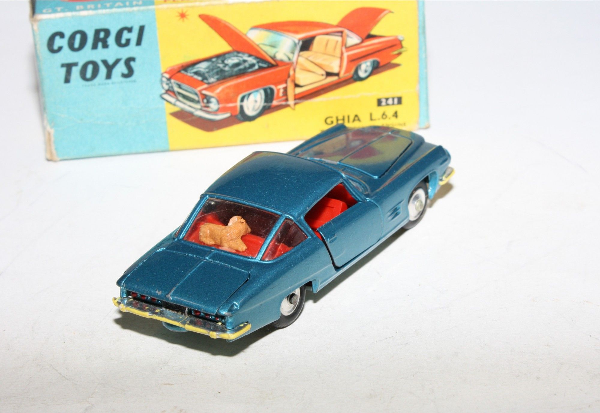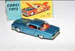 A nice example of this Corgi model. Gleaming metallic paintwork is very good, some light wear, mainly to bonnet edge, please study the photos for exact condition. All original tyres on spun hubs, all suspension perfect, good windows but cracks to windscreen, red interior, chrome loss to bumpers front and back, jewelled lights, dog figure present. Underside mint.