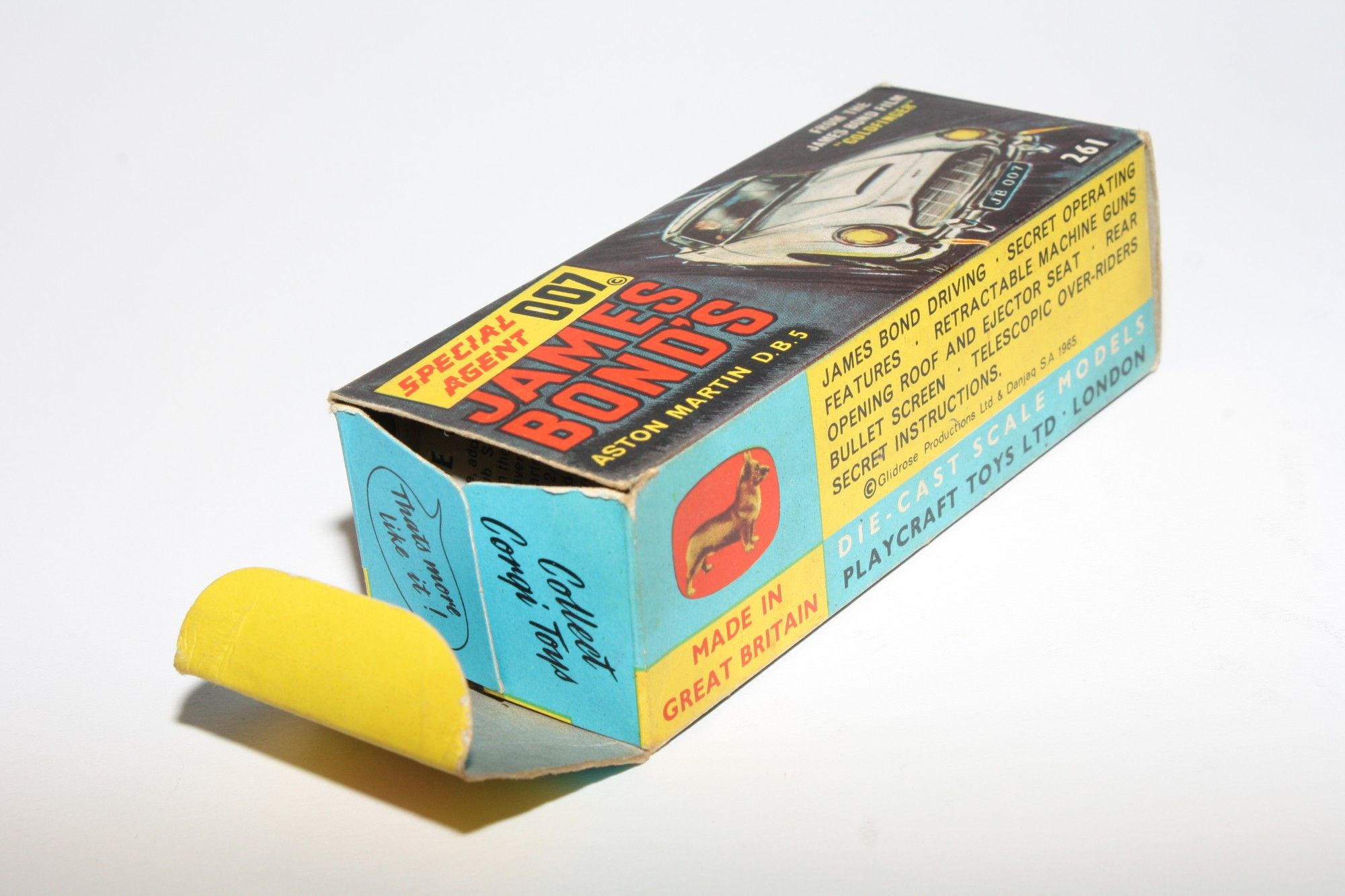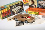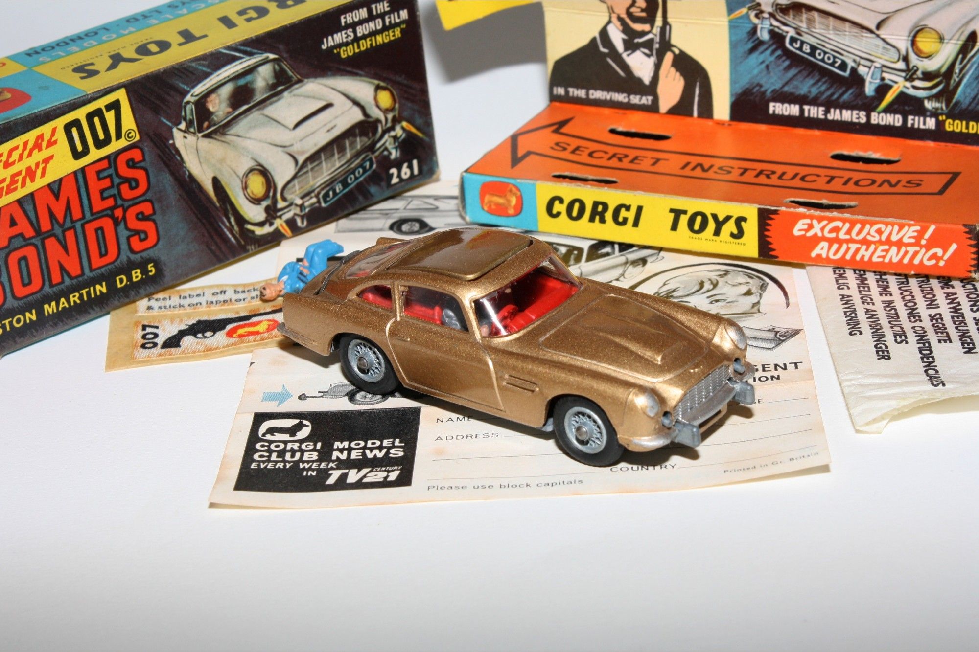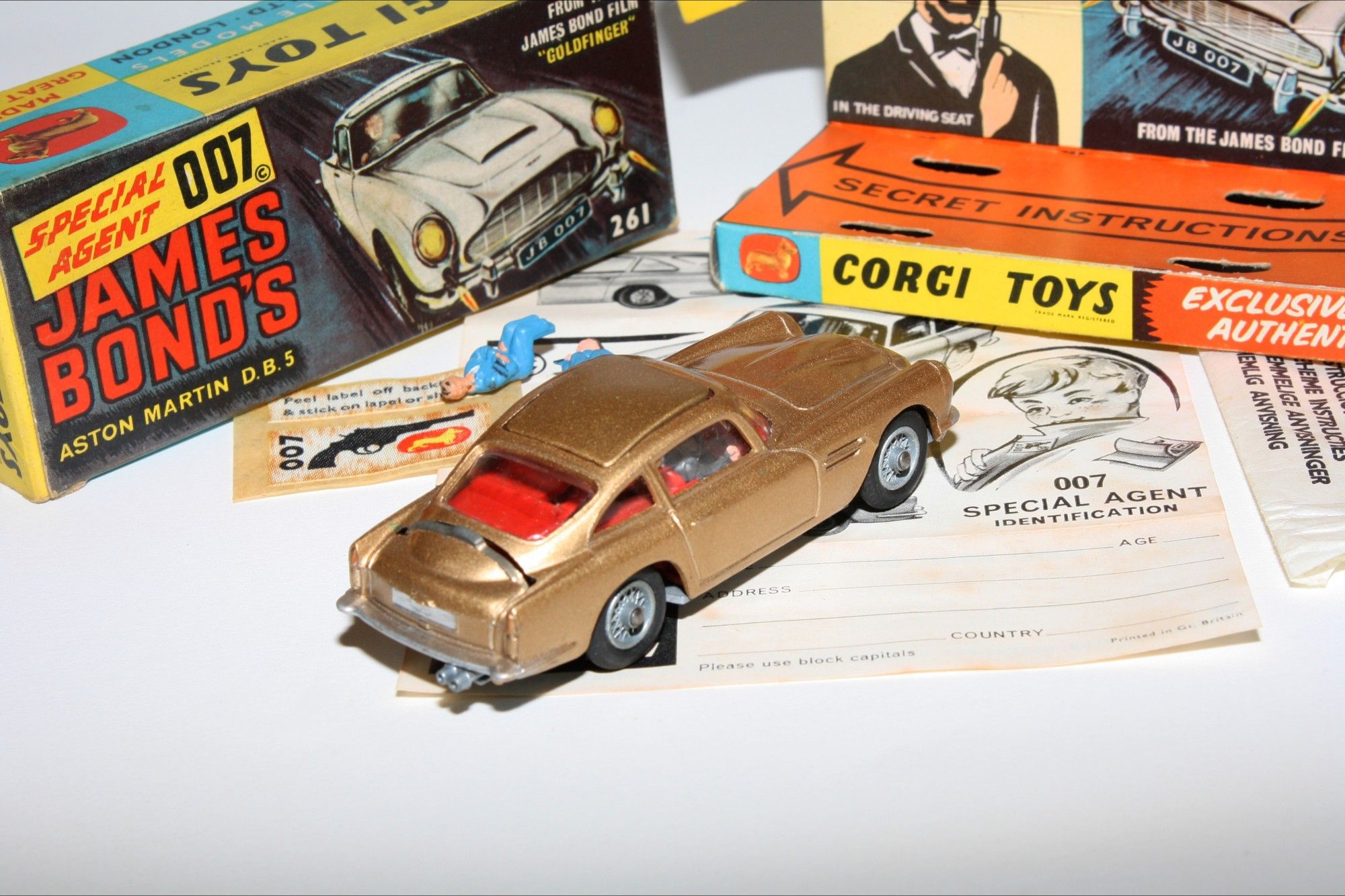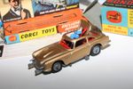 A beautiful example of this iconic Corgi James Bond model. Gleaming gold paintwork is virtually mint, a fleabite mark to drivers door, please study the photos for exact condition. All original tyres and spoked hubs, suspension excellent. Clear windows and perfect interior with James Bond figure present. All features work really well, machine guns, rear shield and ejector seat all good. Roof sits nice and flush and clicks nicely into position. Base plate mint.