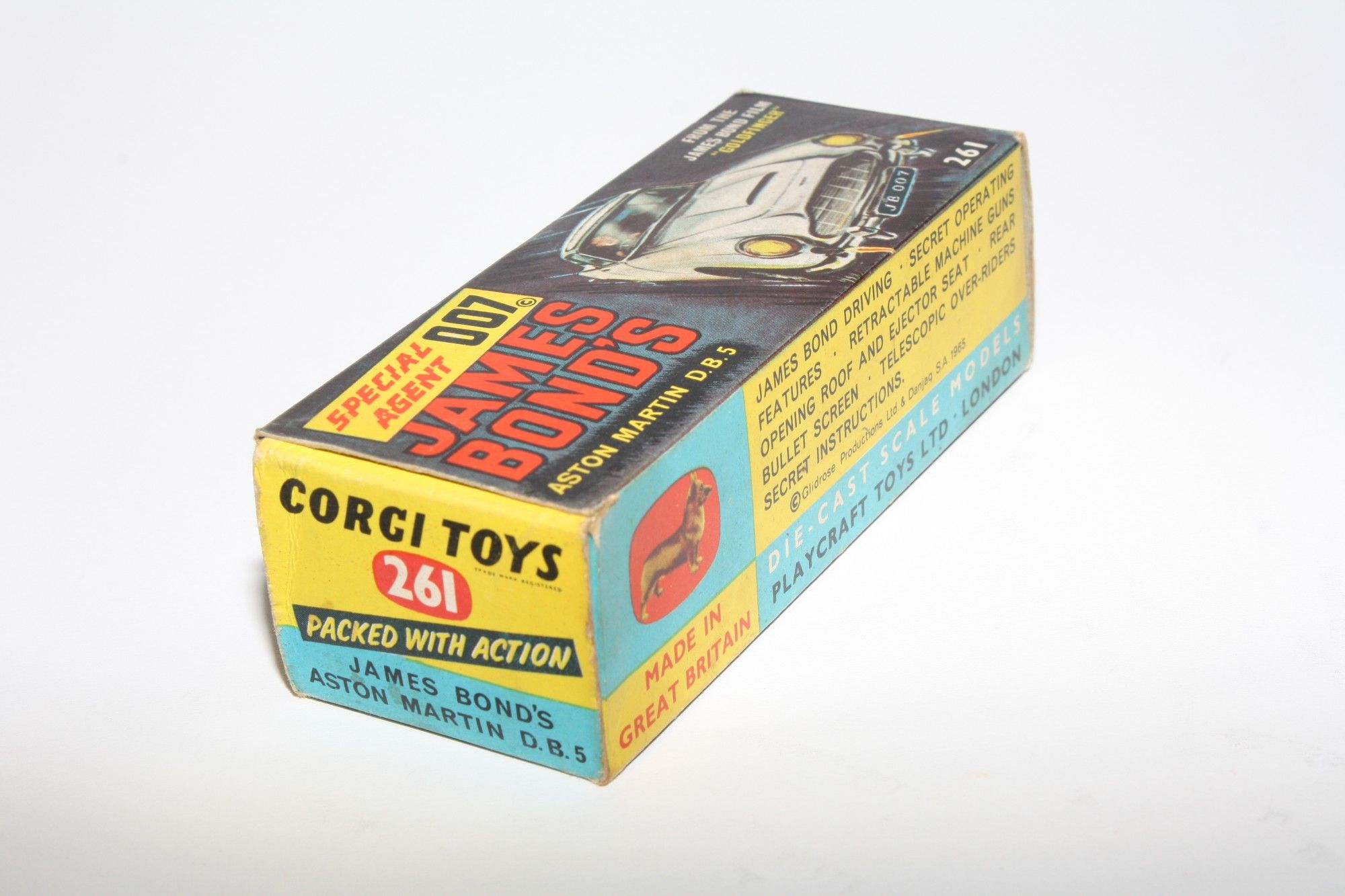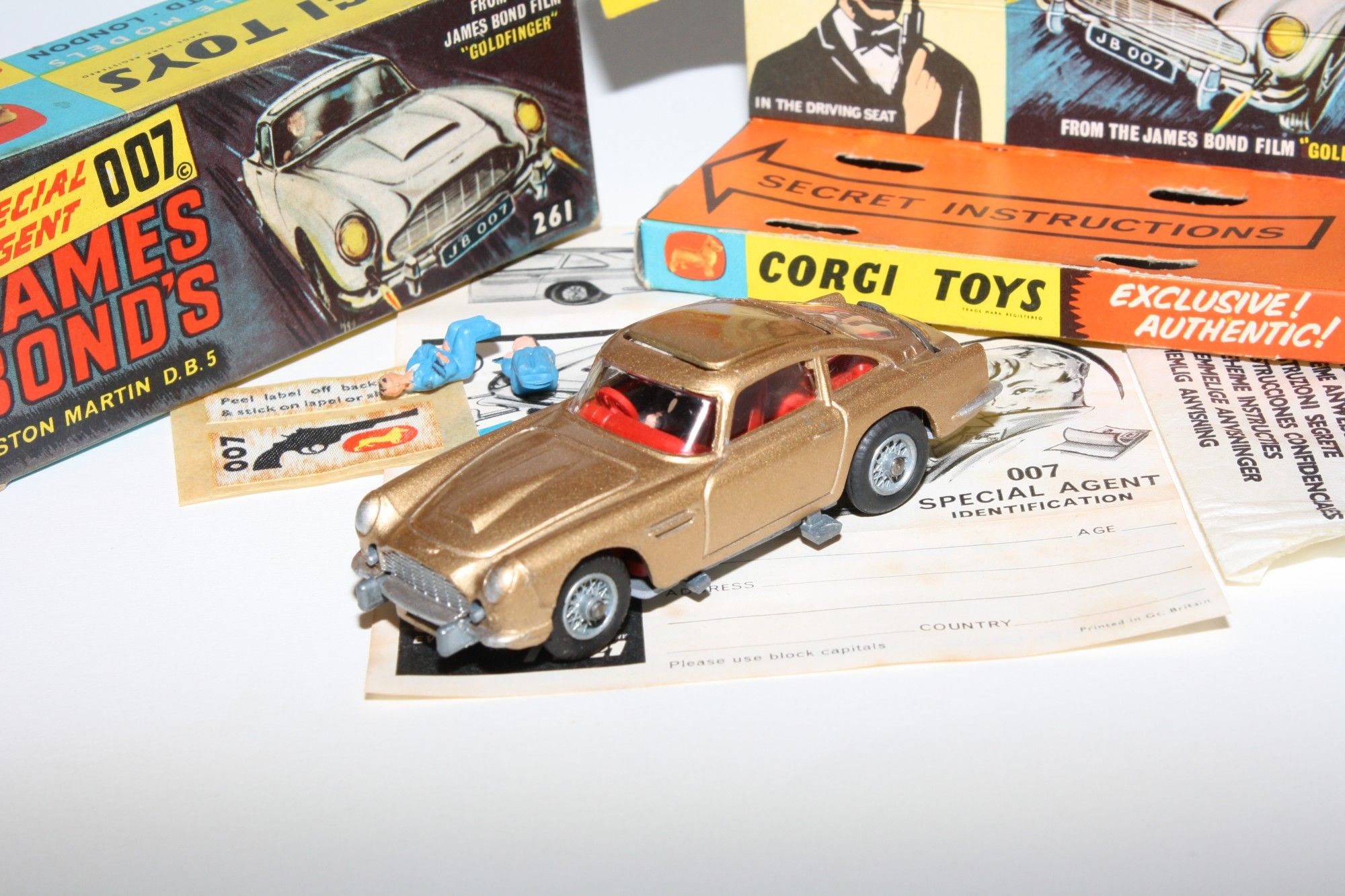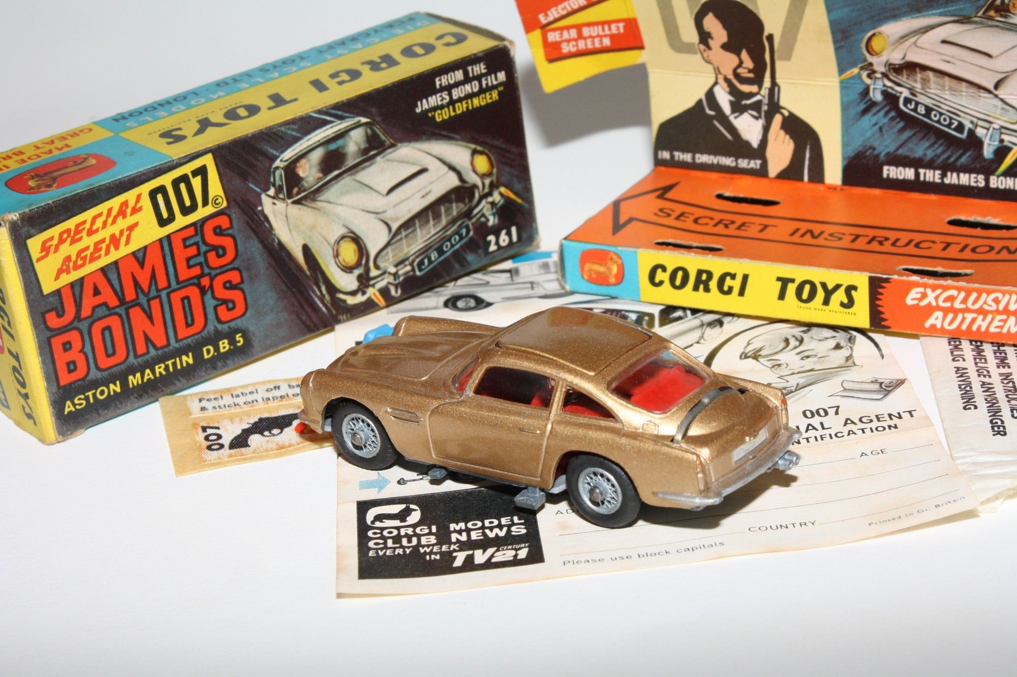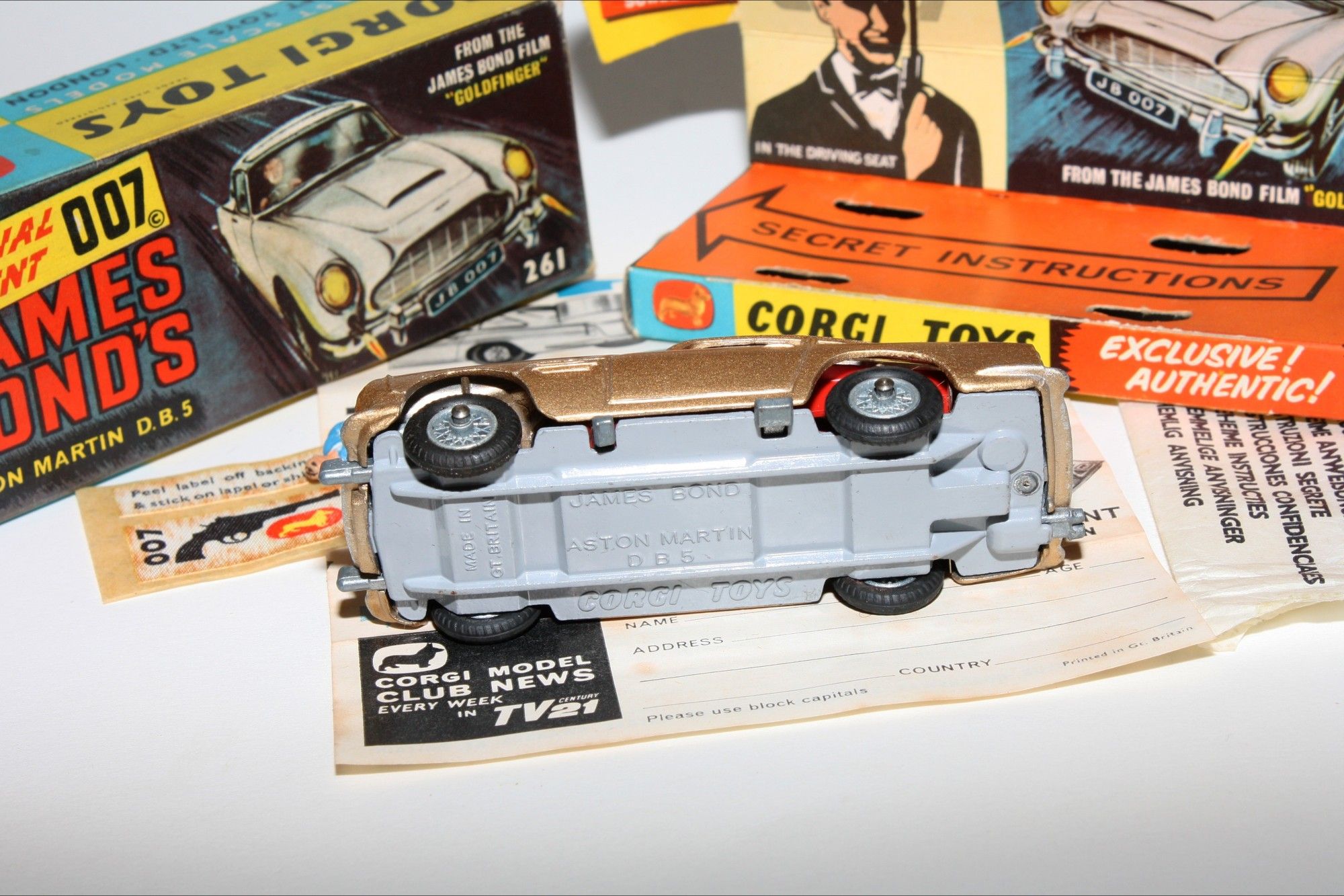 A beautiful example of this iconic Corgi James Bond model. Gleaming gold paintwork is virtually mint, a fleabite mark to drivers door, please study the photos for exact condition. All original tyres and spoked hubs, suspension excellent. Clear windows and perfect interior with James Bond figure present. All features work really well, machine guns, rear shield and ejector seat all good. Roof sits nice and flush and clicks nicely into position. Base plate mint.