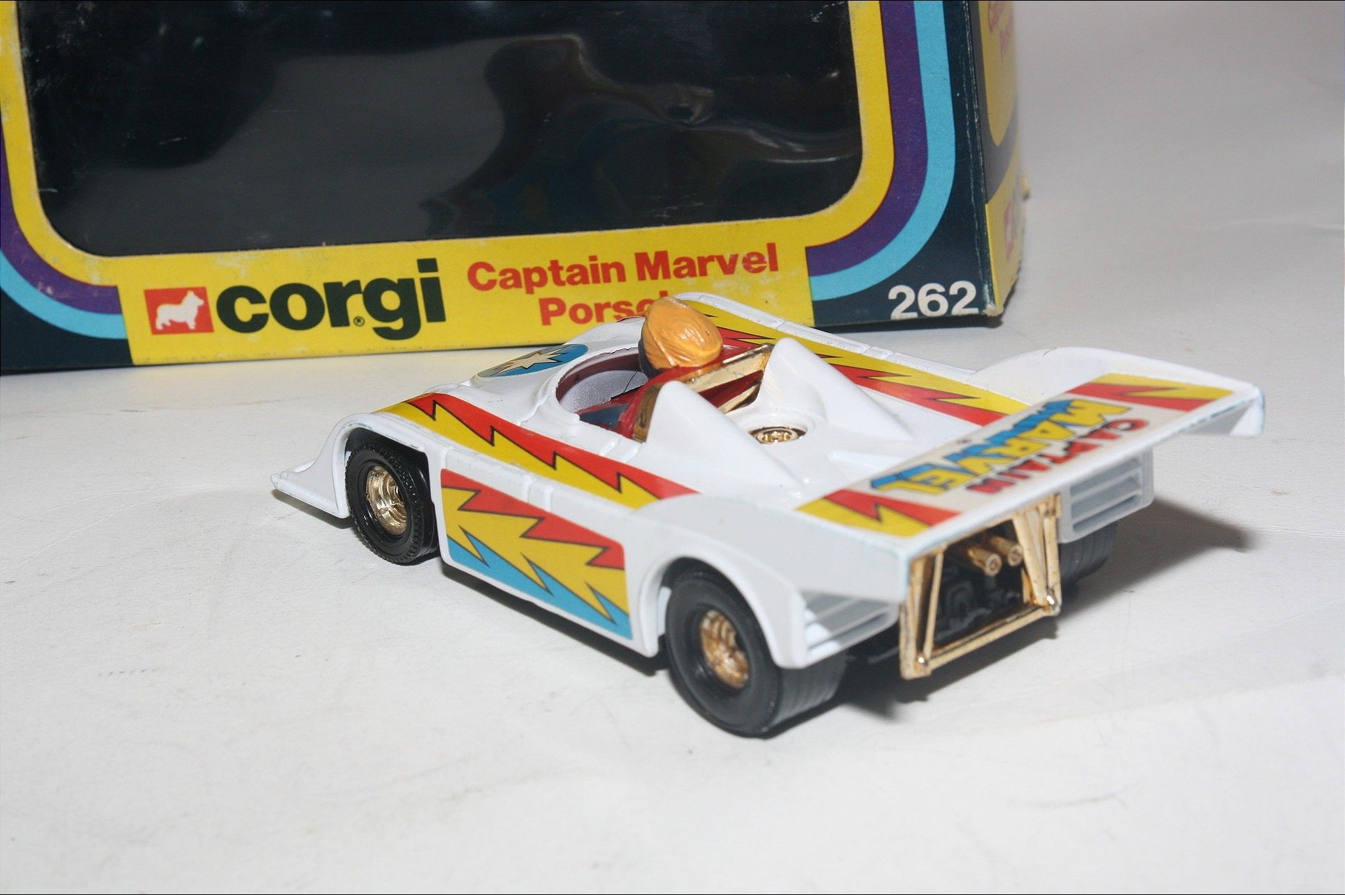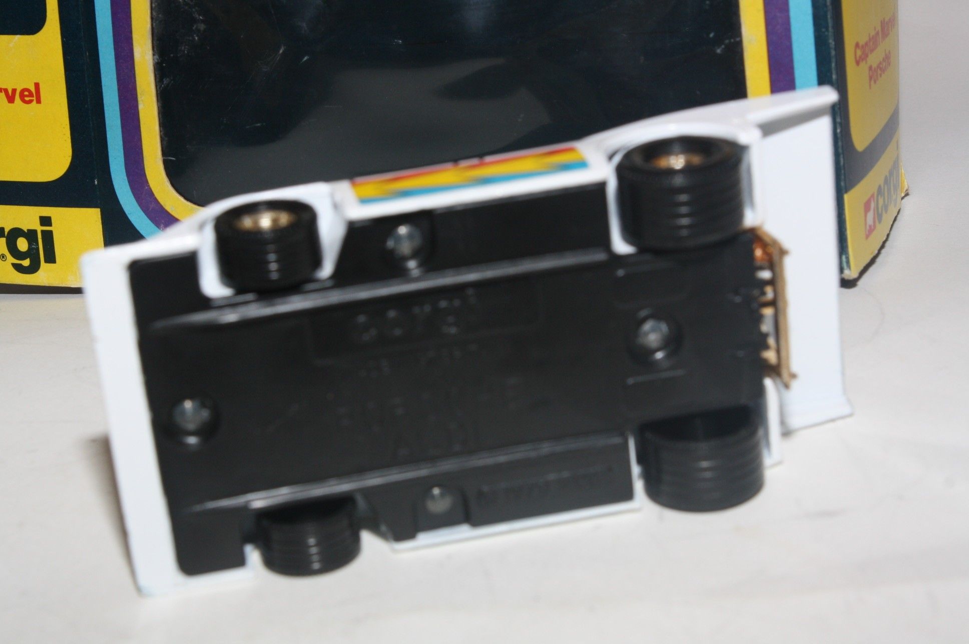 A superb example of this Corgi model from Marvel Comics and films. Gleaming original white paintwork is mint, please study the high resolution photos for exact condition. Perfect wheels with gold hubs, figure, stickers and gold. Underside mint.