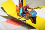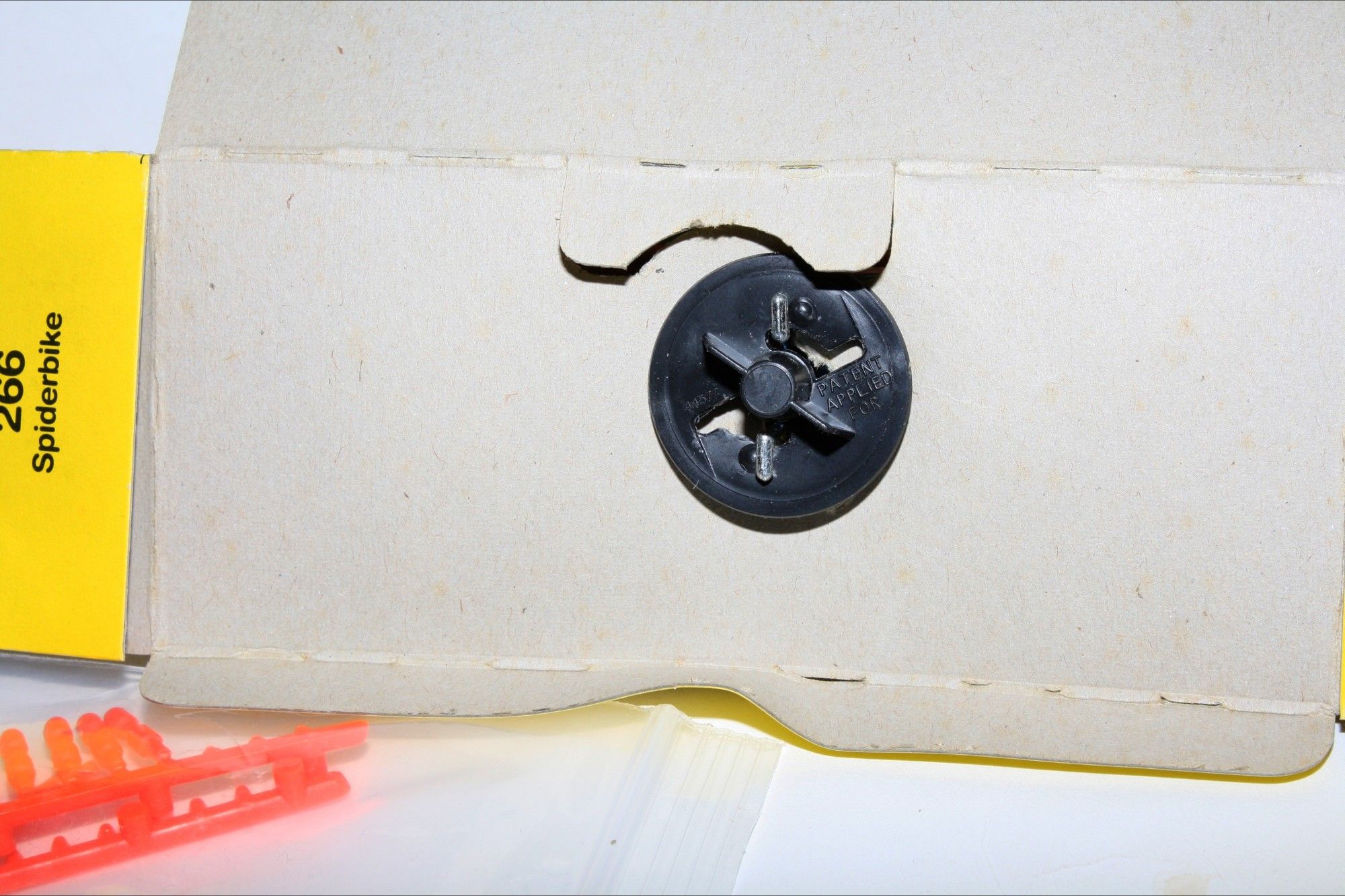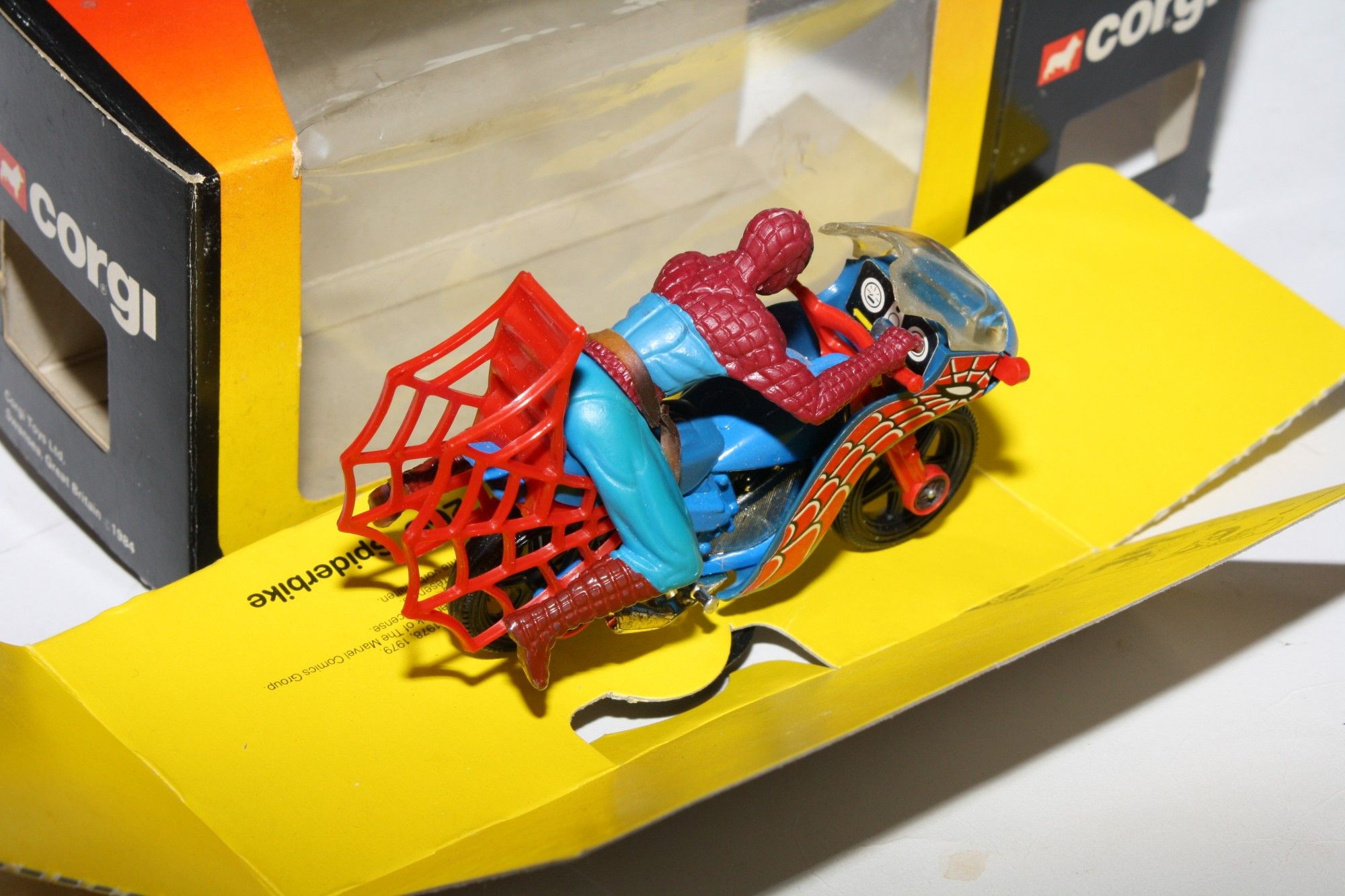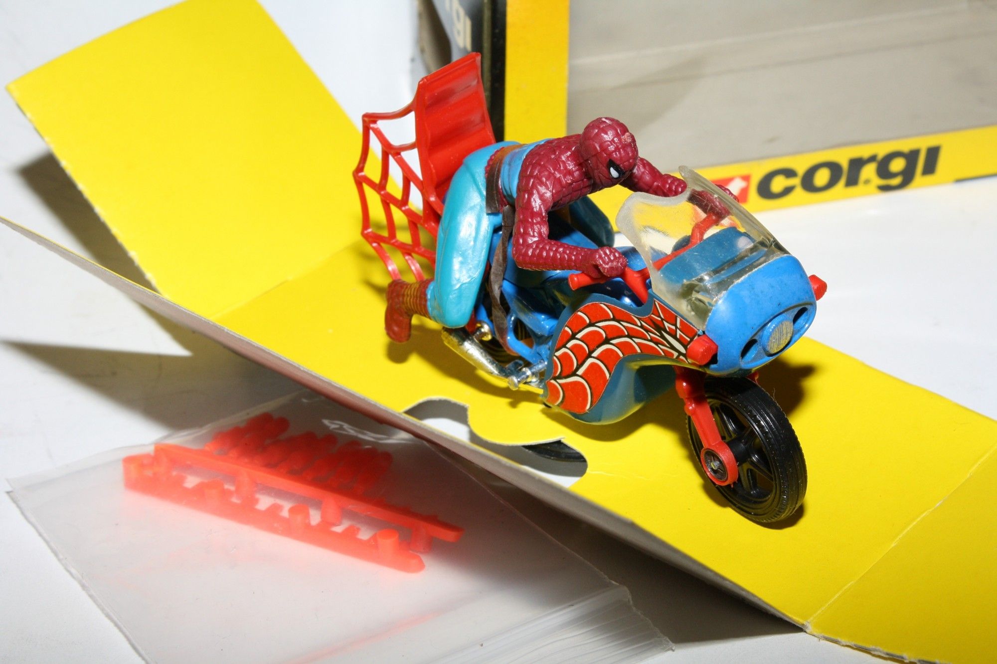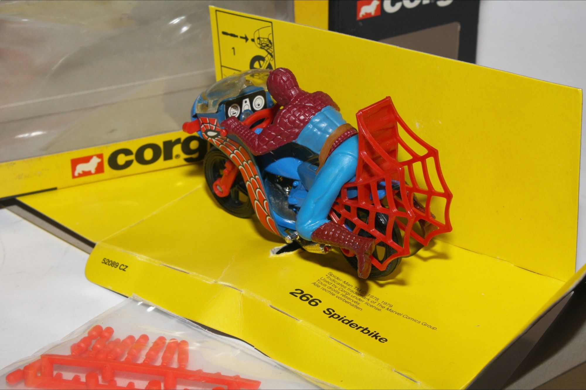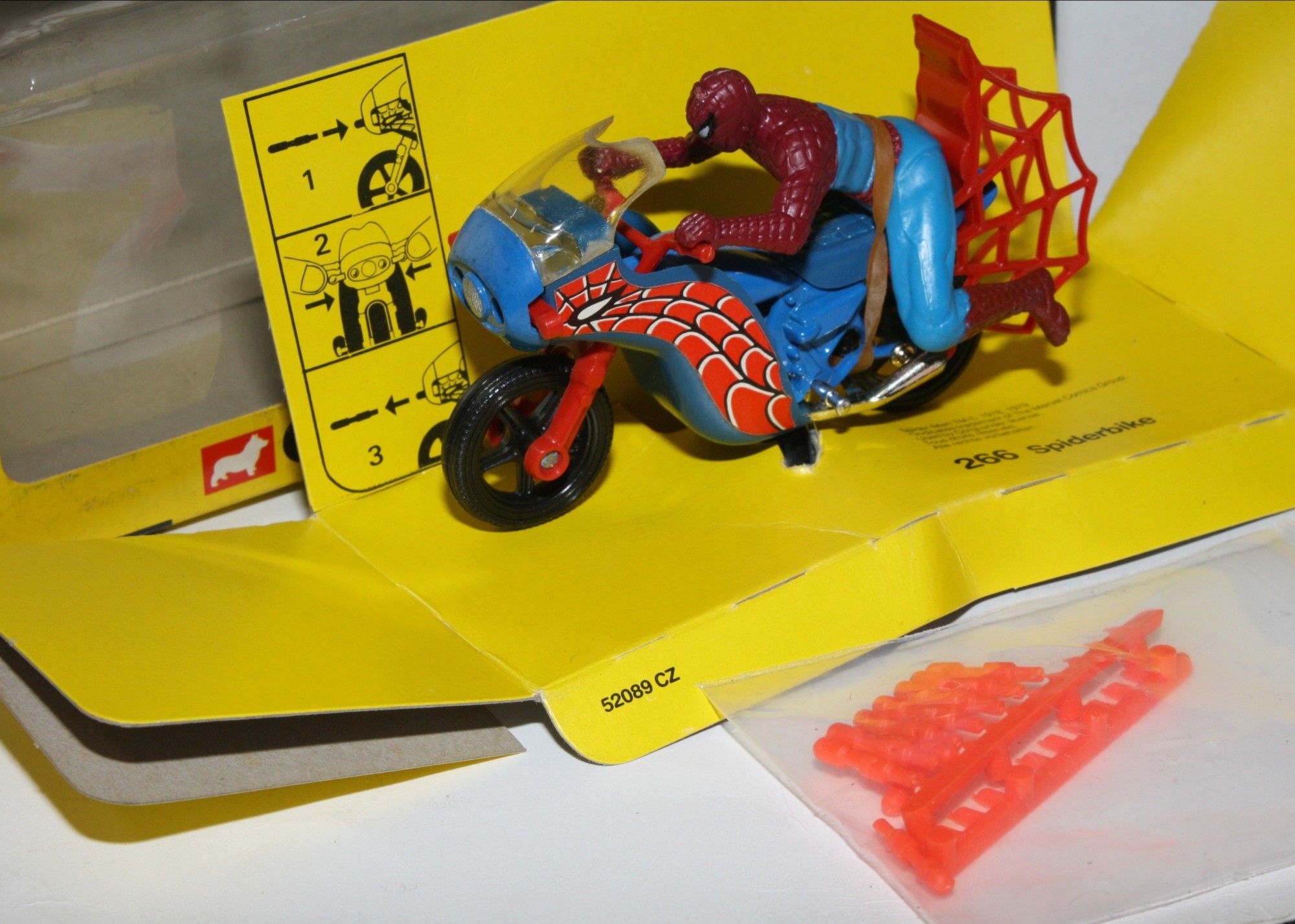 A superb  example of this hard to find  last issue Spiderbike model. Paintwork is original and mint, never played with, please study the photos for exact condition. Perfect black plastic wheels, fairing, stickers, windscreen, handlebars and Spiderman figure. Bike stand intact and red plastic web seat back, powerful missile launchers and comes with 10 original missiles and sprue (some detached). model is held by correct retainer to plinth (figure 's original elastic band present but perished). Underside perfect.