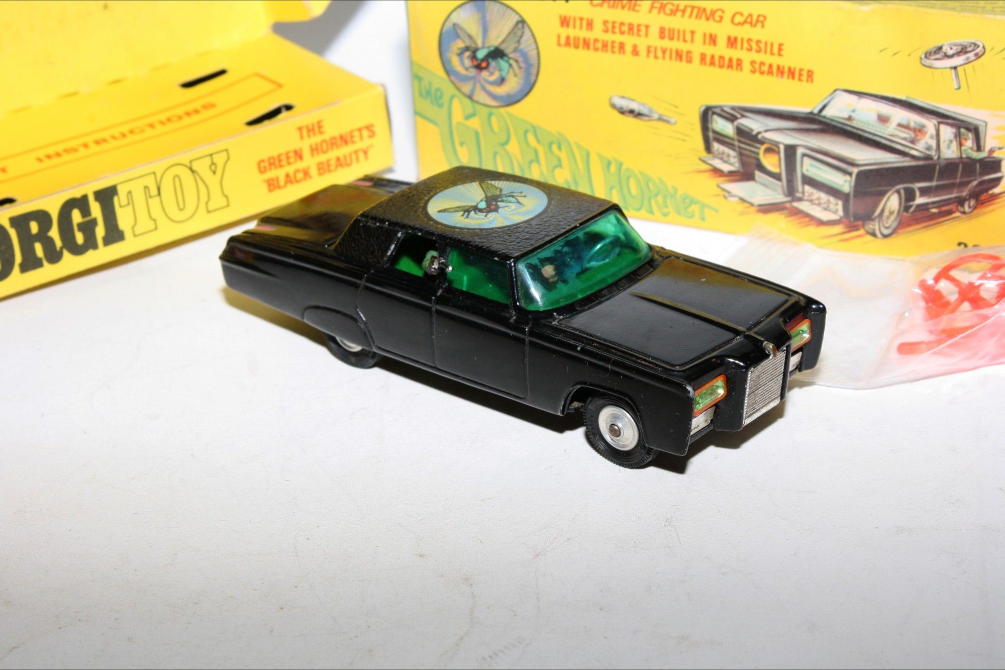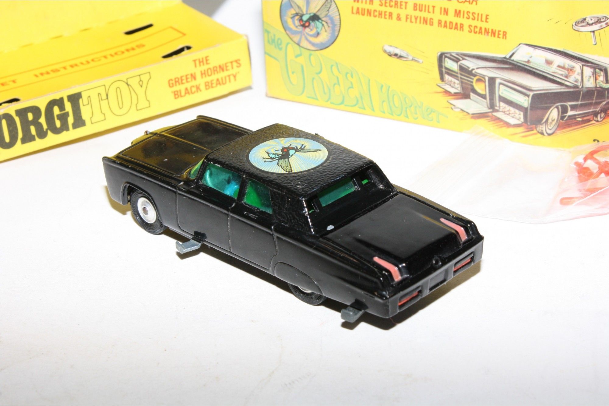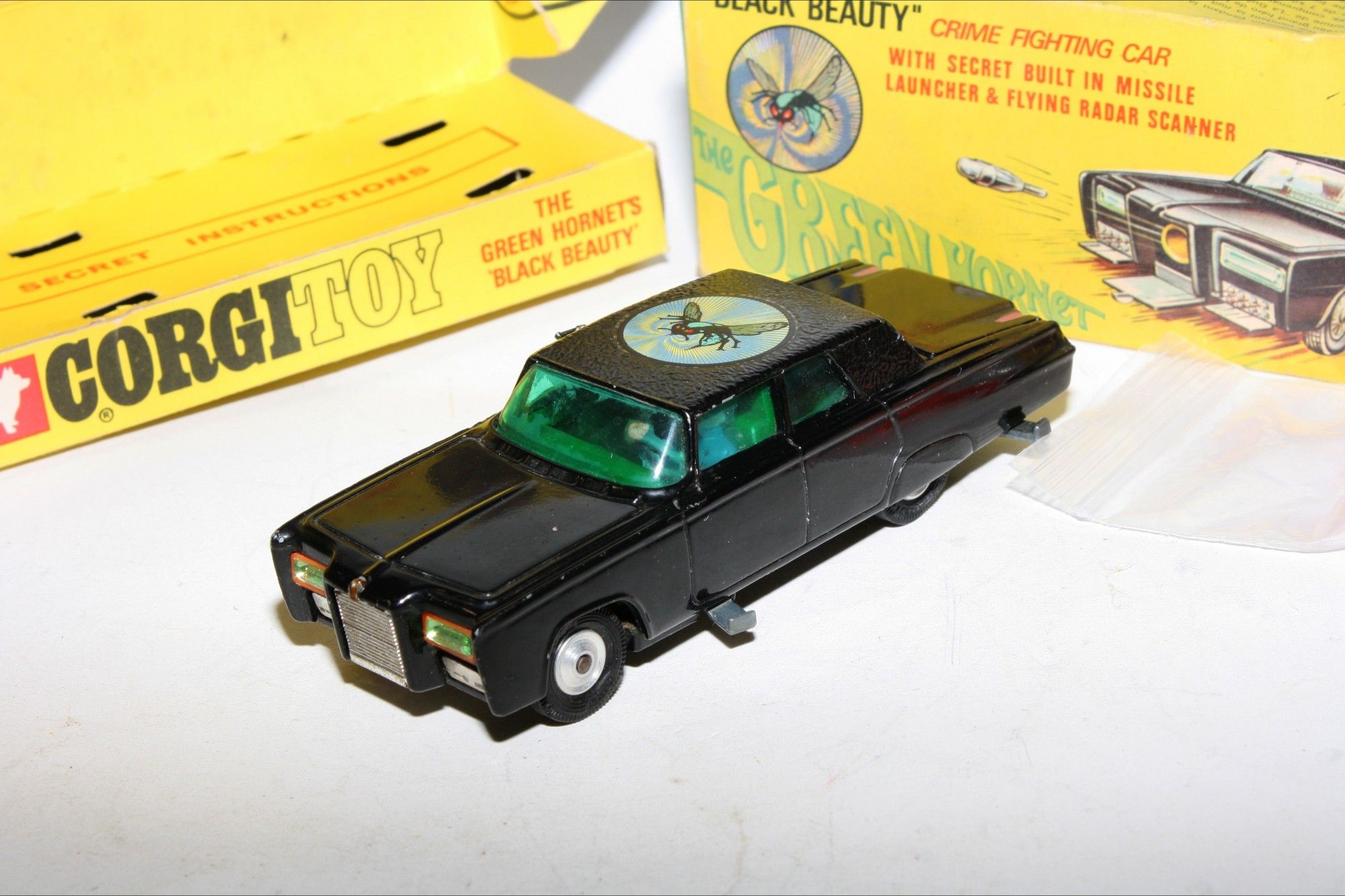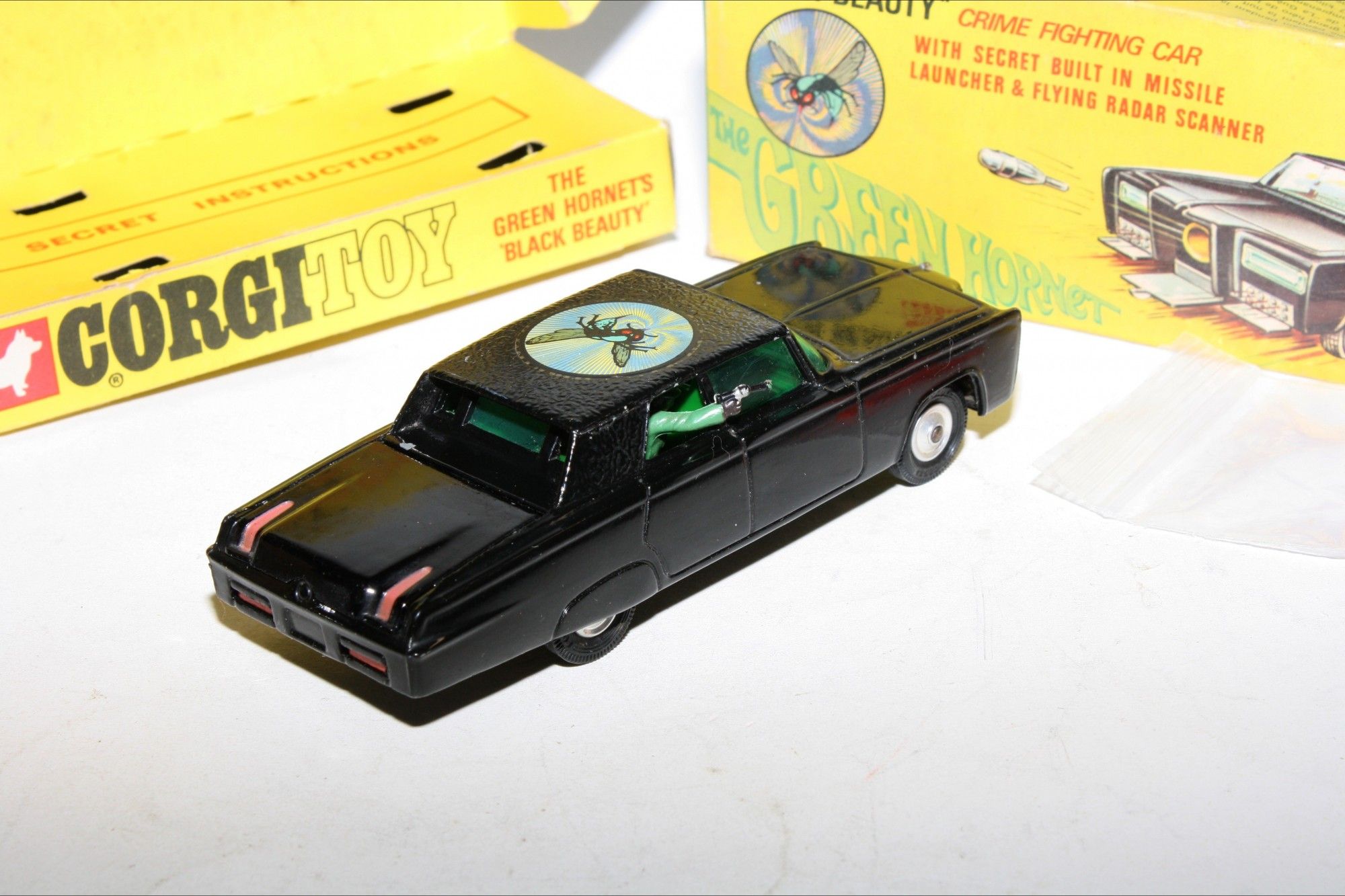 A superb example of this iconic Black Beauty model from the 1960's TV series The Green Hornet. Gleaming gloss black paintwork is excellent with a few small chips, please study the photos for exact condition. All original tyres on spun hubs, all windows, interior figures are perfect, original roof decal is mint, jewelled headlights, built in missile launcher and flying radar scanner features are working, excellent underside.