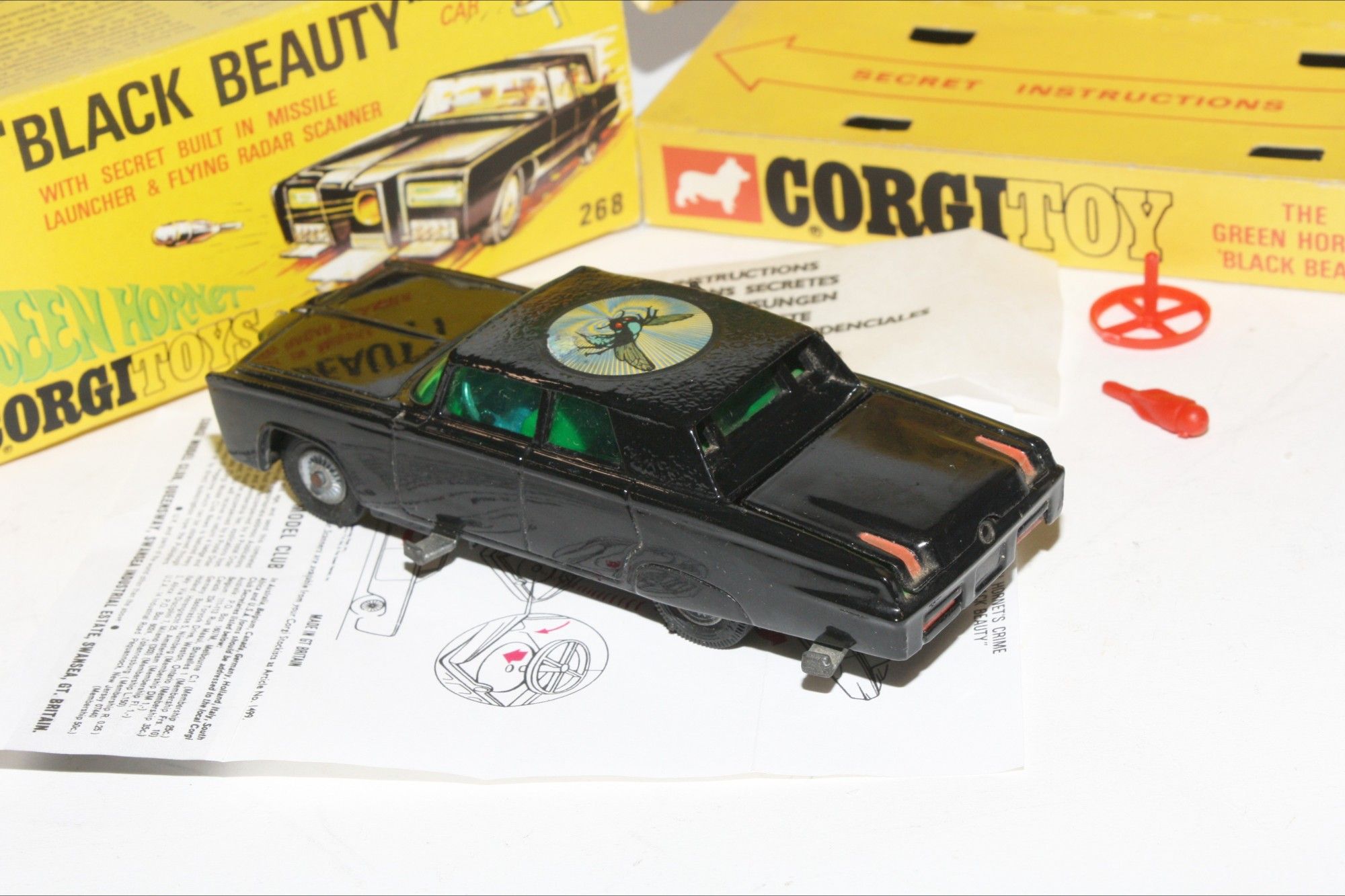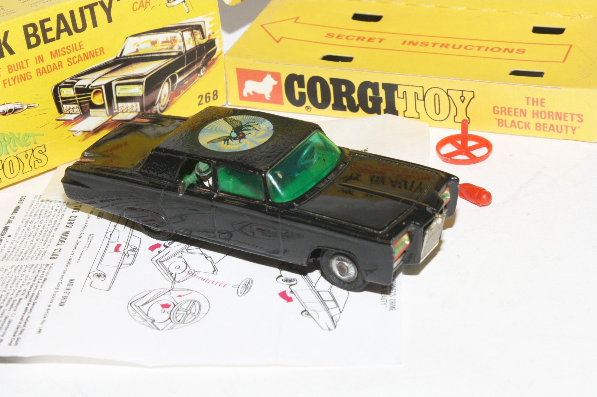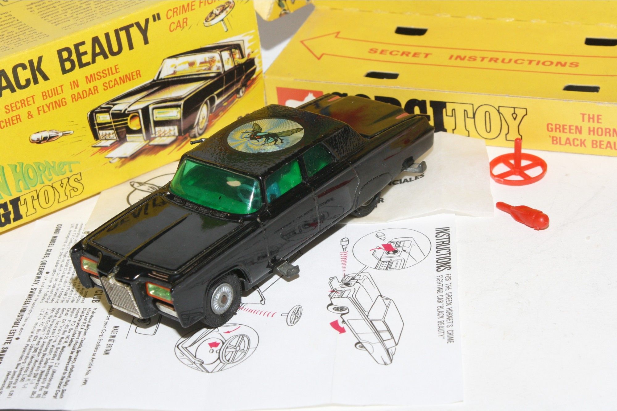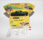 A nice example of this iconic Black Beauty model from the 1960's TV series The Green Hornet. Gleaming gloss black paintwork is virtually mint, please study the photos for exact condition All original tyres on rarer cast hubs, suspension fine, all windows, interior figures are good, original roof decal is excellent, jewelled headlights, built in missile launcher and flying radar scanner features are powerful working, excellent underside..