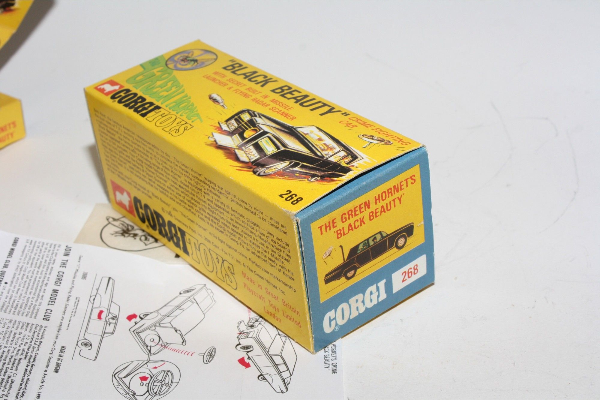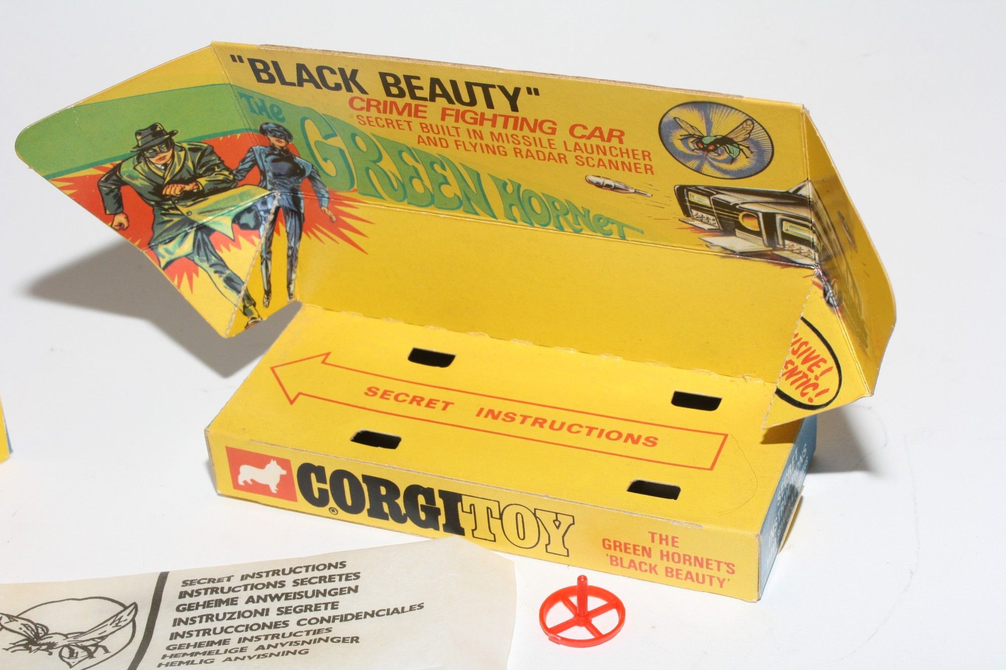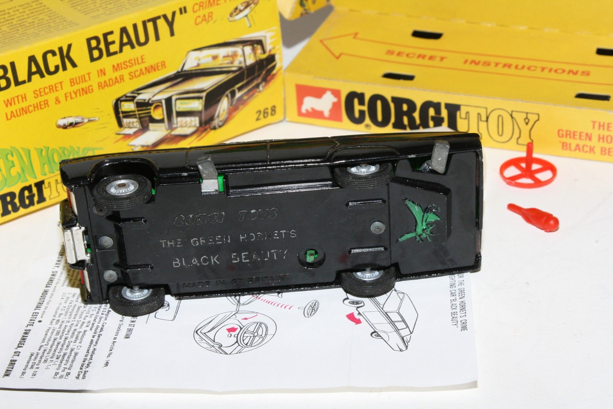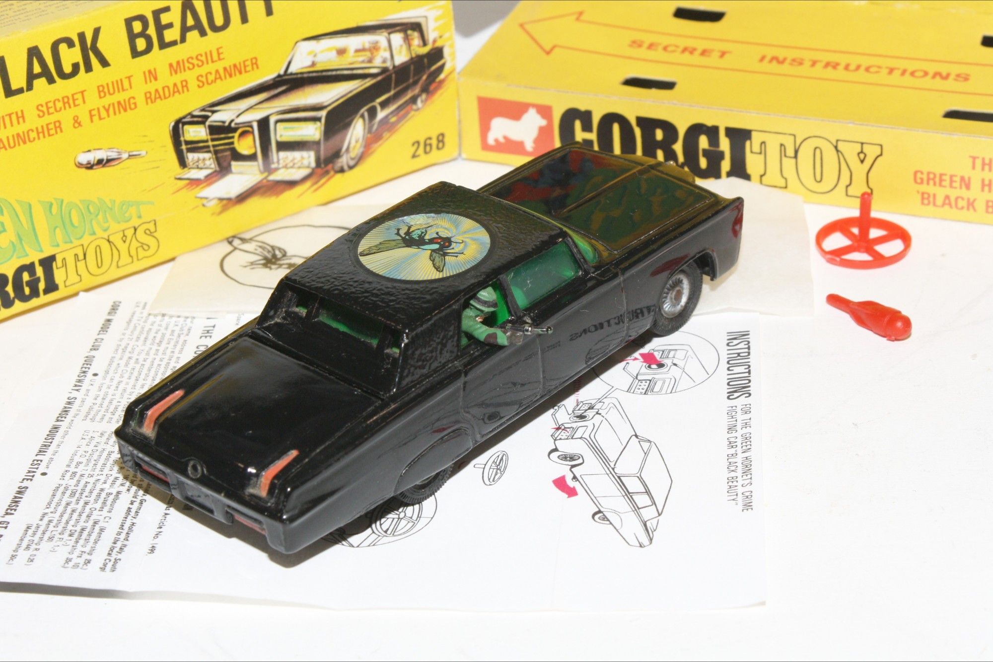 A nice example of this iconic Black Beauty model from the 1960's TV series The Green Hornet. Gleaming gloss black paintwork is virtually mint, please study the photos for exact condition All original tyres on rarer cast hubs, suspension fine, all windows, interior figures are good, original roof decal is excellent, jewelled headlights, built in missile launcher and flying radar scanner features are powerful working, excellent underside..