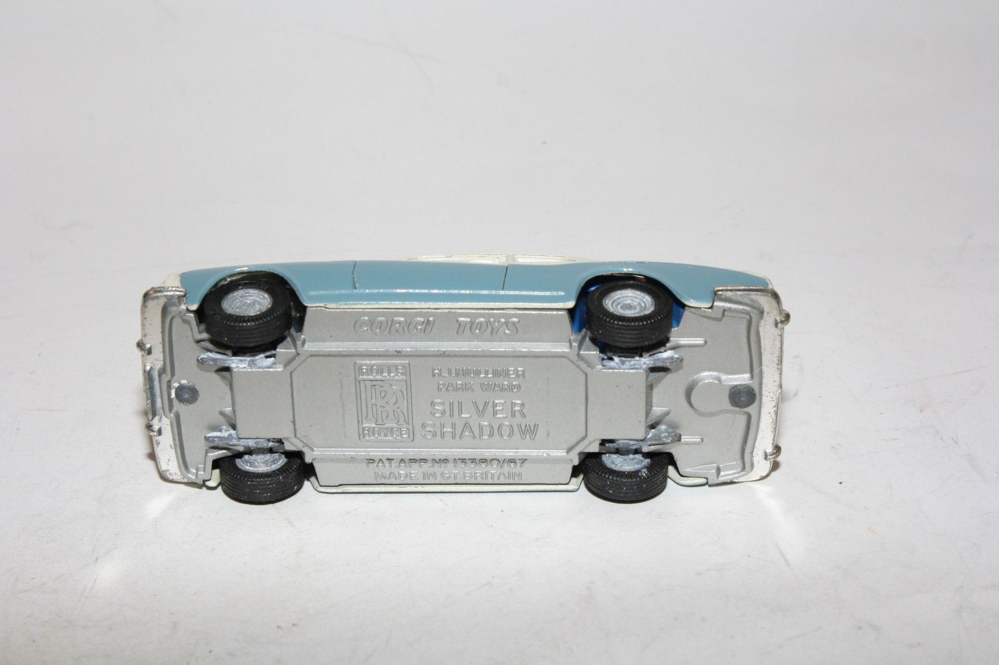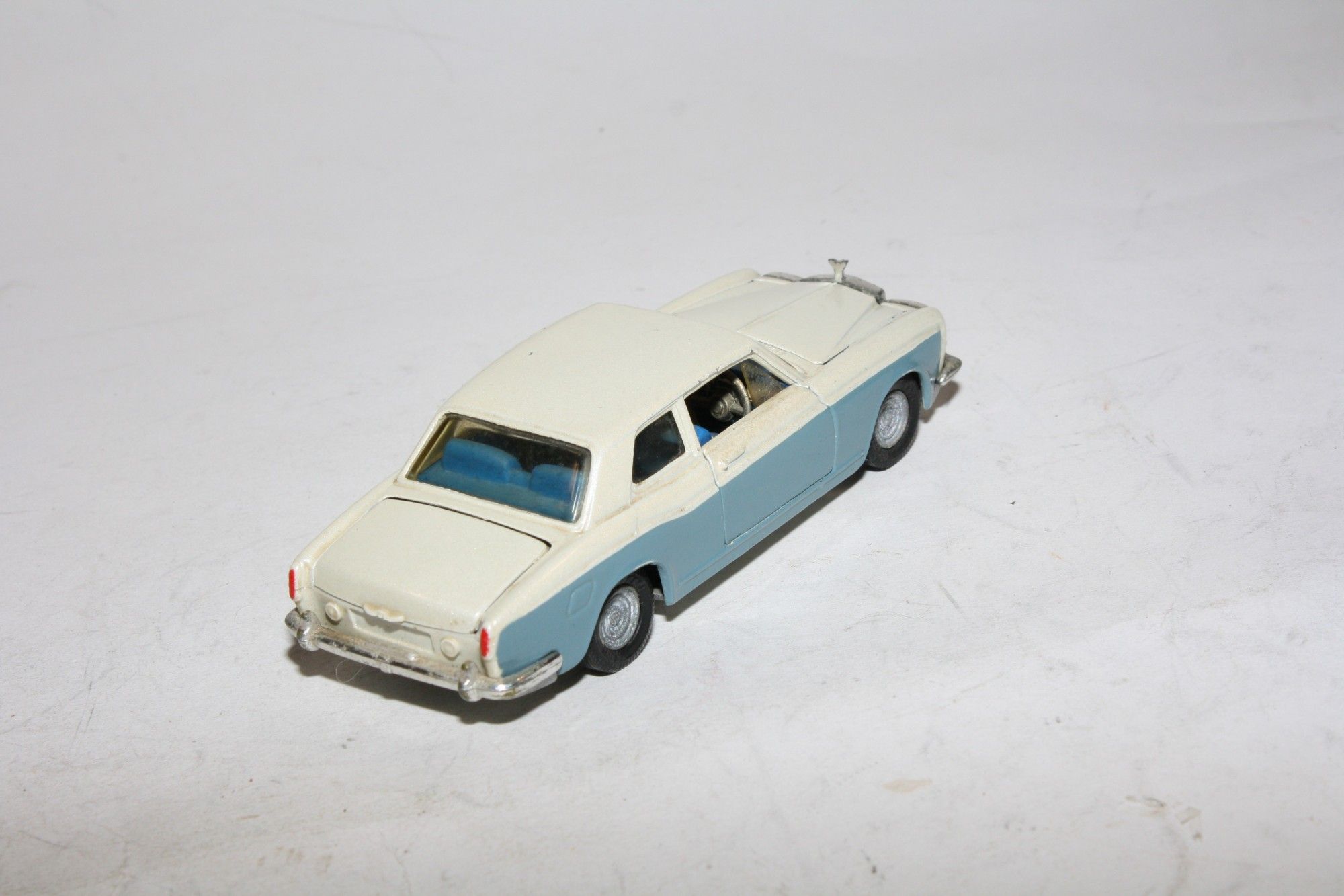 A nice example of this 1970's Corgi. Gleaming two tone paintwork is very good with a couple of fleabite nicks, please study the photos for exact condition. Golden Jacks wheels, good suspension, crystal clear windows, blue interior, opening bonnet and boot, spare wheel in boot. Jewelled headlights and Spirit of Ecstasy present. Mint underside.