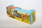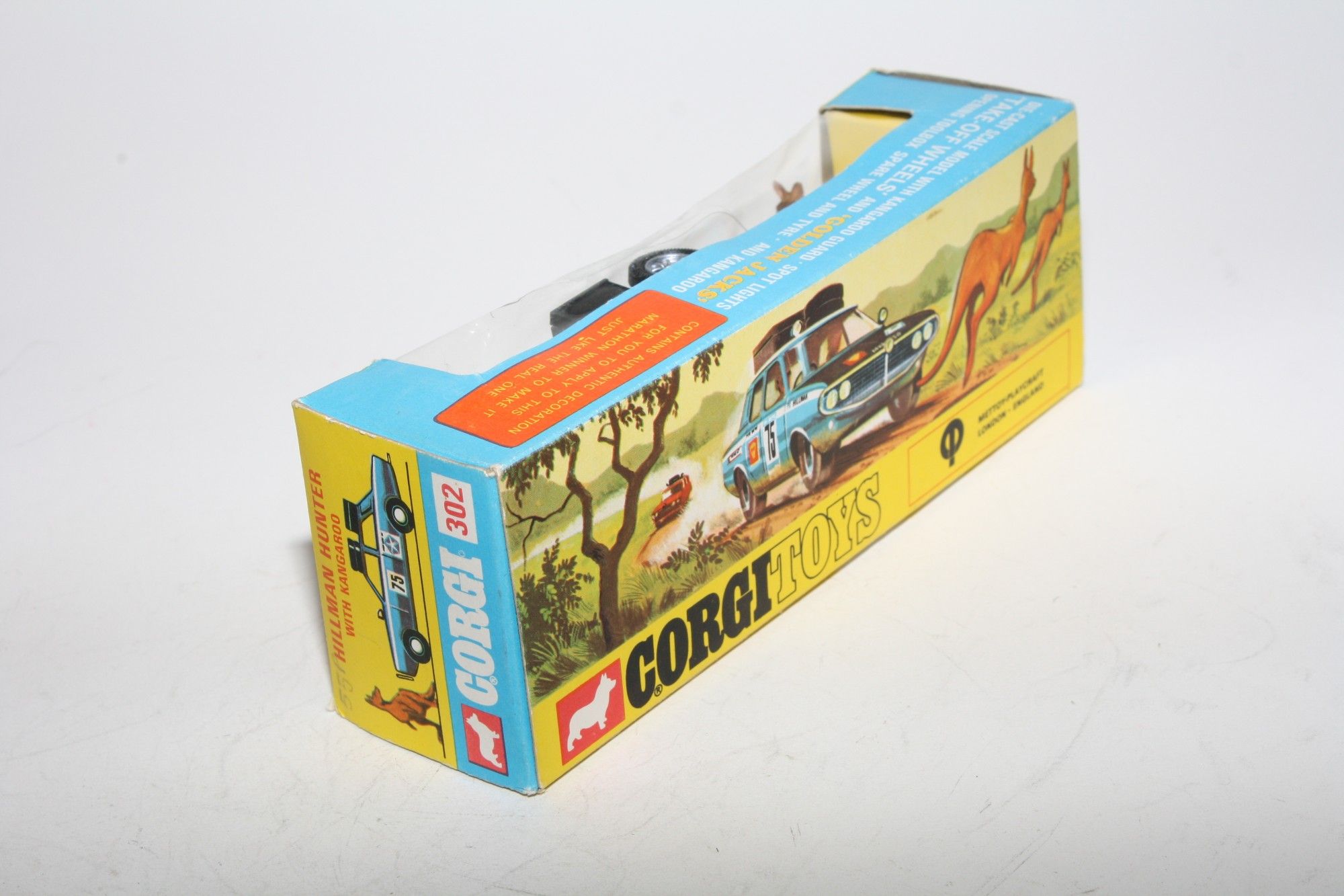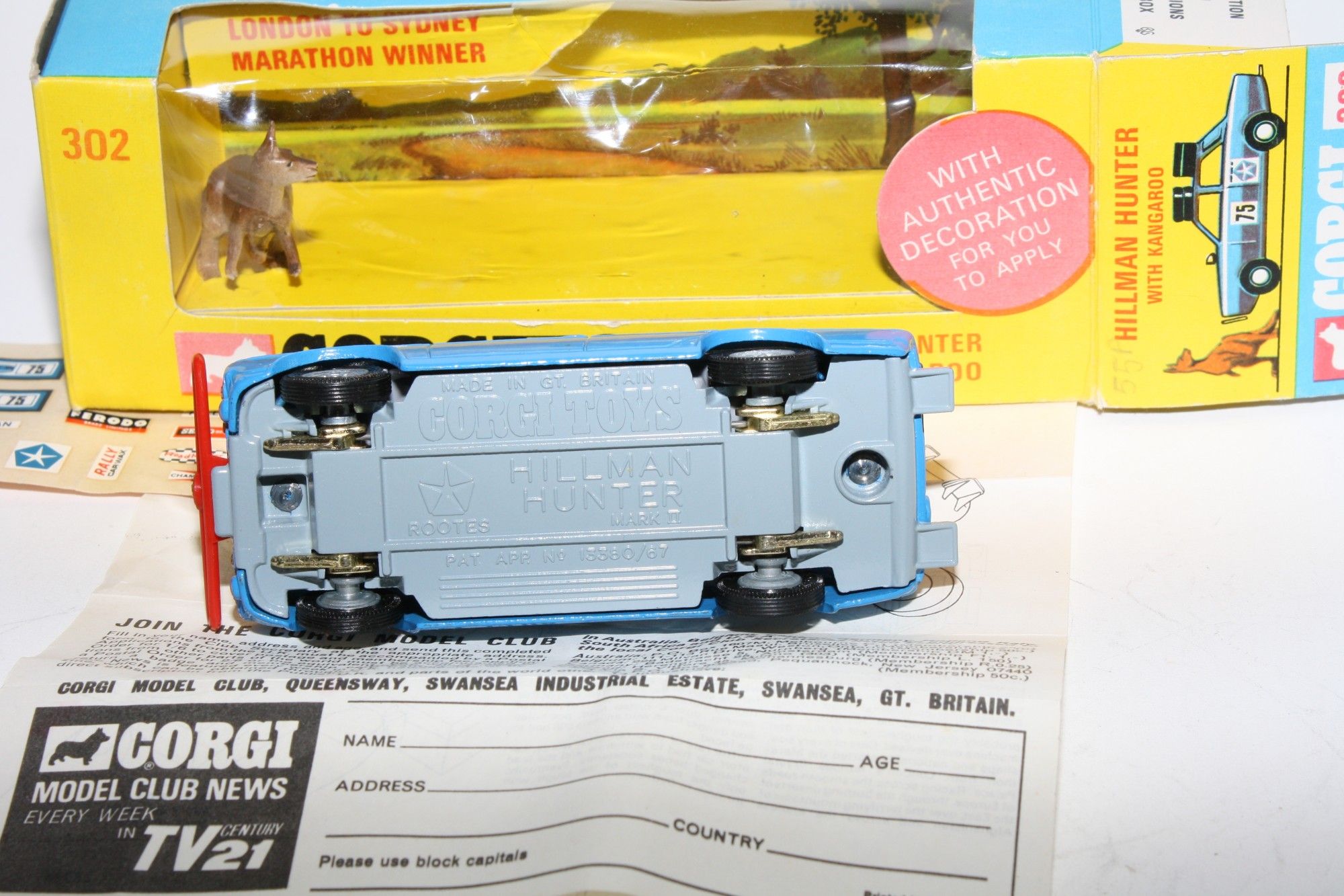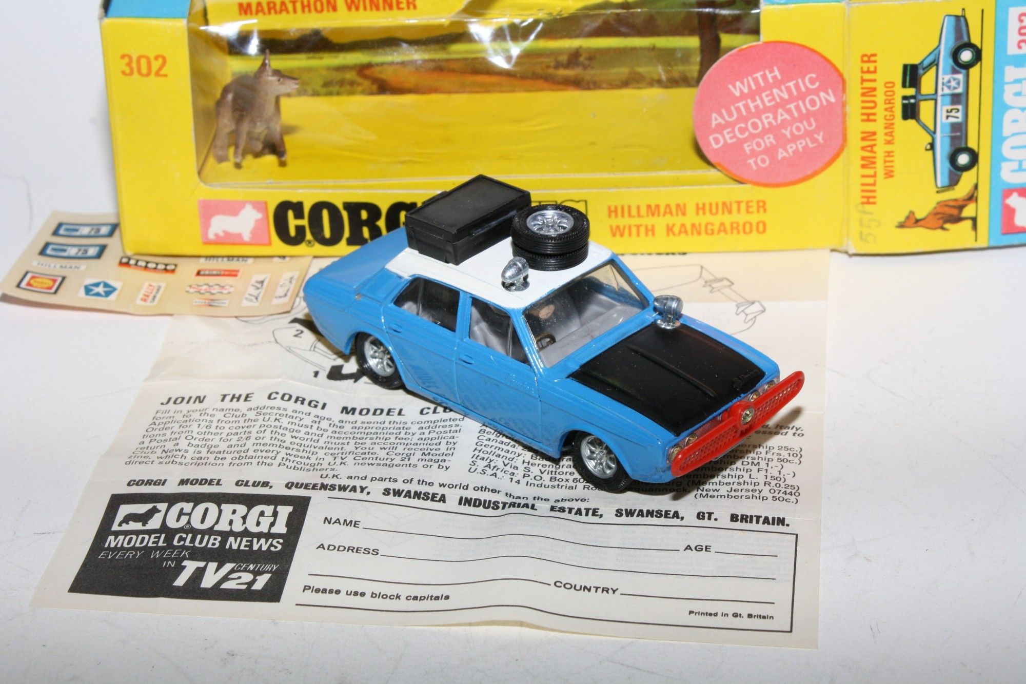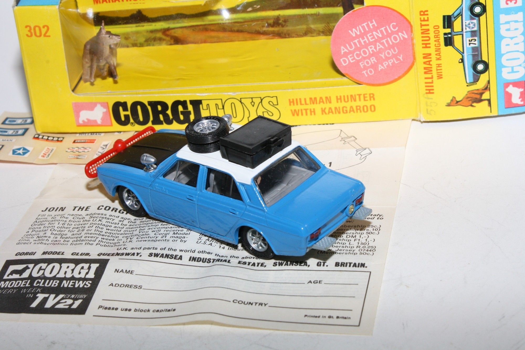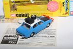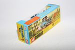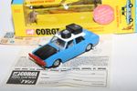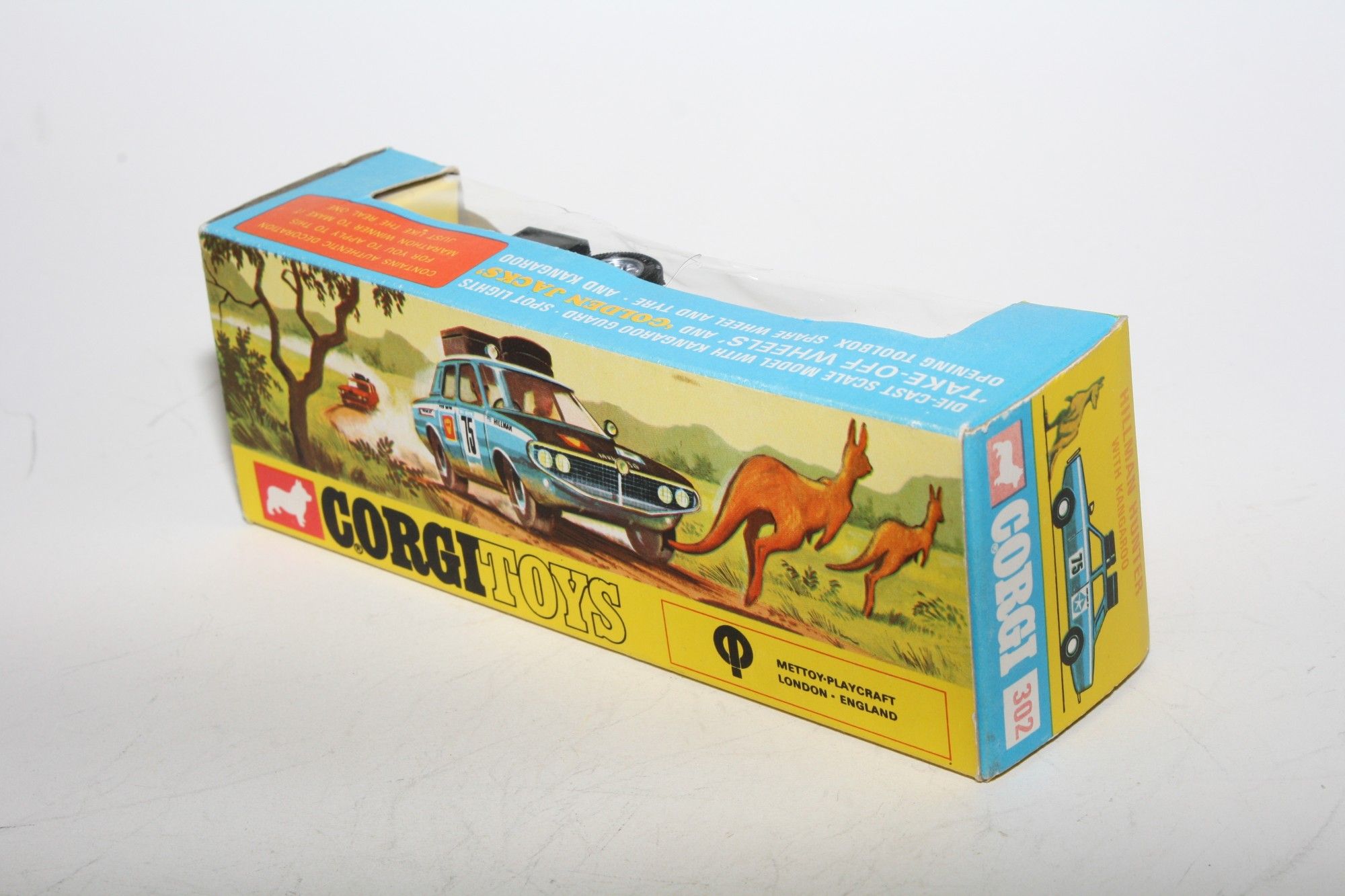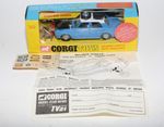An exquisite example of this London to Sydney rally winner. Gleaming original blue/white paintwork is mint, please study the photos for exact condition. Original tyres on Golden Jack hubs, good suspension, crystal clear windows, white interior. Chrome good and jewelled headlights present. Grey interior with crystal clear windows, all roof mounted items present along with kangeroo catcher and spotlights. Mint underside. Original kangeroo figure present with un-applied decal sheet, full original decal application/information Corgi Club sheet in excellent folded condition.