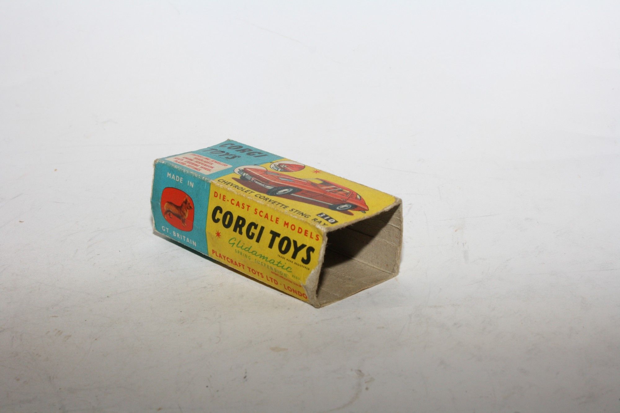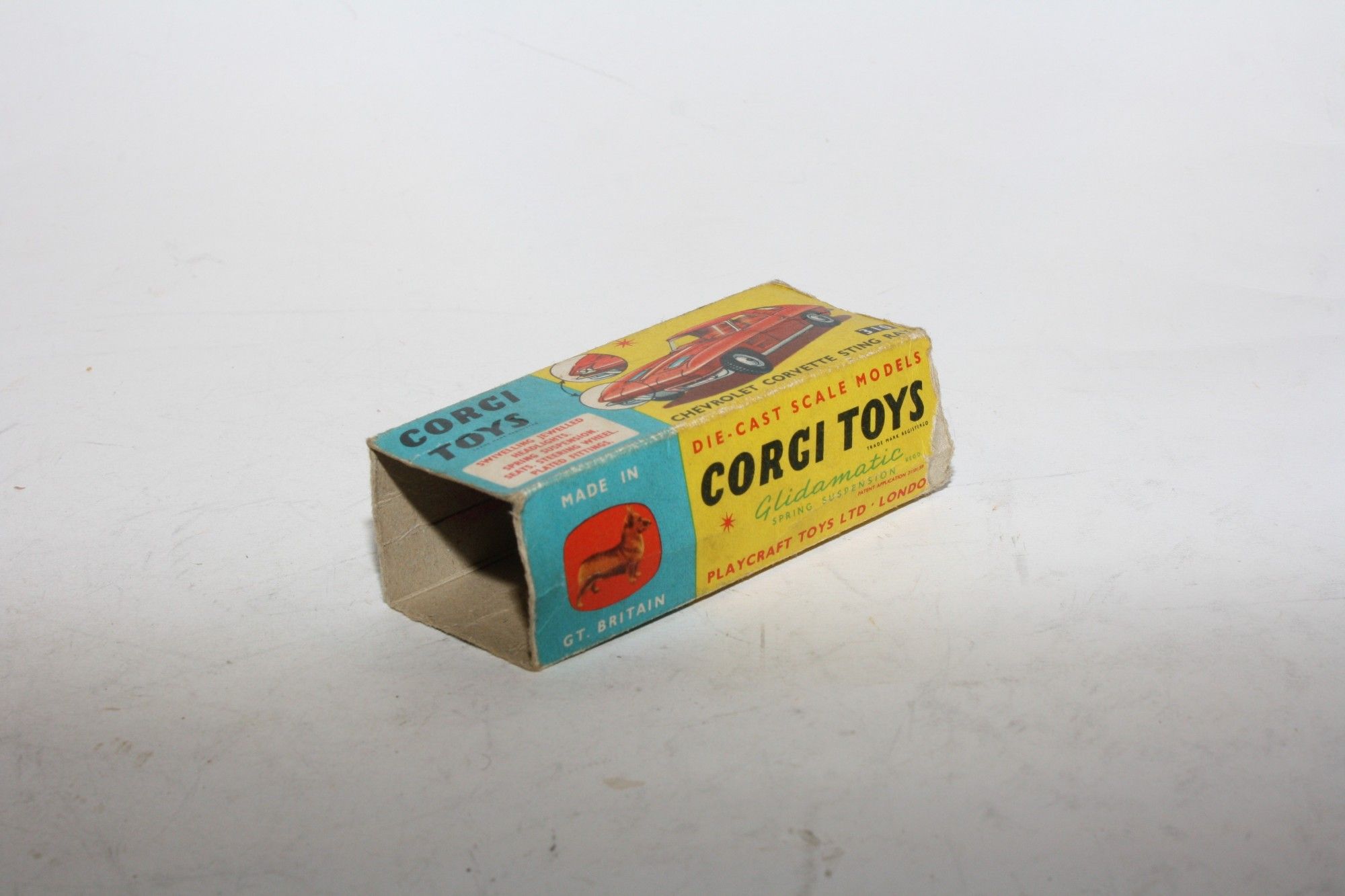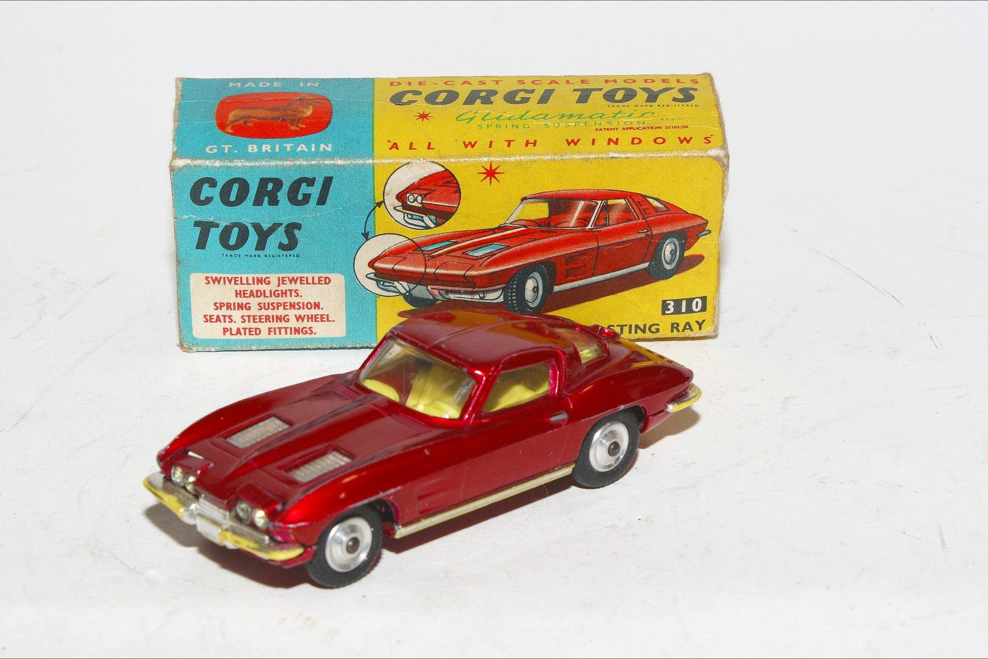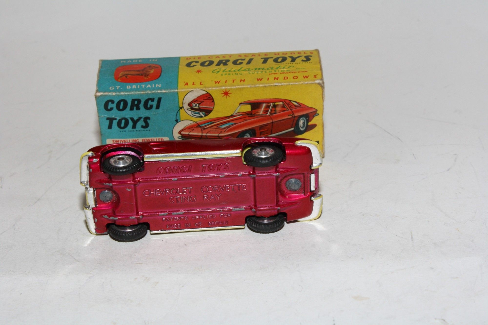 A good example of this 1960's Corgi. Gleaming original metallic paintwork is ery good but has rubs andf nicks mainly to raised edges, please study the photos for exact condition. Good original tyres on spun hubs, perfect suspension, crystal clear windows and yellow interior, jewelled headlights,chrome loss to bumpers, underside good with a little loss to raised edges.