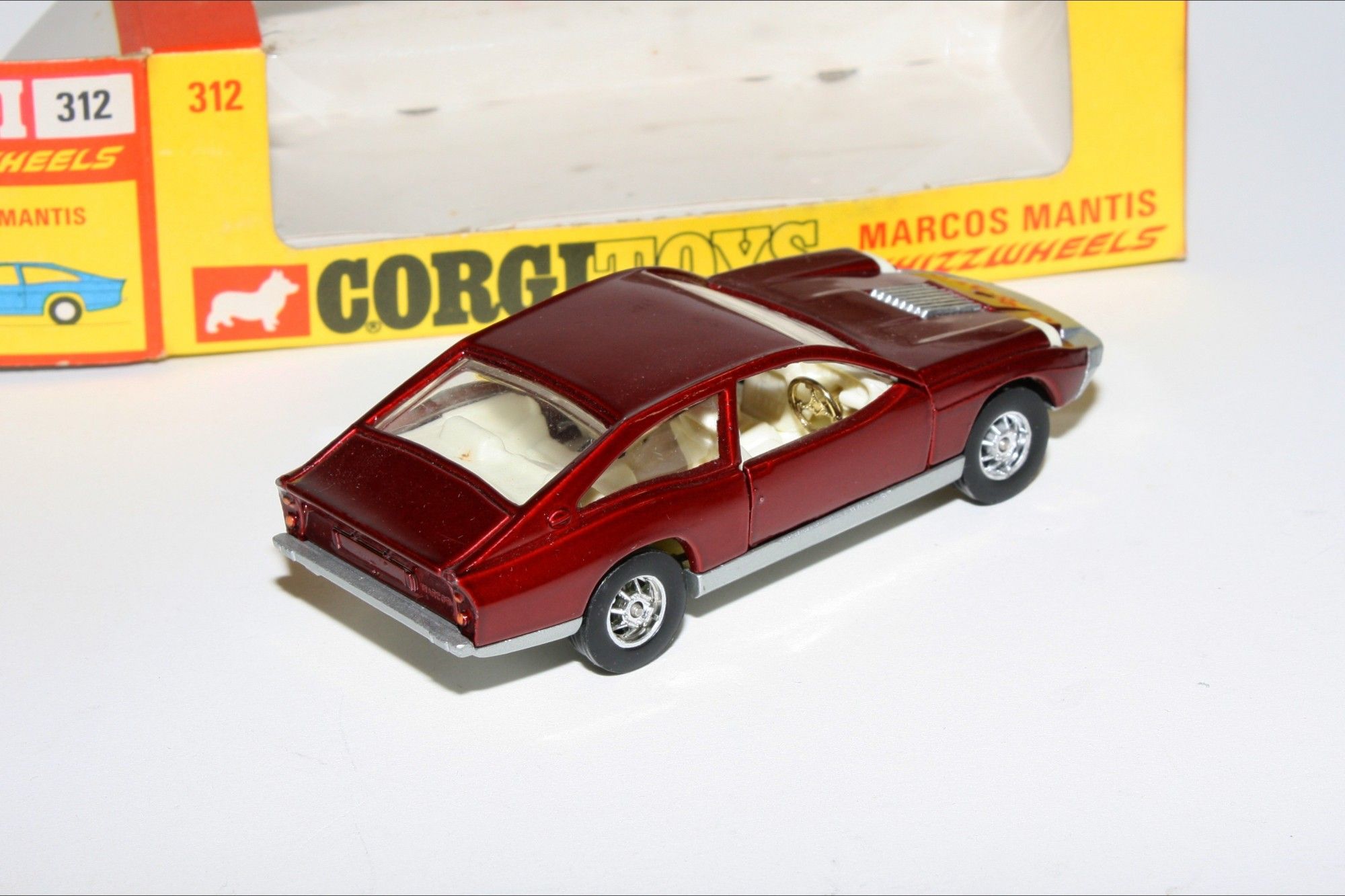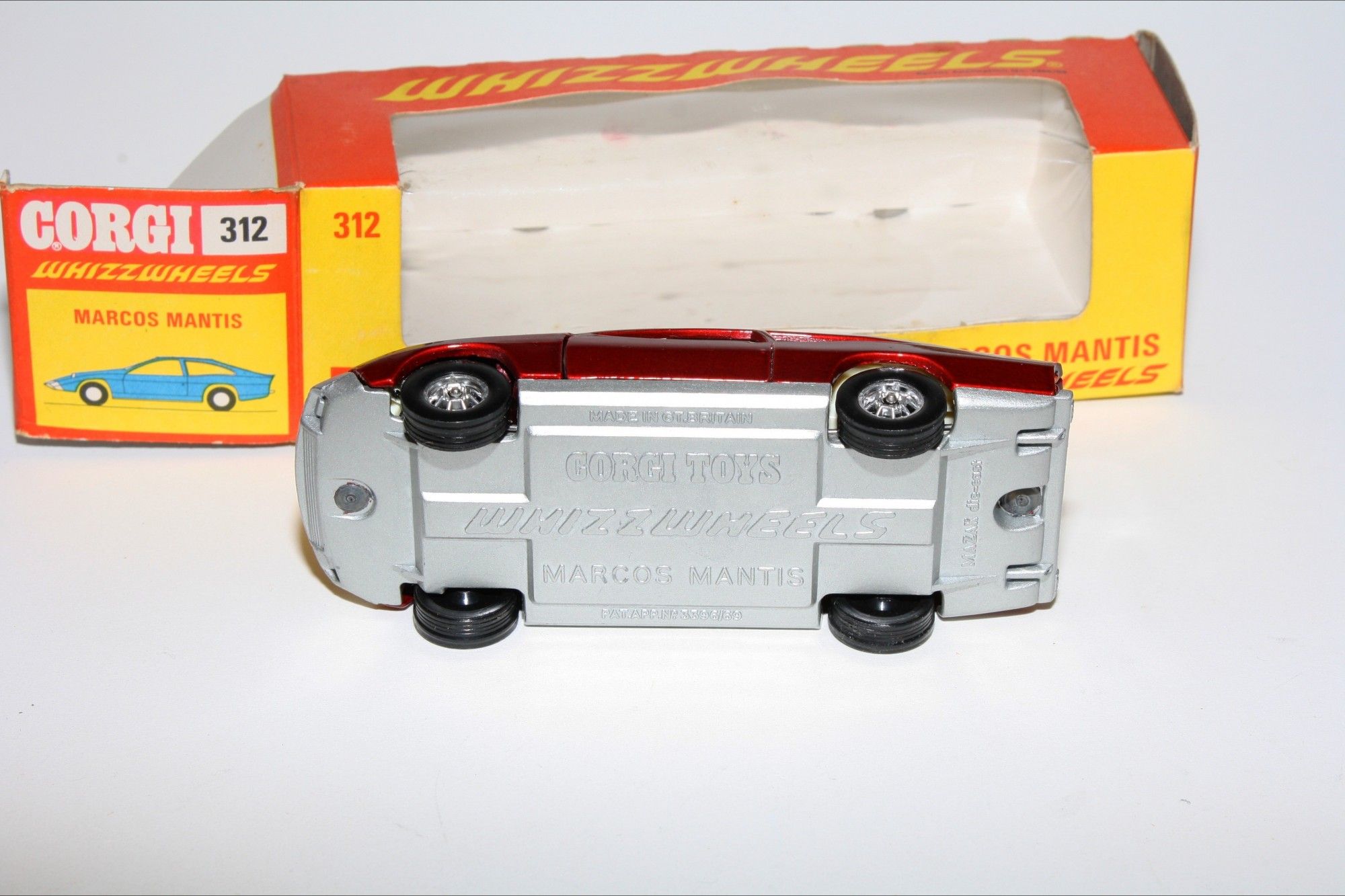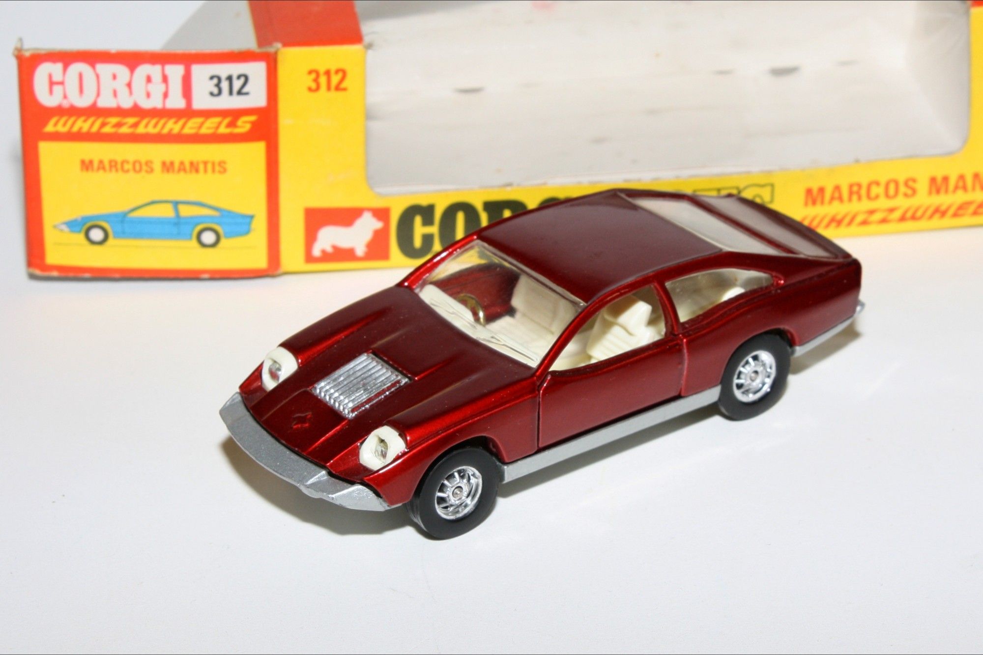 A superb example of this stunning Corgi model. Original gleaming metallic paintwork in pristine condition, please study the photos. All perfect silver Whizzwheels, strong suspension, crystal clear windows, white interior with gold steering wheel, mint silver base.