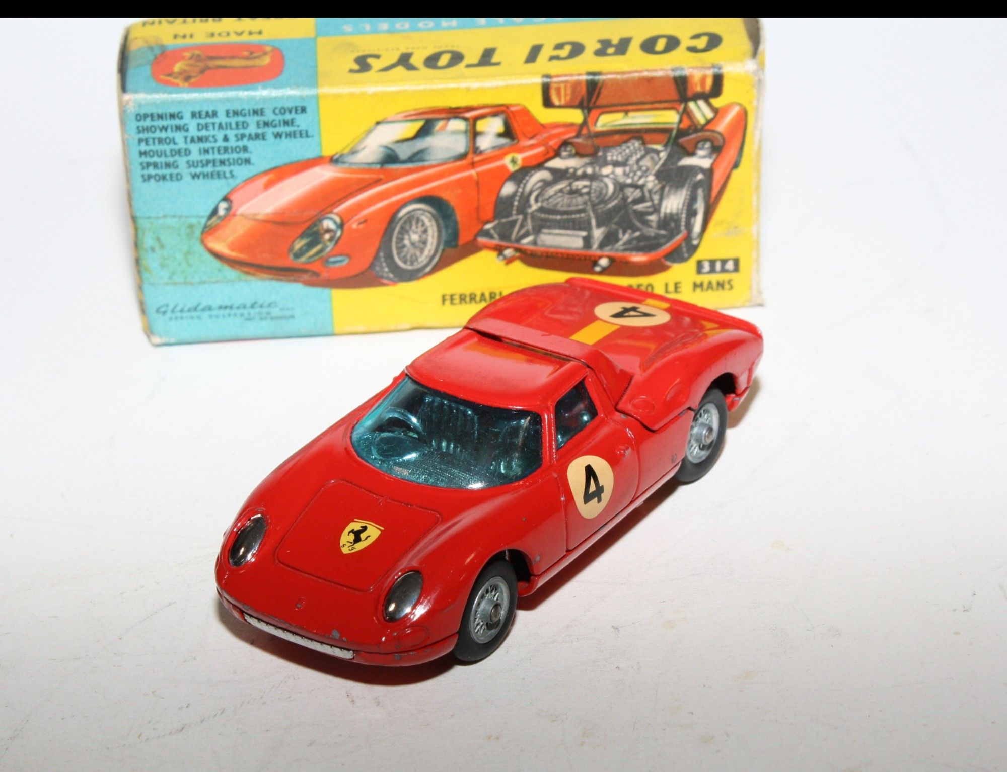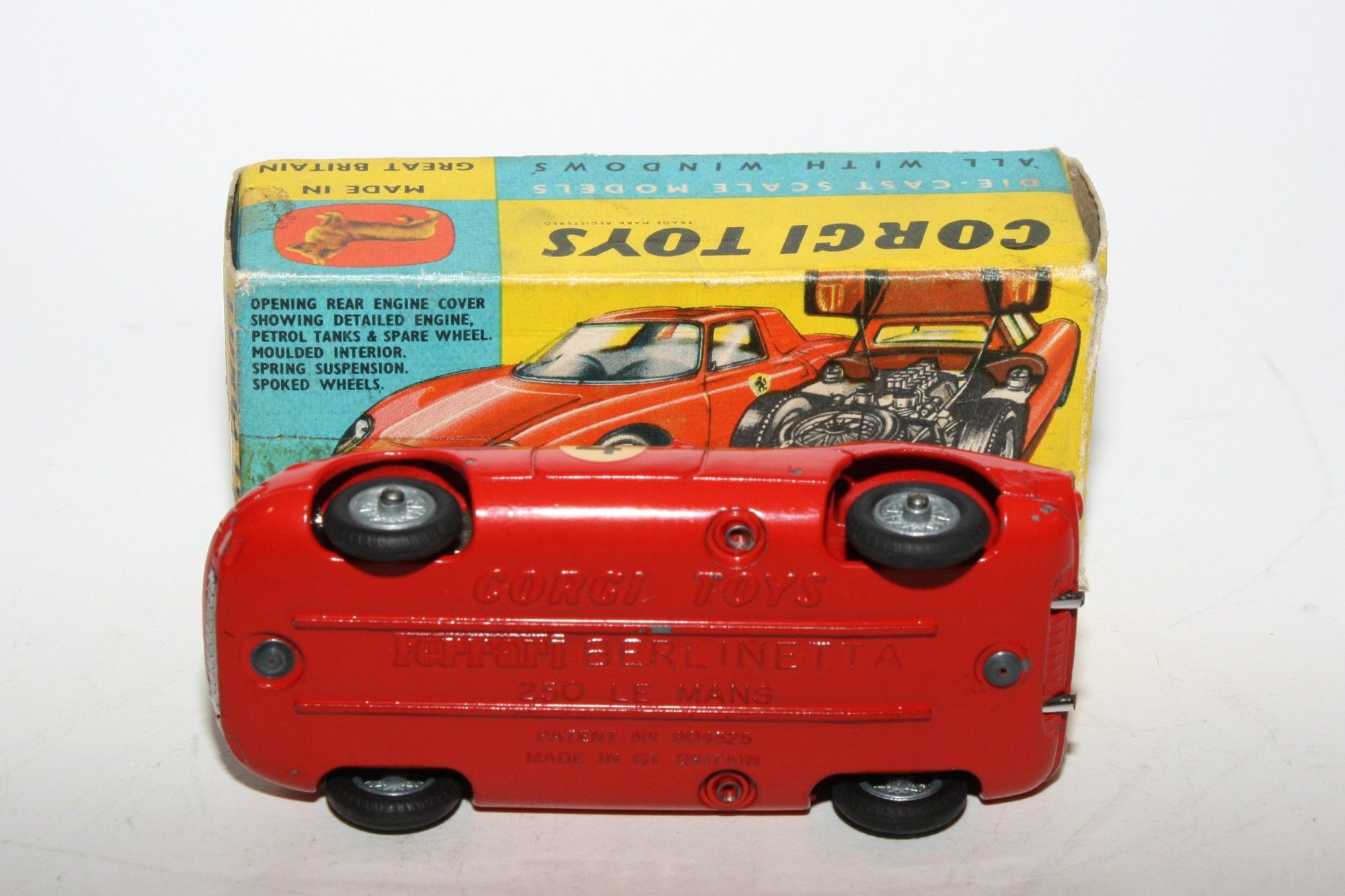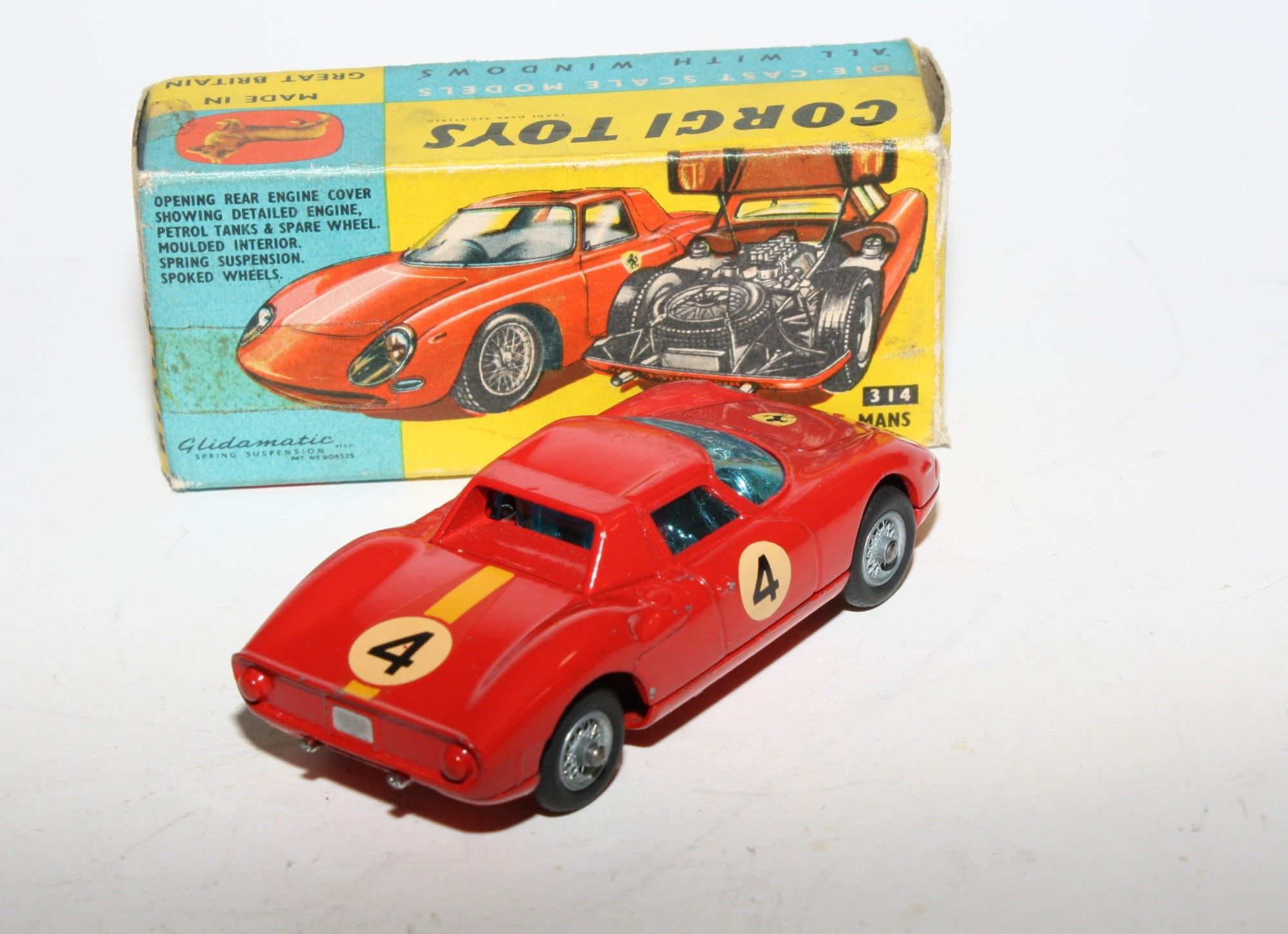 A good example of this 1960's Corgi model. Original red paintwork is good but with a few small nicks, please study the high resolution photos for exact condition. Good original tyres on spoked hubs, good suspension, crystal clear windows, perfect interior, racing decals excellent, engine bay perfect, bright chrome underside good.