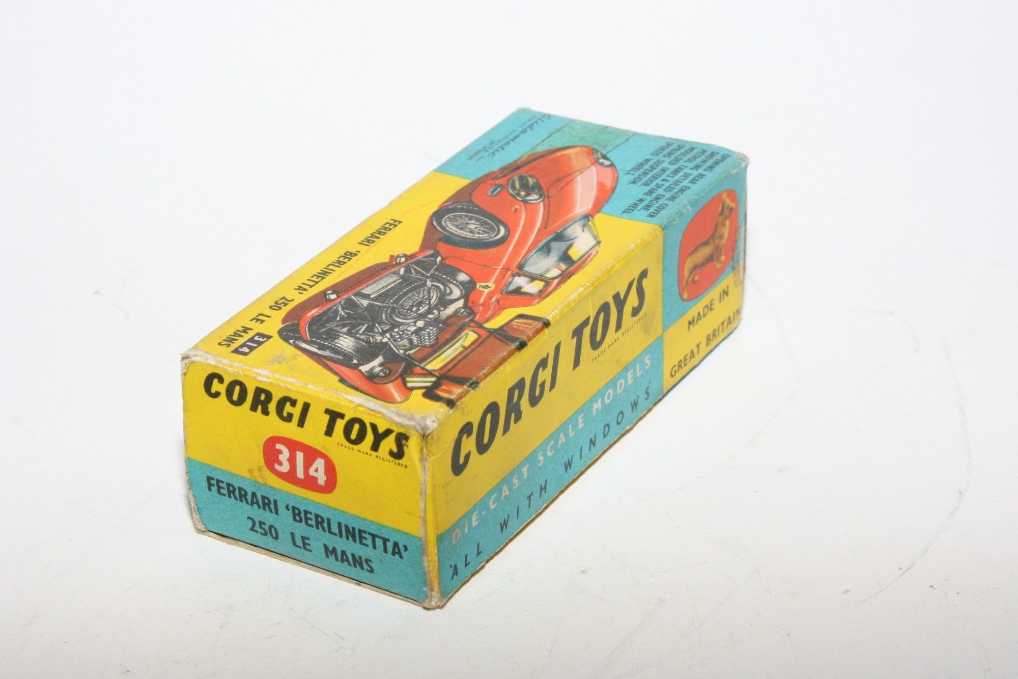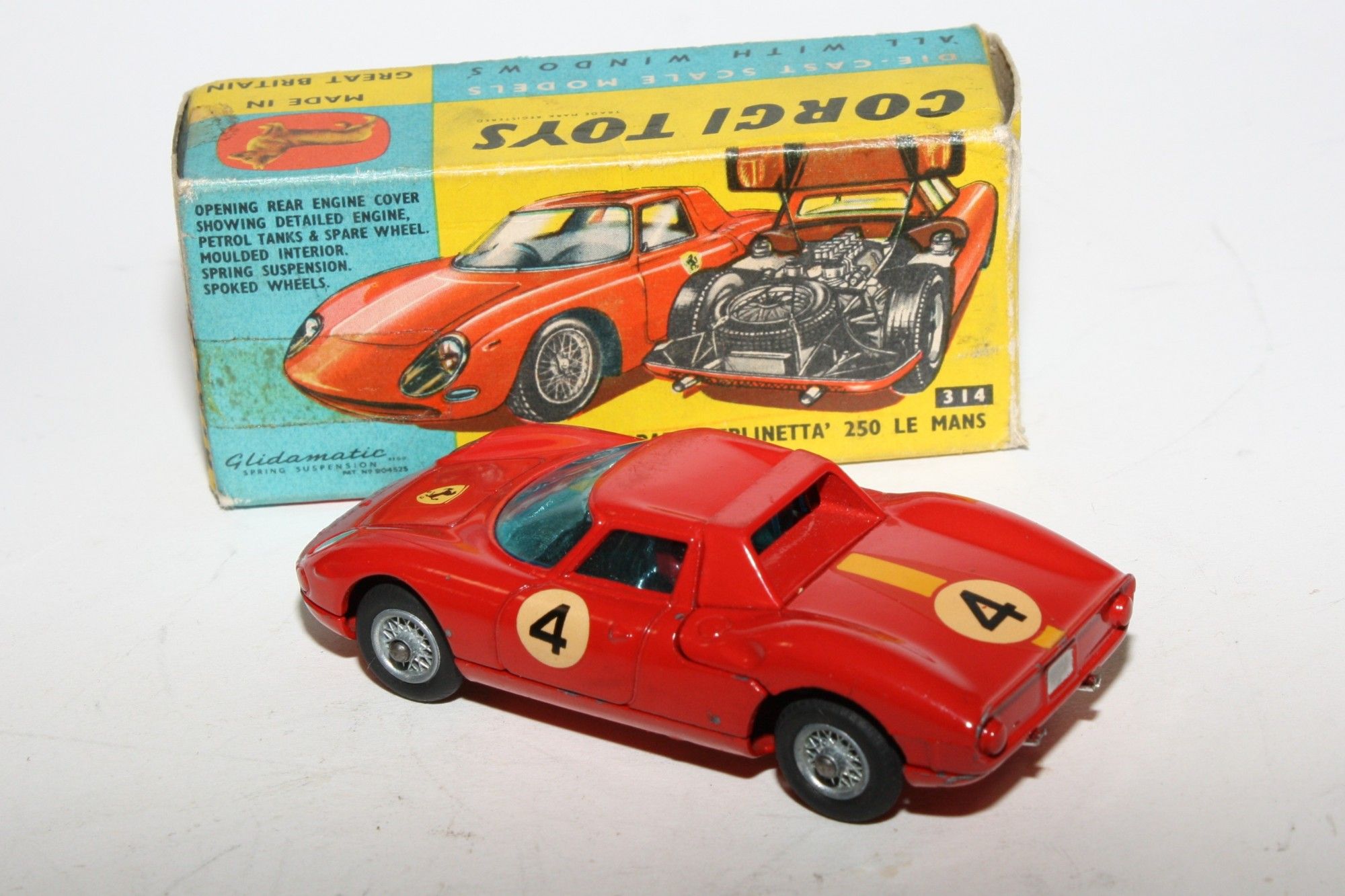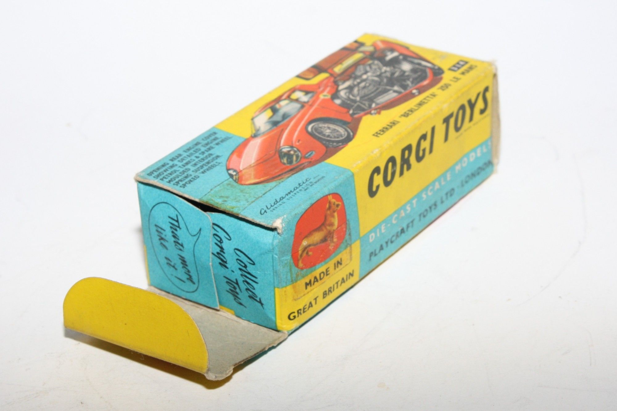 A good example of this 1960's Corgi model. Original red paintwork is good but with a few small nicks, please study the high resolution photos for exact condition. Good original tyres on spoked hubs, good suspension, crystal clear windows, perfect interior, racing decals excellent, engine bay perfect, bright chrome underside good.