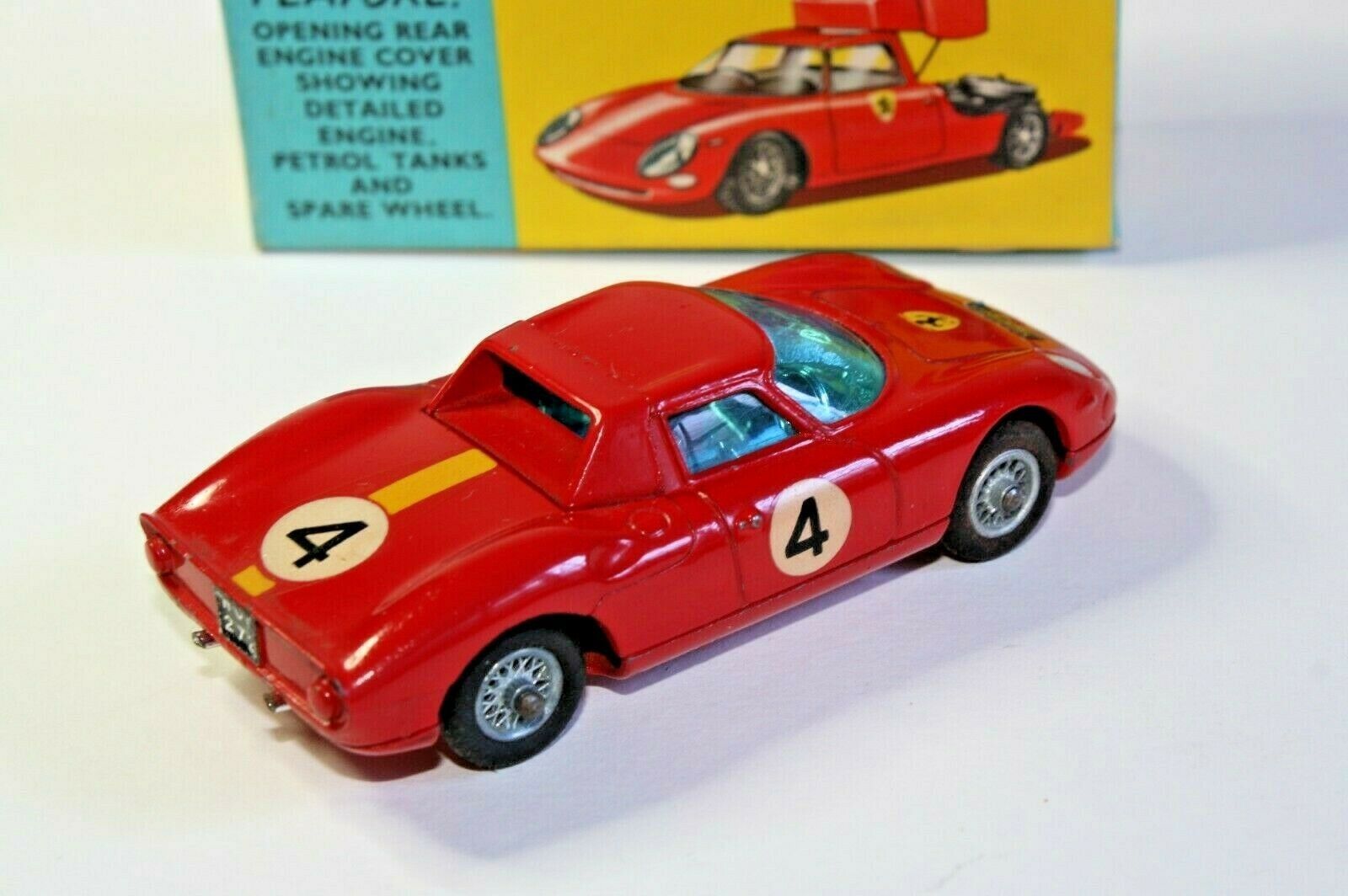 A very good example of this 1960's Corgi model. Original red paintwork is very good with just a few tiny chips, please study the high resolution photos for exact condition. Perfect original tyres on spoked hubs, good suspension, crystal clear windows, perfect interior, decals perfect, engine bay good, good chrome, underside has paint loss on raisded edges.