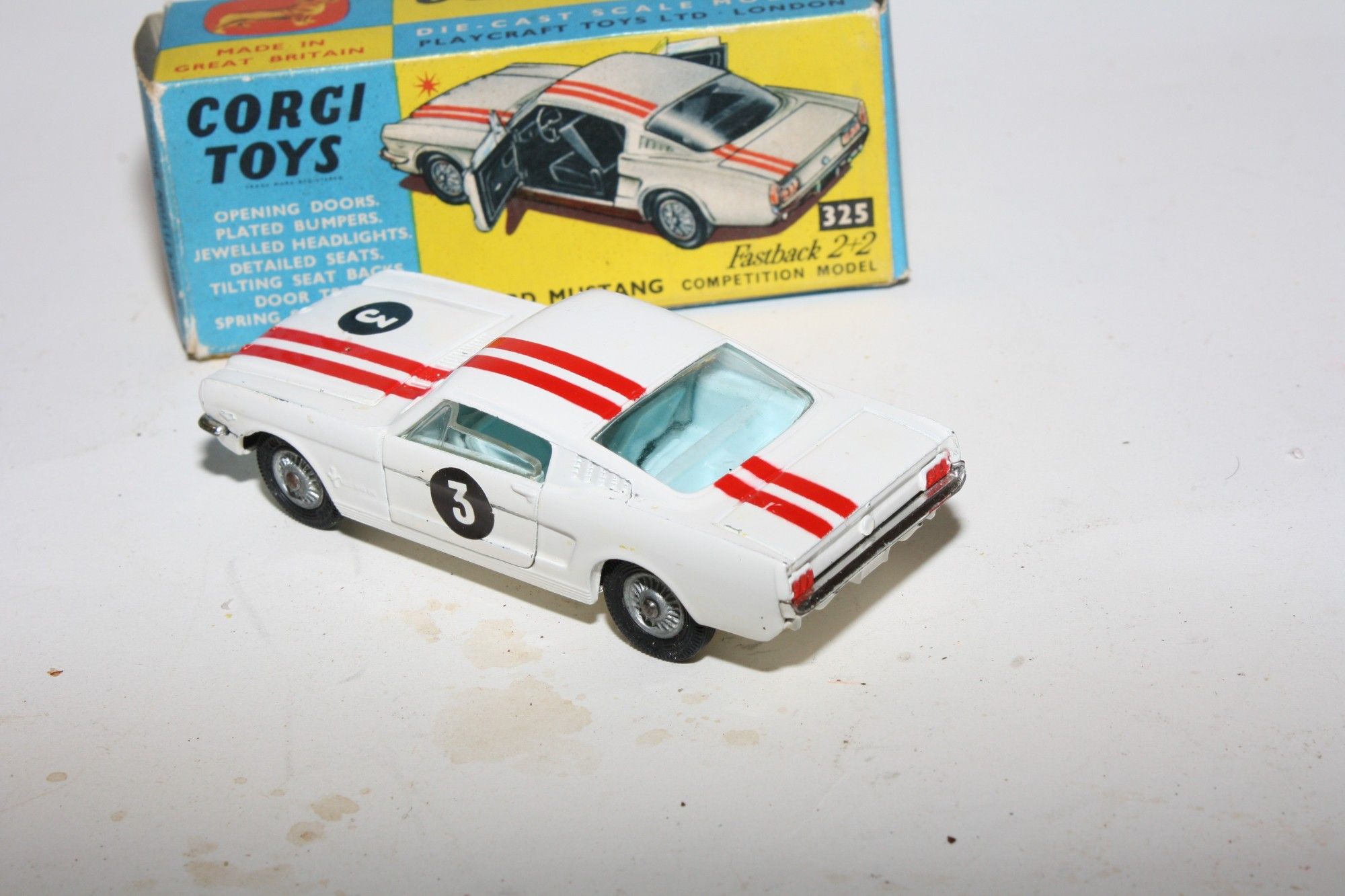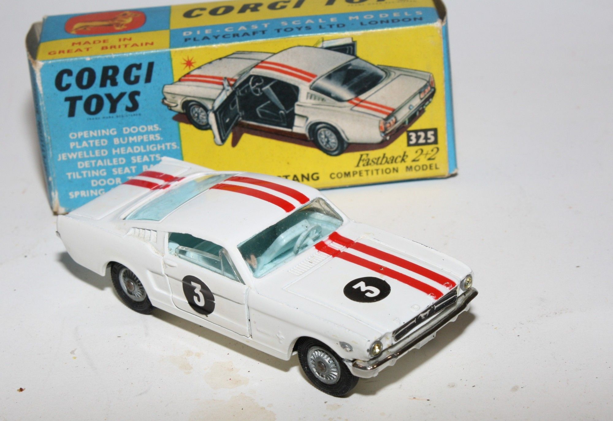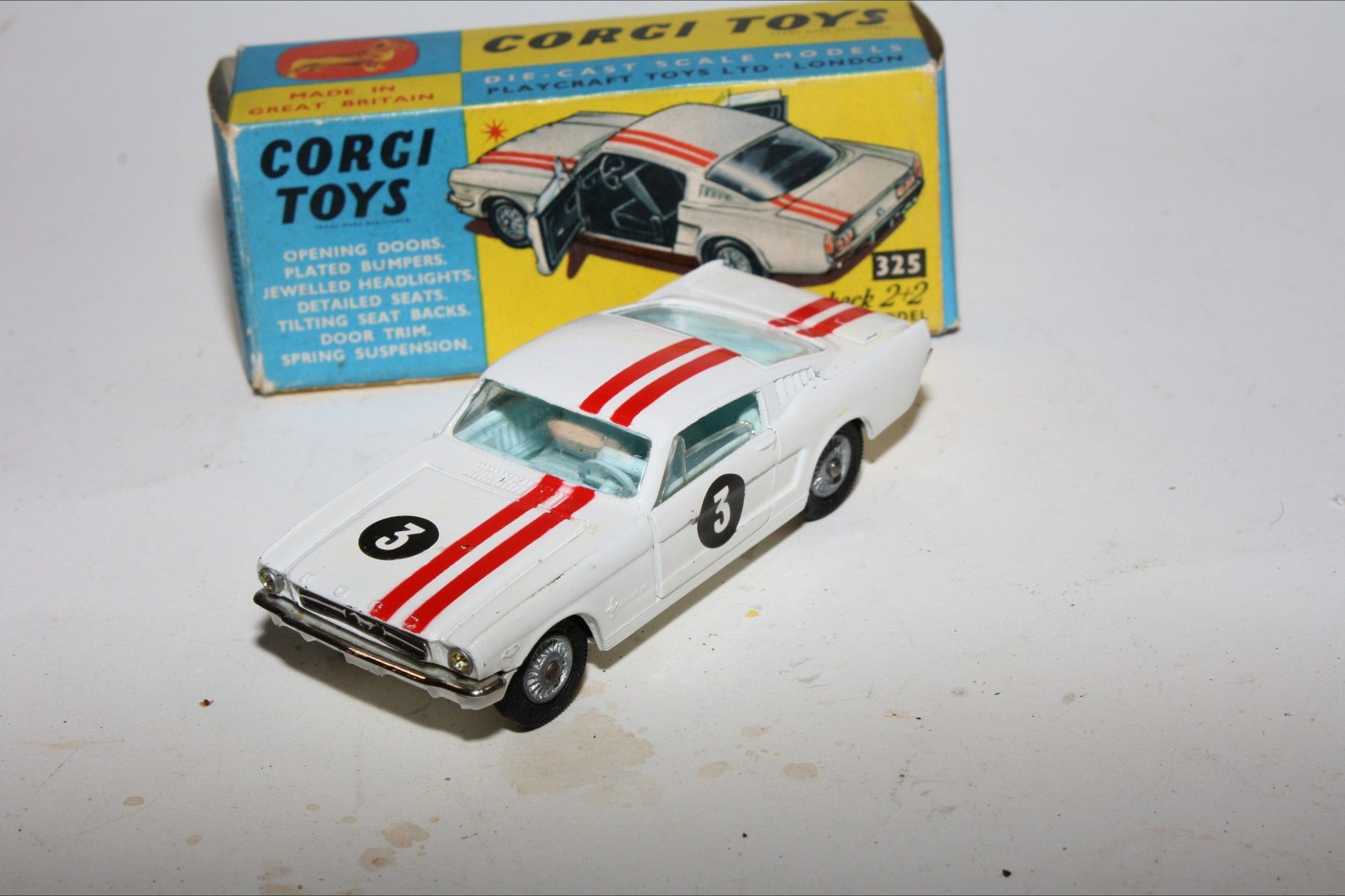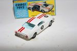 A good example of this Corgi model. Gleaming original paintwork with red stripes is excellent with a few nicks and rubs, please study the photos for exact condition. All original tyres on cast hubs, crystal clear windows, pale blue interior, jewelled headlights and good chrome, RN #3, underside near mint.