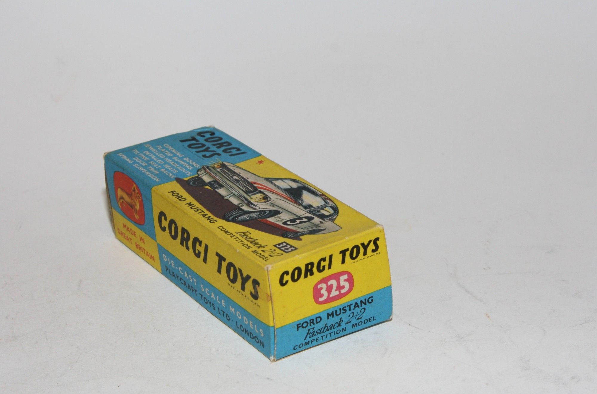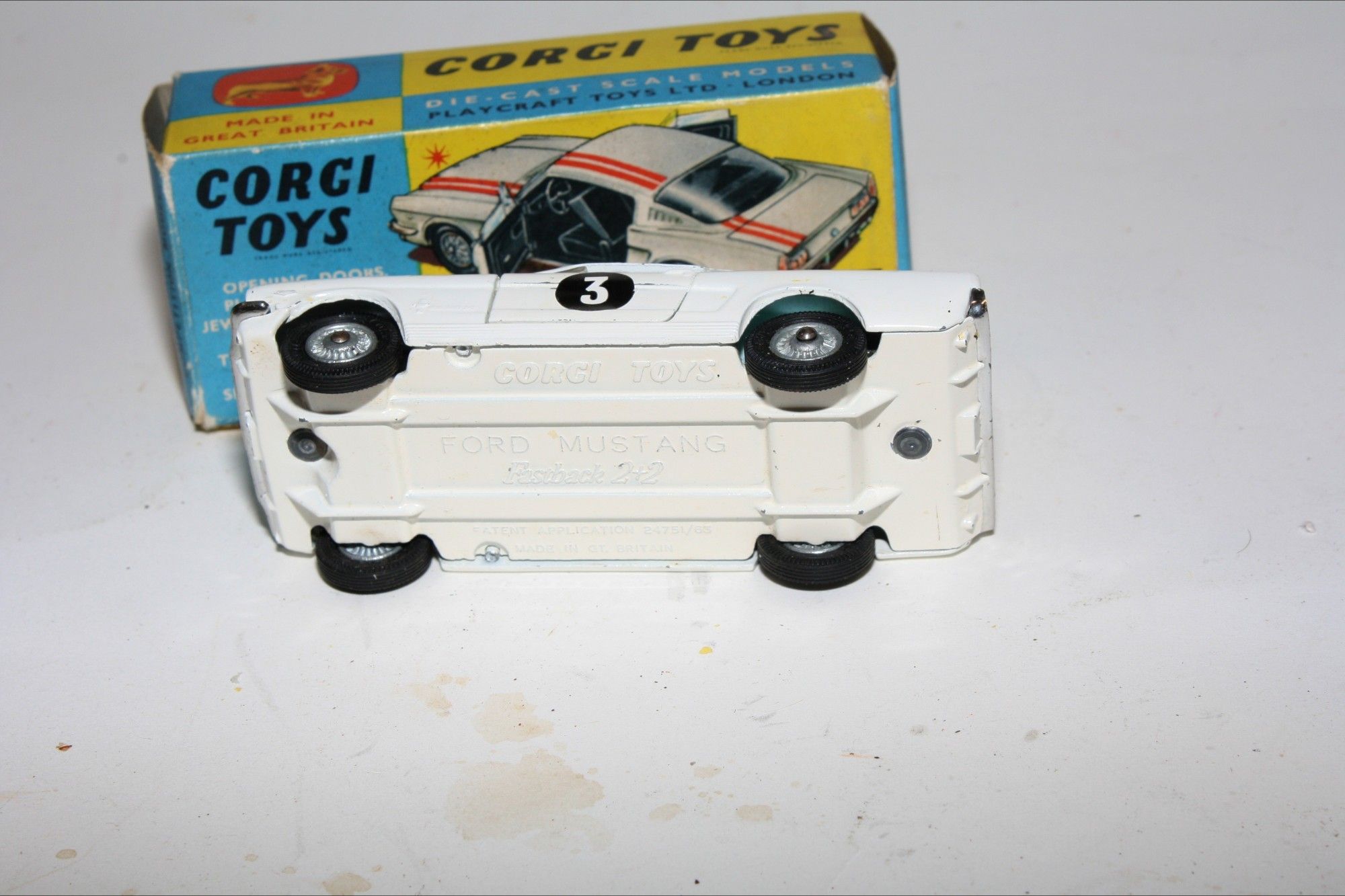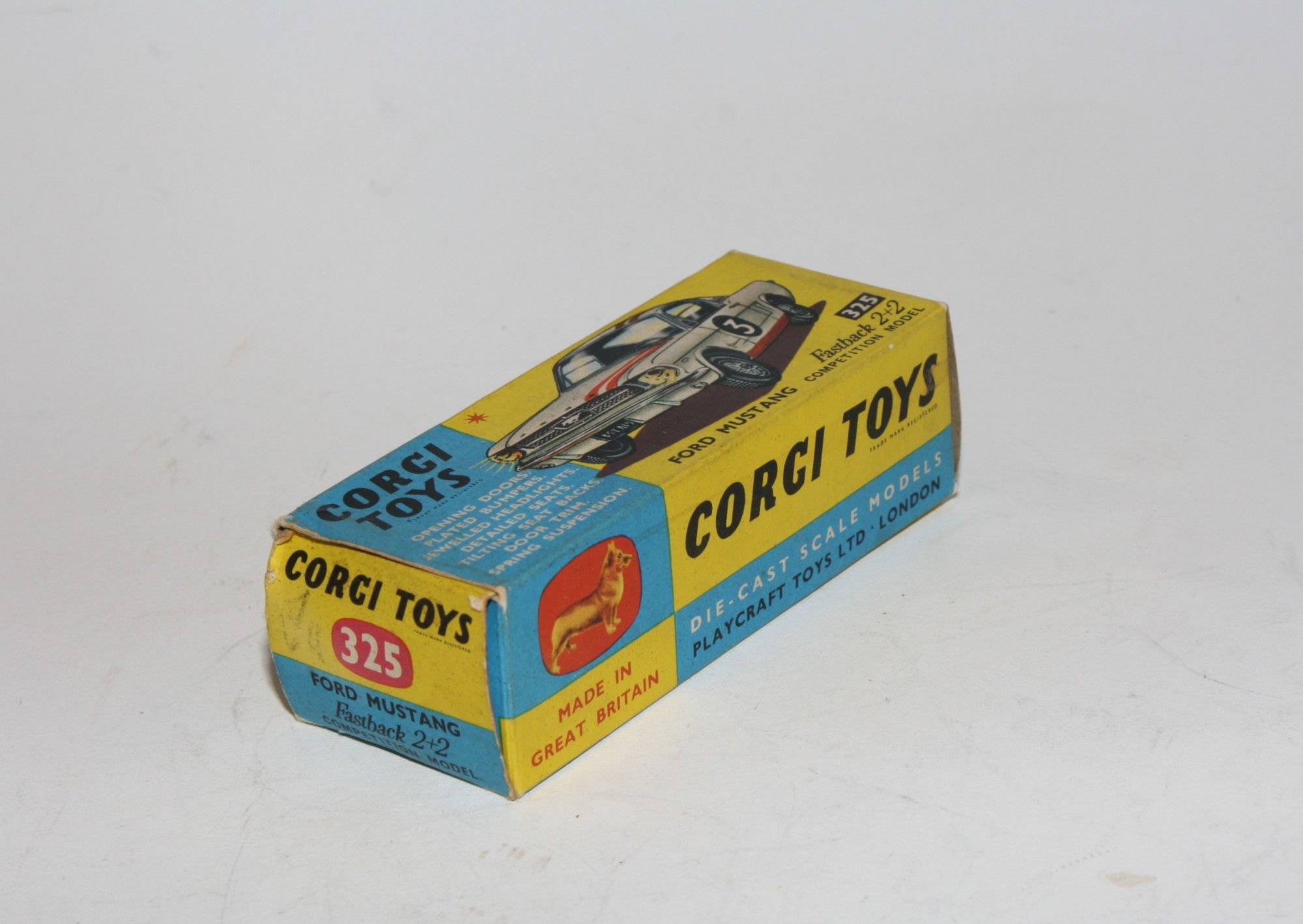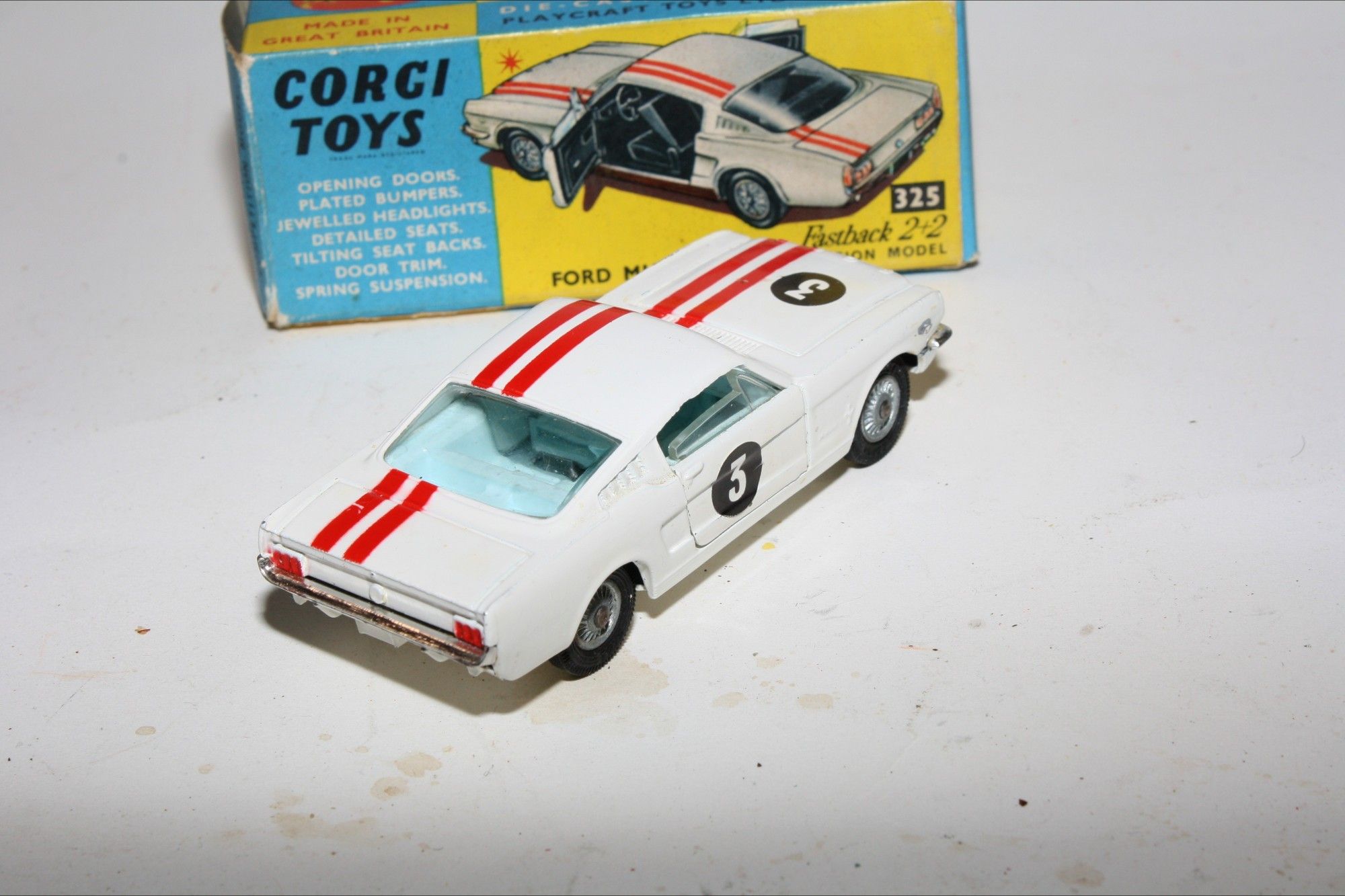 A good example of this Corgi model. Gleaming original paintwork with red stripes is excellent with a few nicks and rubs, please study the photos for exact condition. All original tyres on cast hubs, crystal clear windows, pale blue interior, jewelled headlights and good chrome, RN #3, underside near mint.