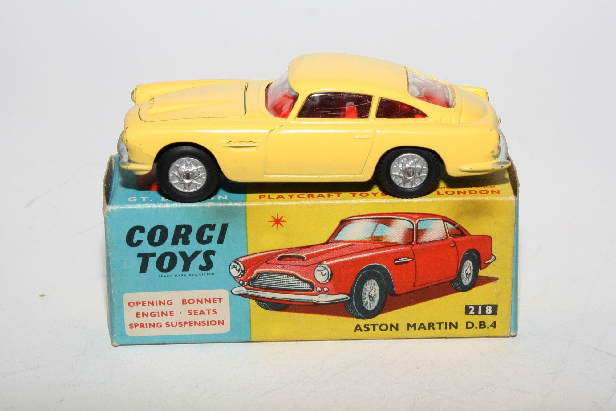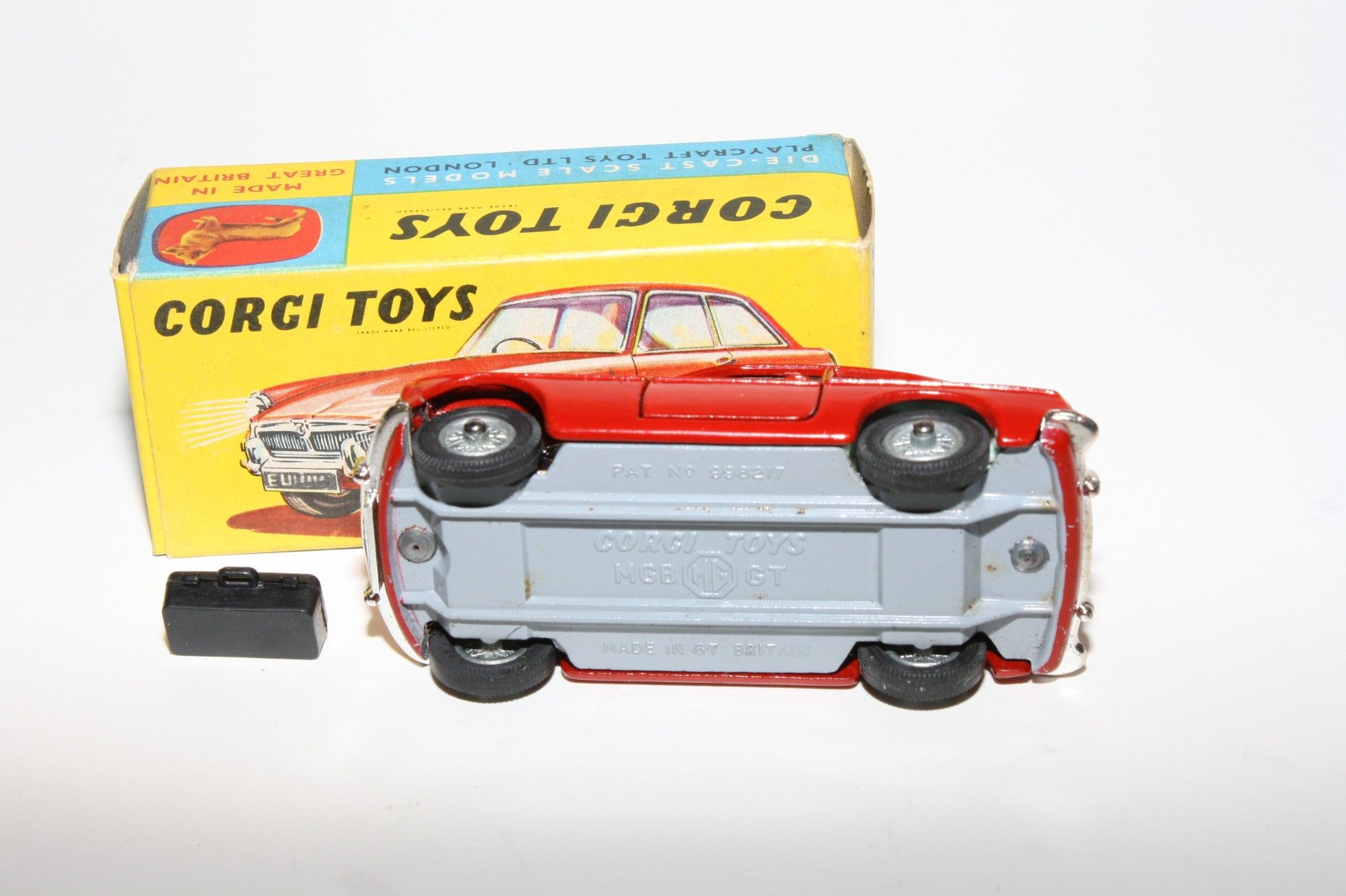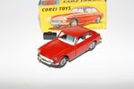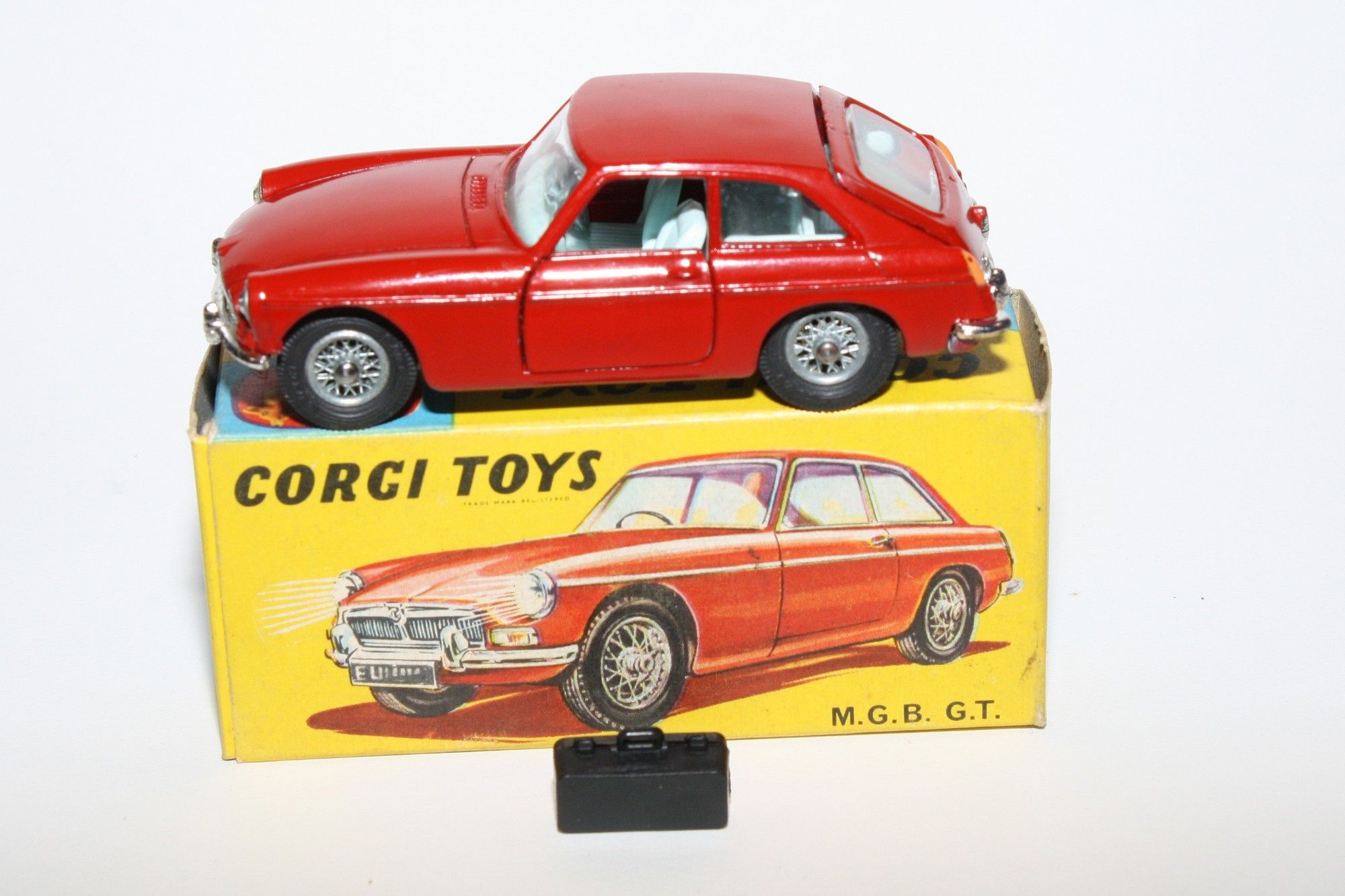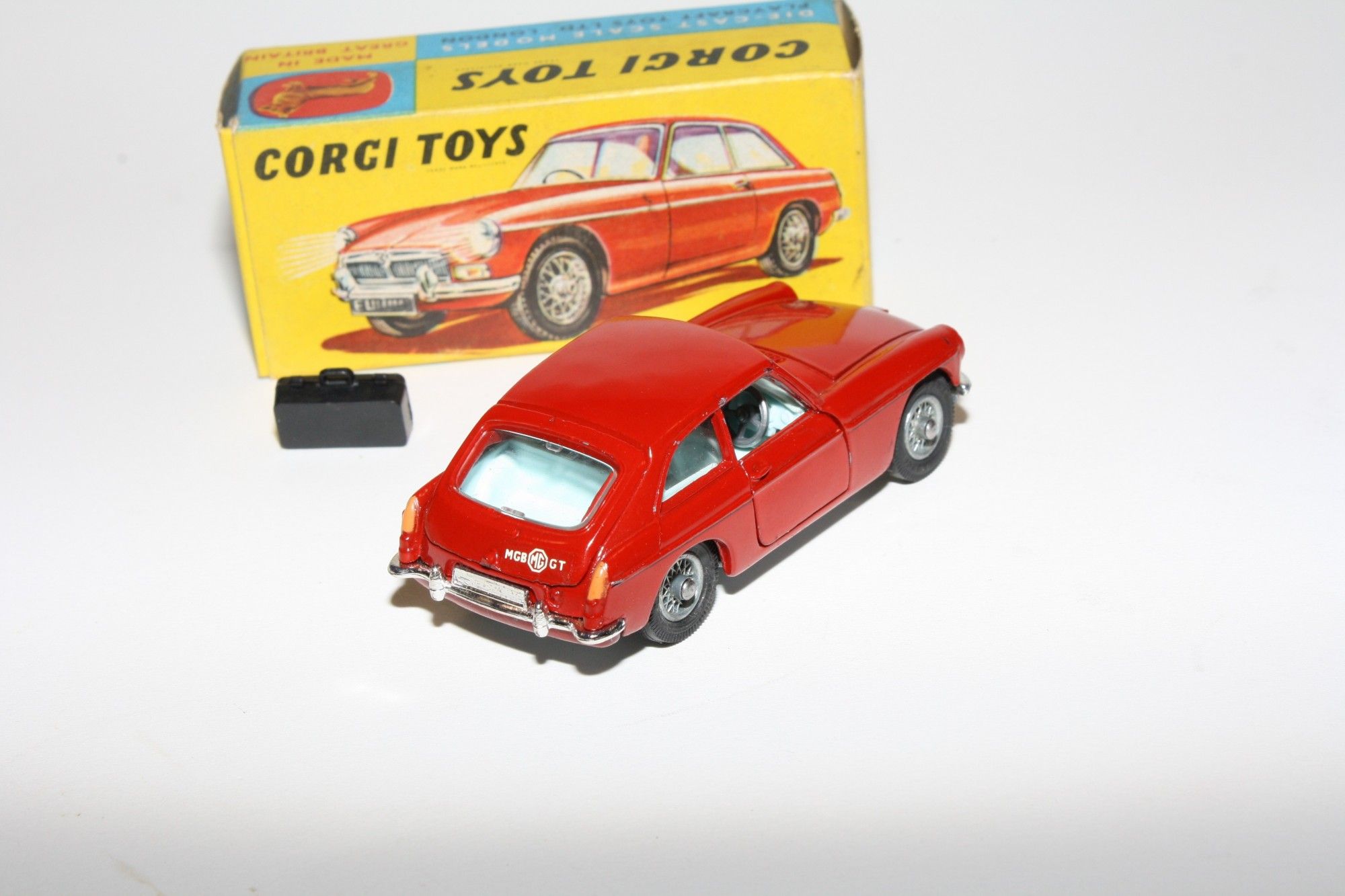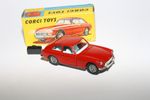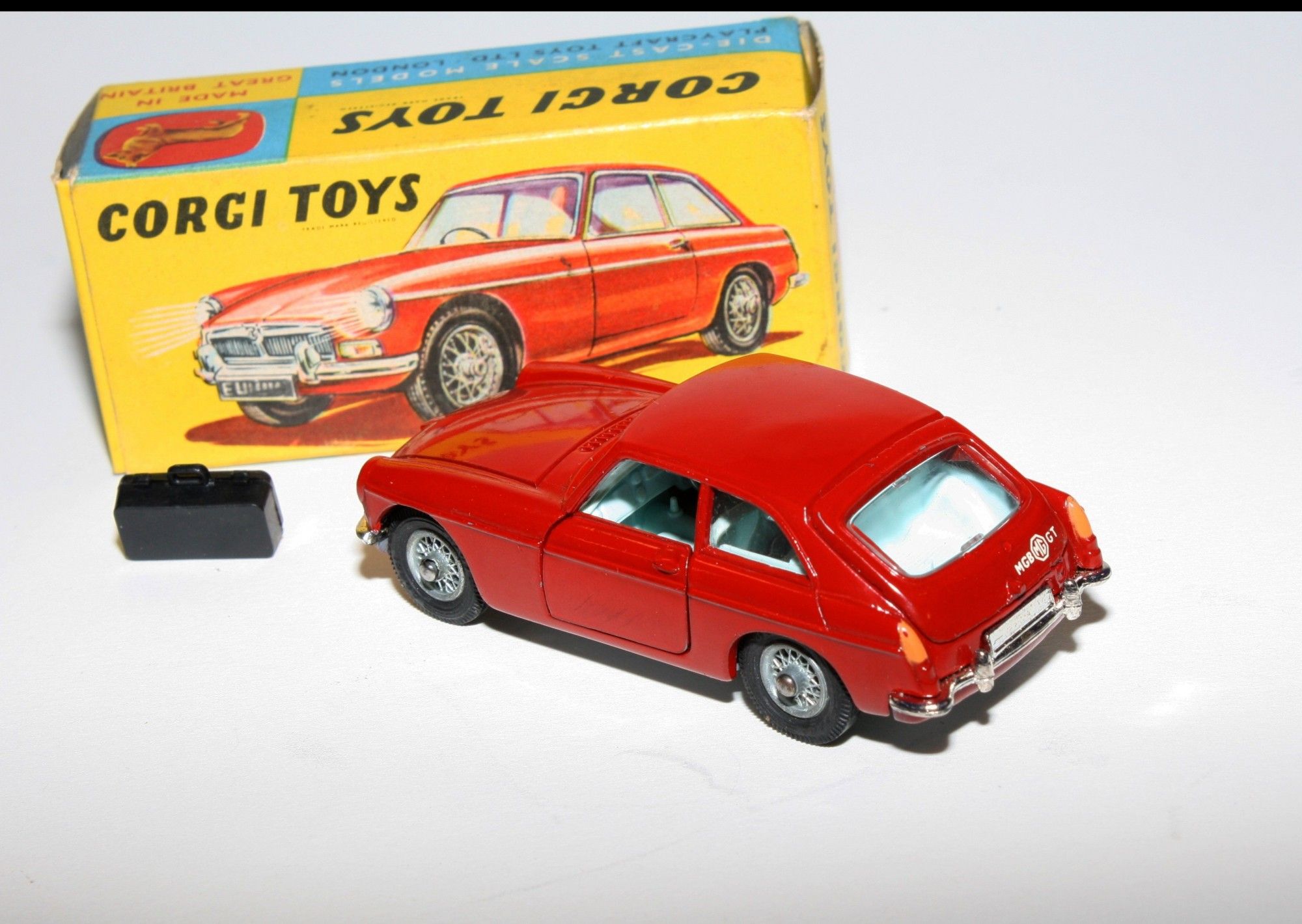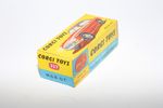A superb example of this Corgi 1960's Corgi. Gleaming original red paintwork is near mint, with just a couple of small chips, please study the high resolution photos for exact condition. Perfect original tyres on spoked hubs, strong suspension, crystal clear windows, perfect pale blue interior with folding seats, jewelled headlights, excellent chrome to bumpers and grill, rear decal perfect, original black suitcase present, underside mint