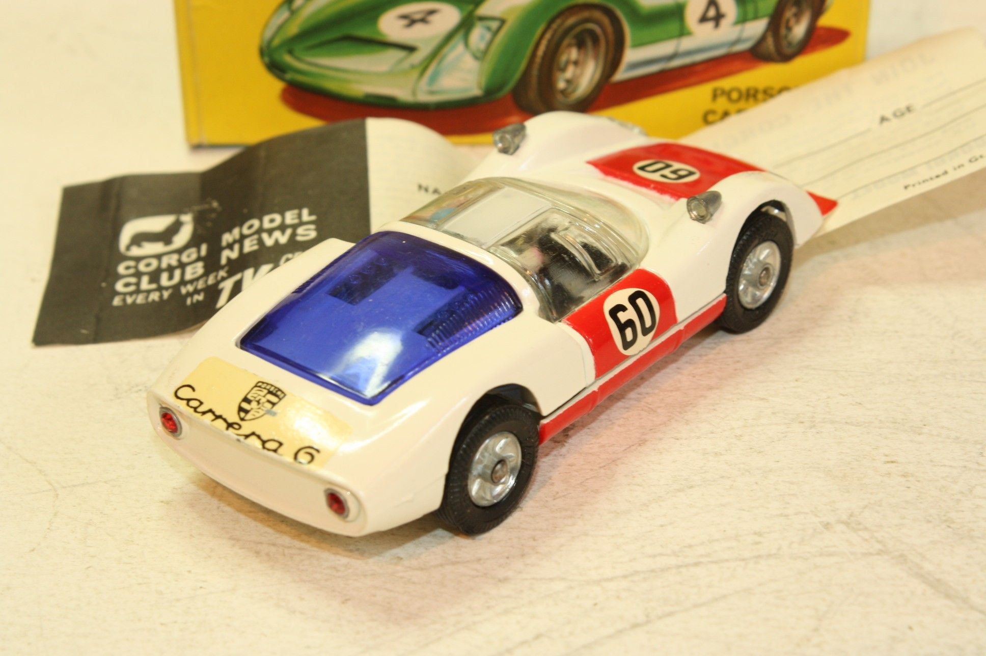 A stunning example of this lovely Corgi. Gleaming original paintwork is mint, please study the high resolution photos for exact condition. Perfect original tyres on cast hubs, excellent suspension, crystal clear windows, blue engine cover, black interior, driver present, excellent plastic light covers and jewelled rears, mirrors present, good complete racing numbers present, excellent mint underside.