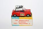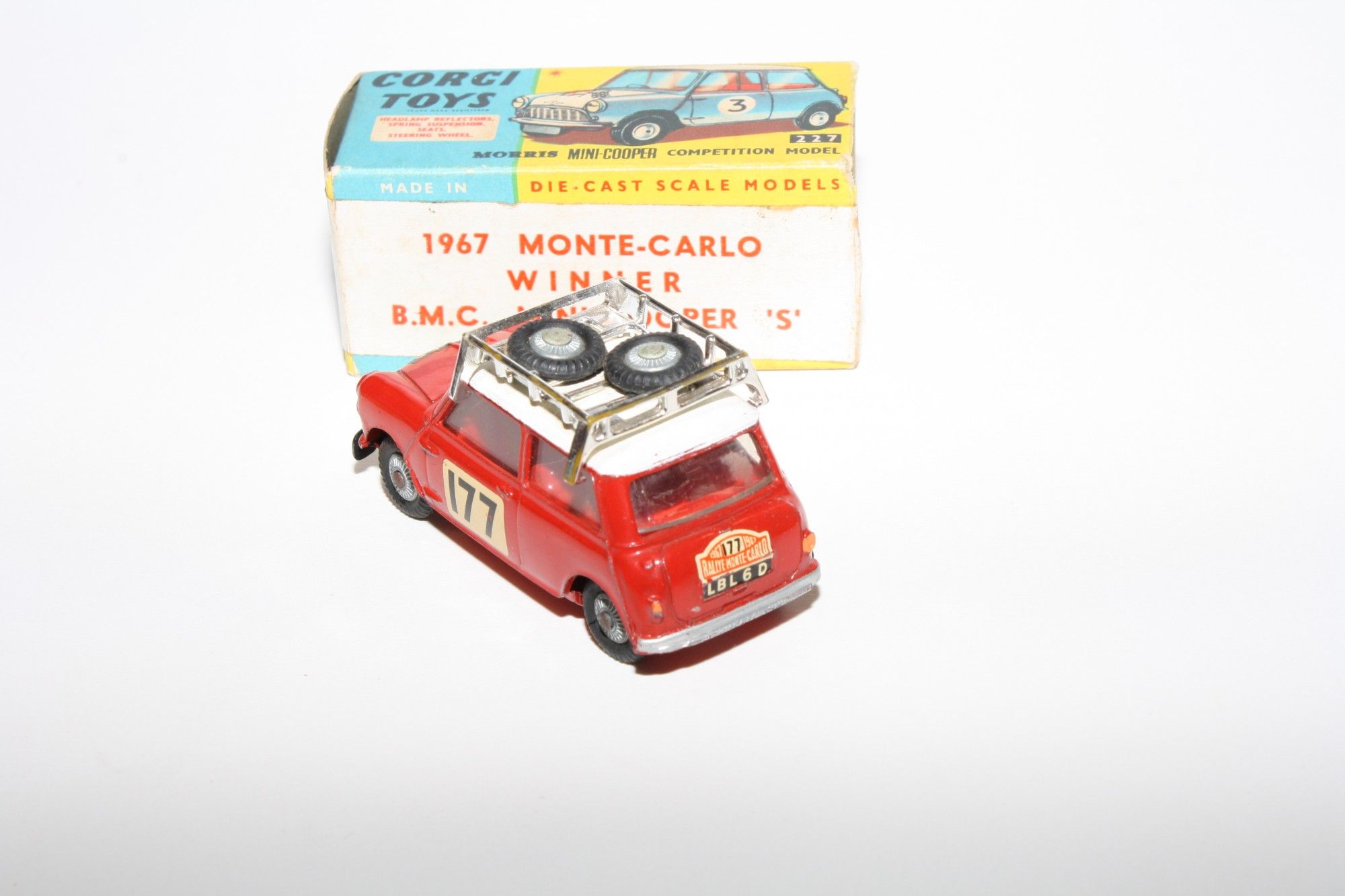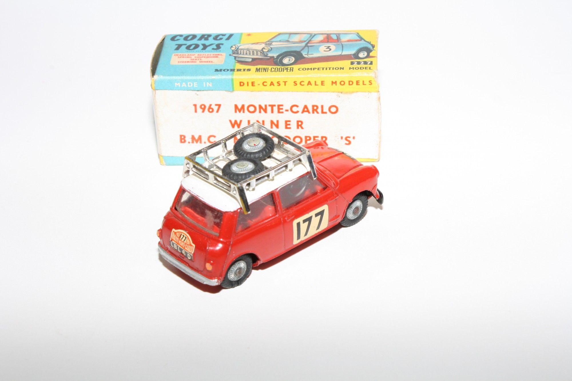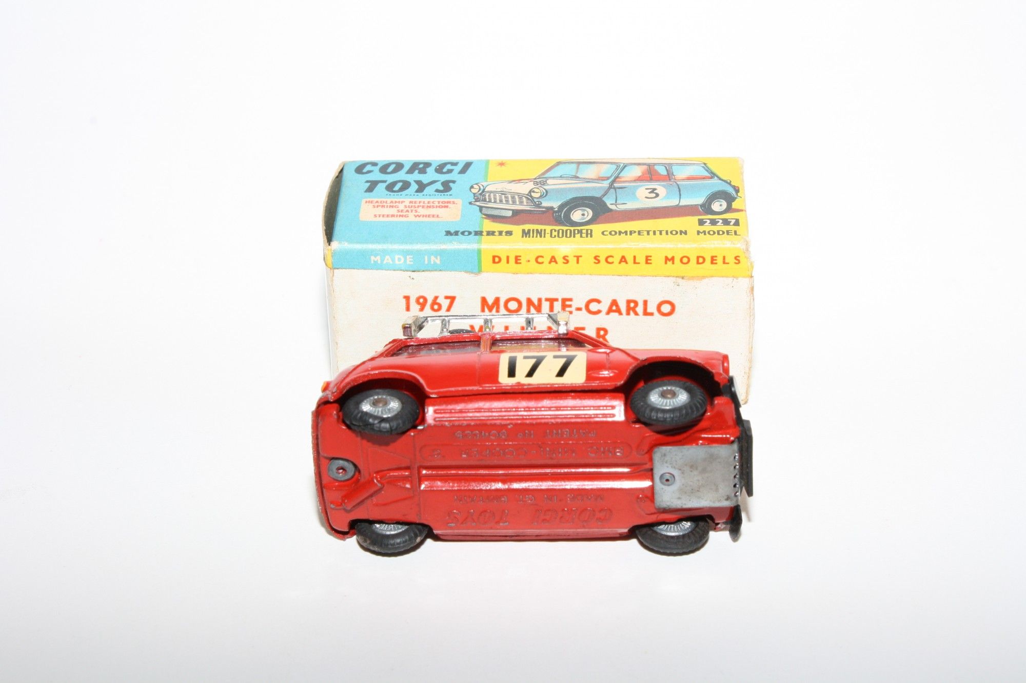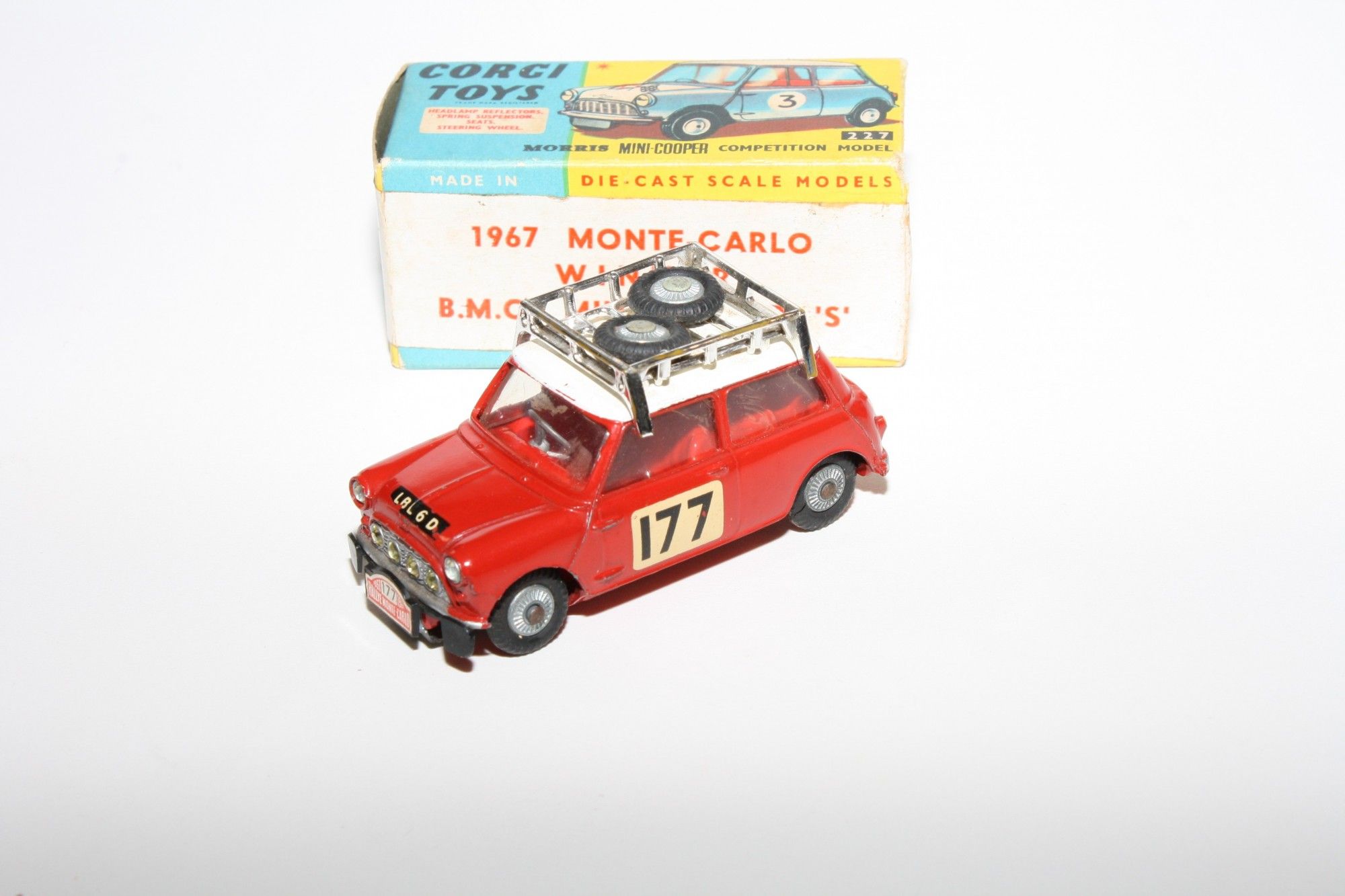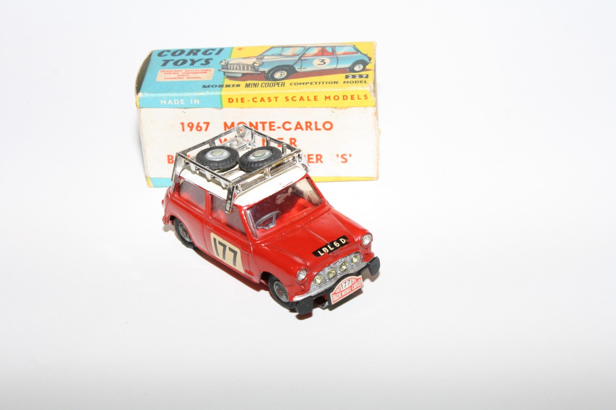 A superb example of this classic Corgi Monte Carlo winner model. Original red and white paintwork is near mint, just a couple of tiny nicks/rubs, please study the high resolution photos for exact condition. Original tyres on cast hubs, free rolling axles, great suspension, crystal clear windows and red interior, roof rack intact,with spare wheels, original decals present and all jewelled lights and mint baseplate.