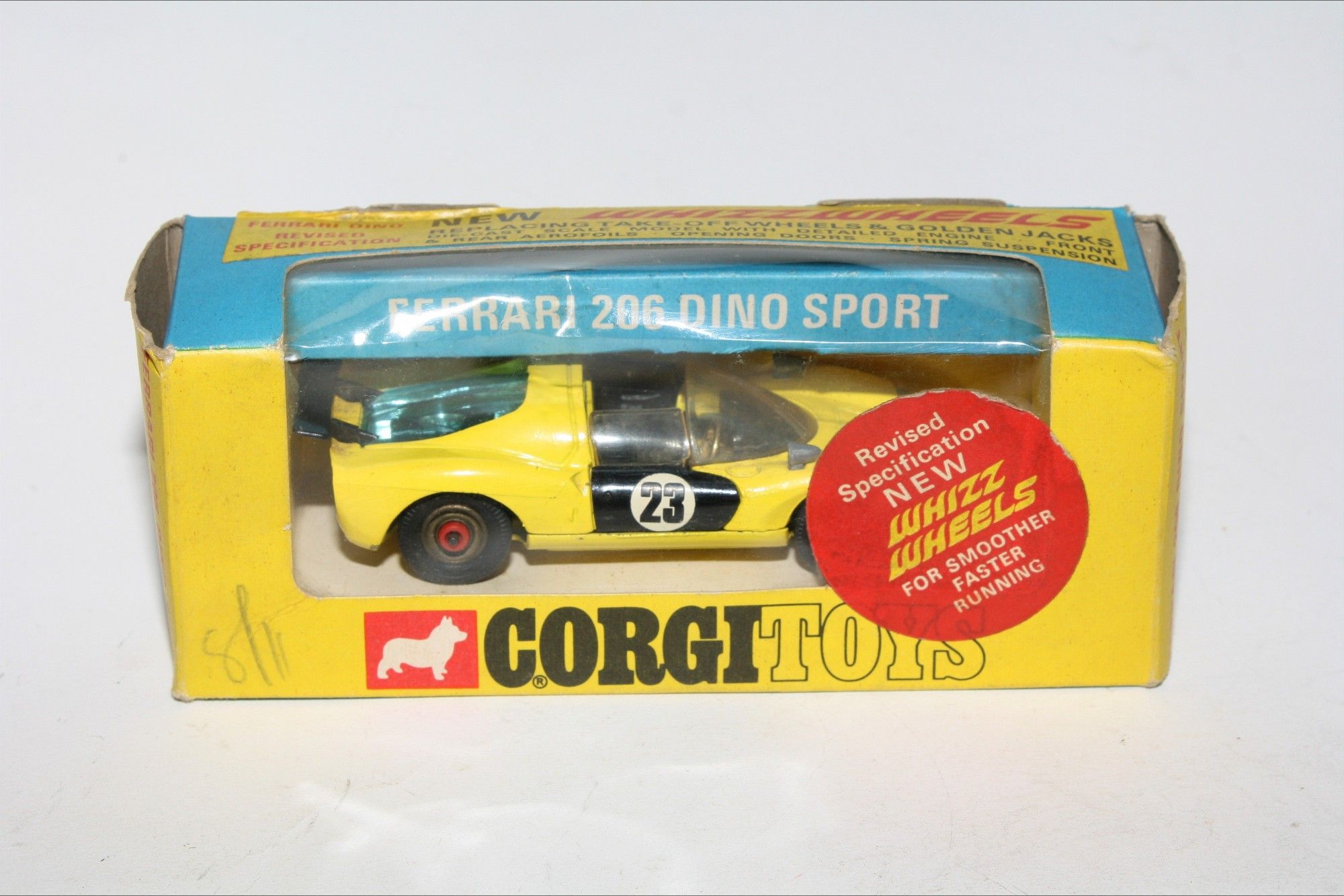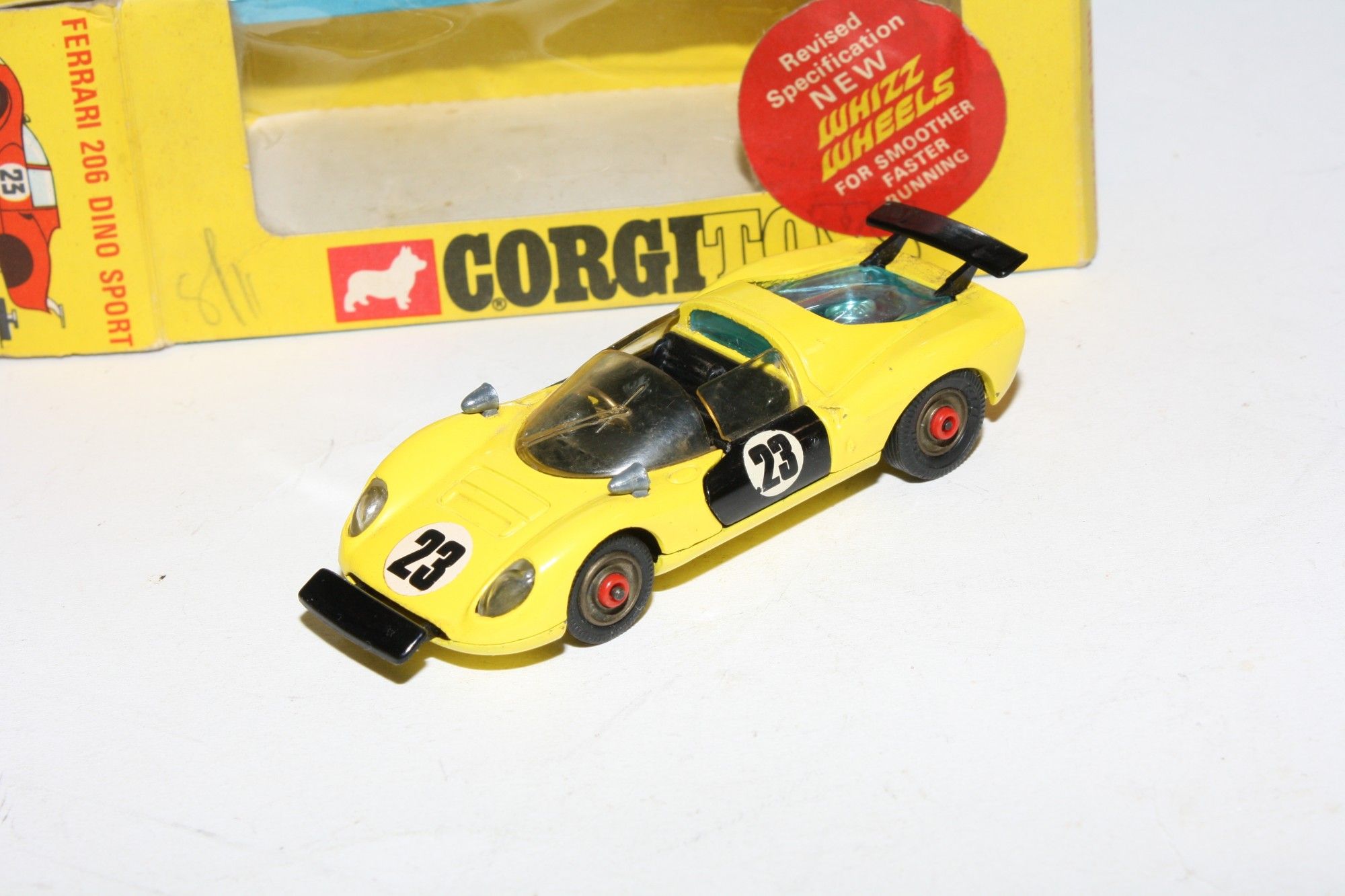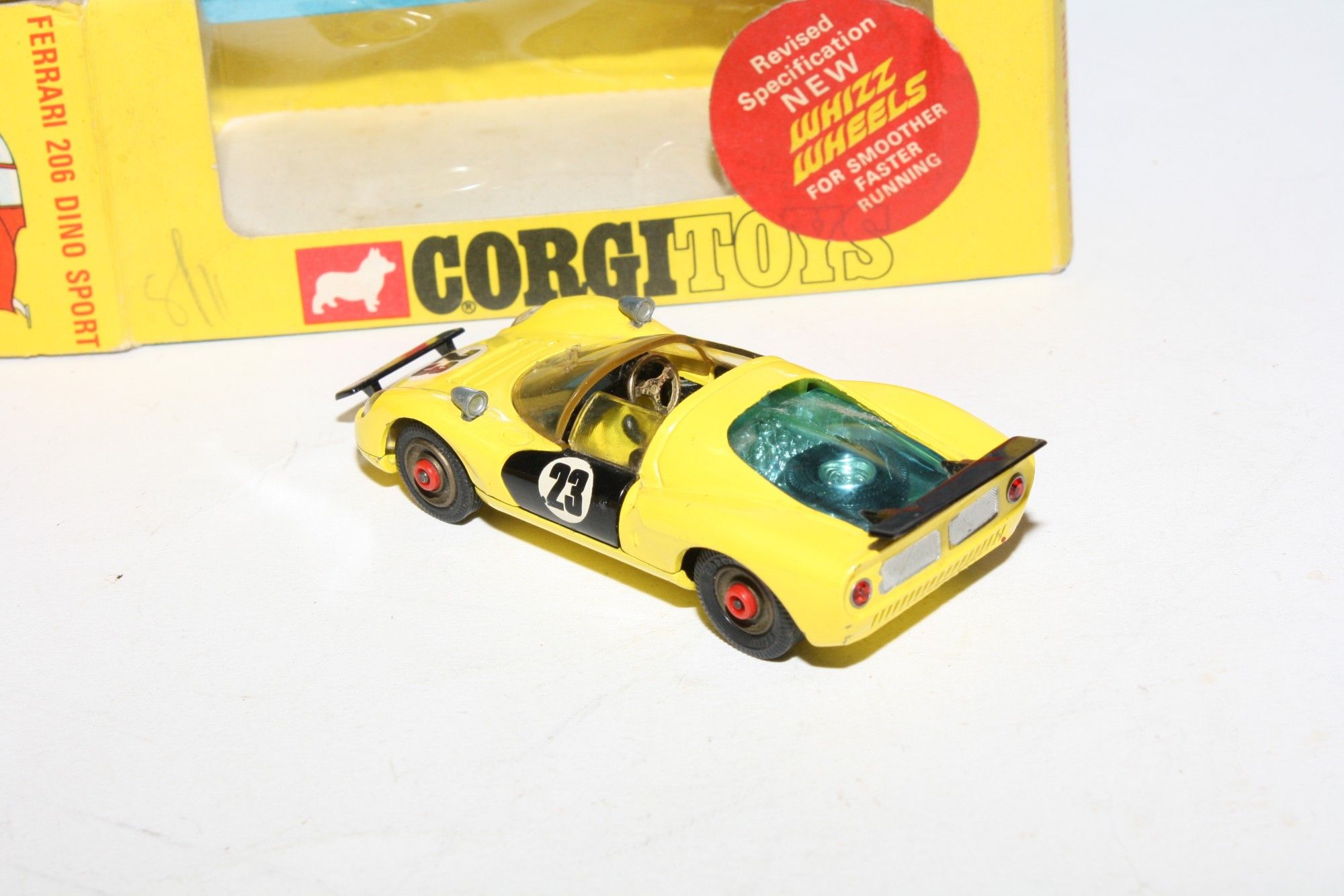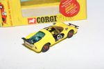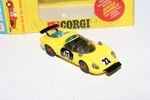 A very nice example of this Corgi model. Original yellow paintwork is near mint with a few small nicks, please study the photos for exact condition. Good tyres on original red spot hubs, good windows, black interior, racing numbers good, jewelled rear lights, underside excellent.