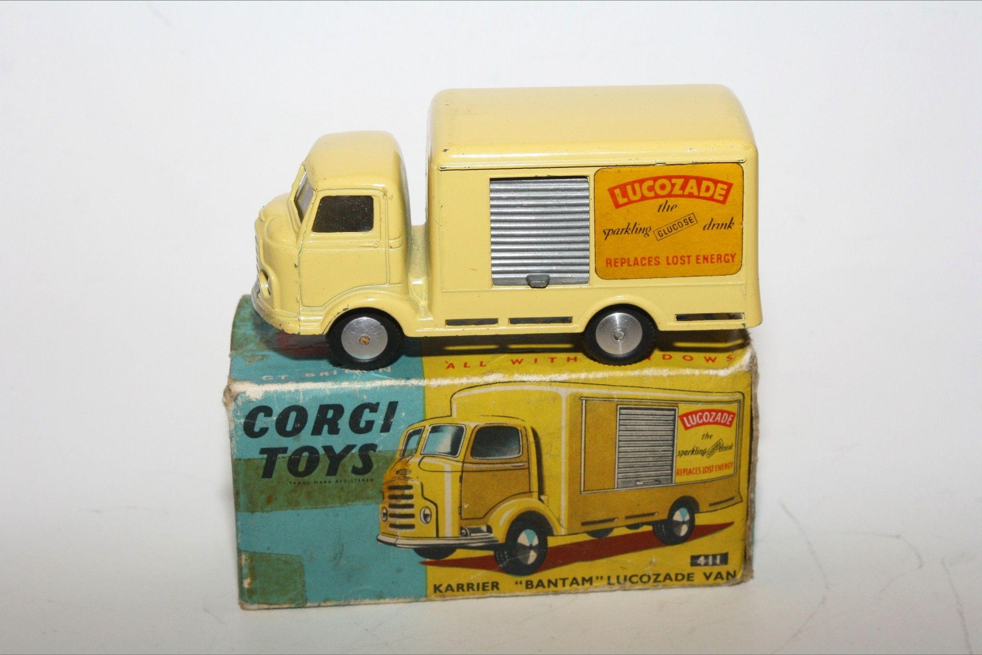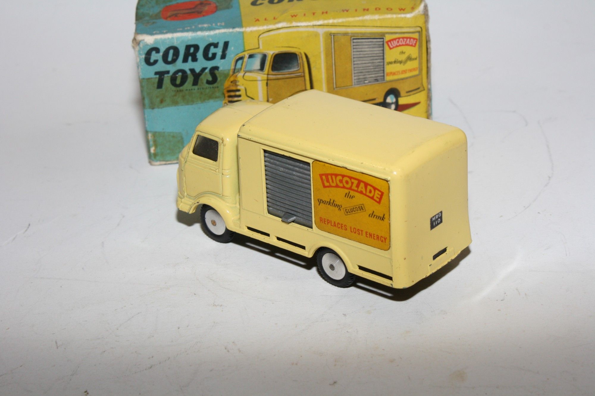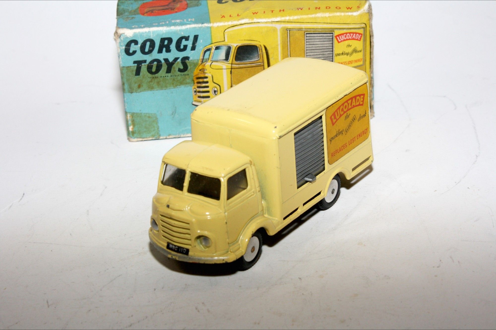 A lovely example of this early issue Corgi model. Gleaming paintwork is near mint with just a few small fleabite nicks, please study the photos for exact condition. All original tyres on early smooth hubs, straight axles, crystal clear windows, good Lucozade livery stickers, roller door all good, mint (black)underside.