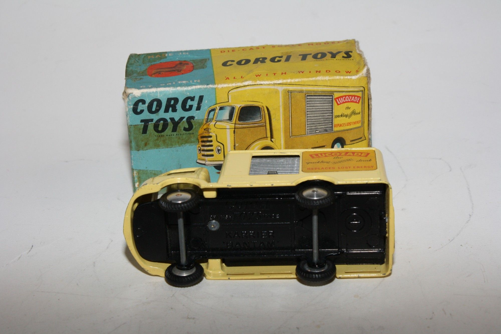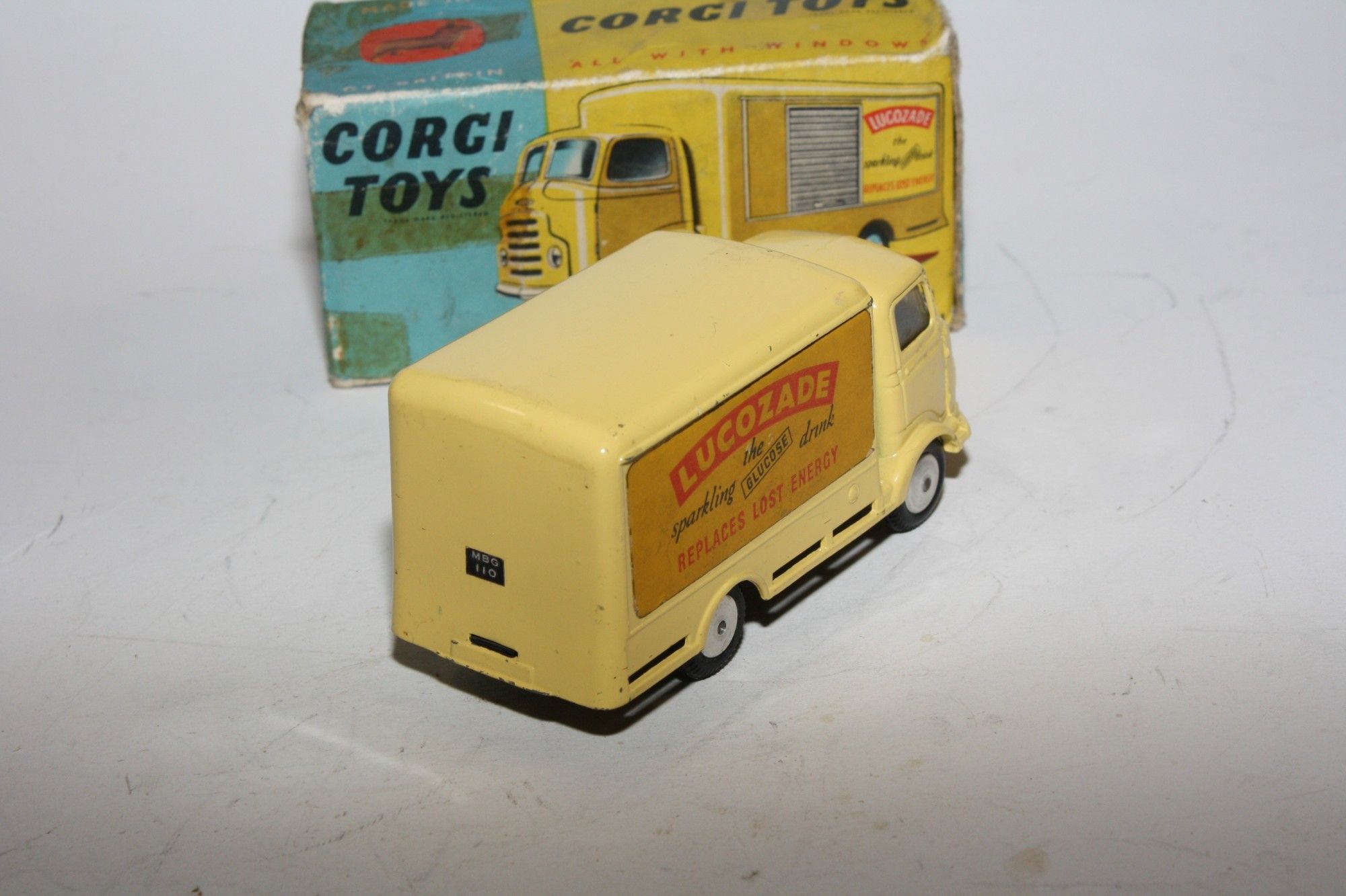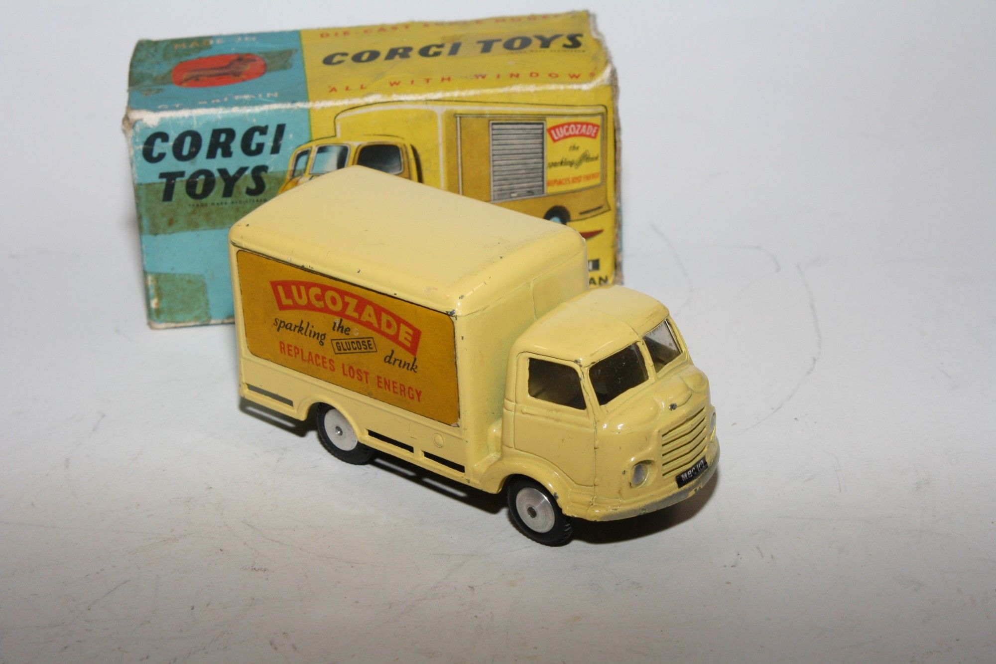 A lovely example of this early issue Corgi model. Gleaming paintwork is near mint with just a few small fleabite nicks, please study the photos for exact condition. All original tyres on early smooth hubs, straight axles, crystal clear windows, good Lucozade livery stickers, roller door all good, mint (black)underside.