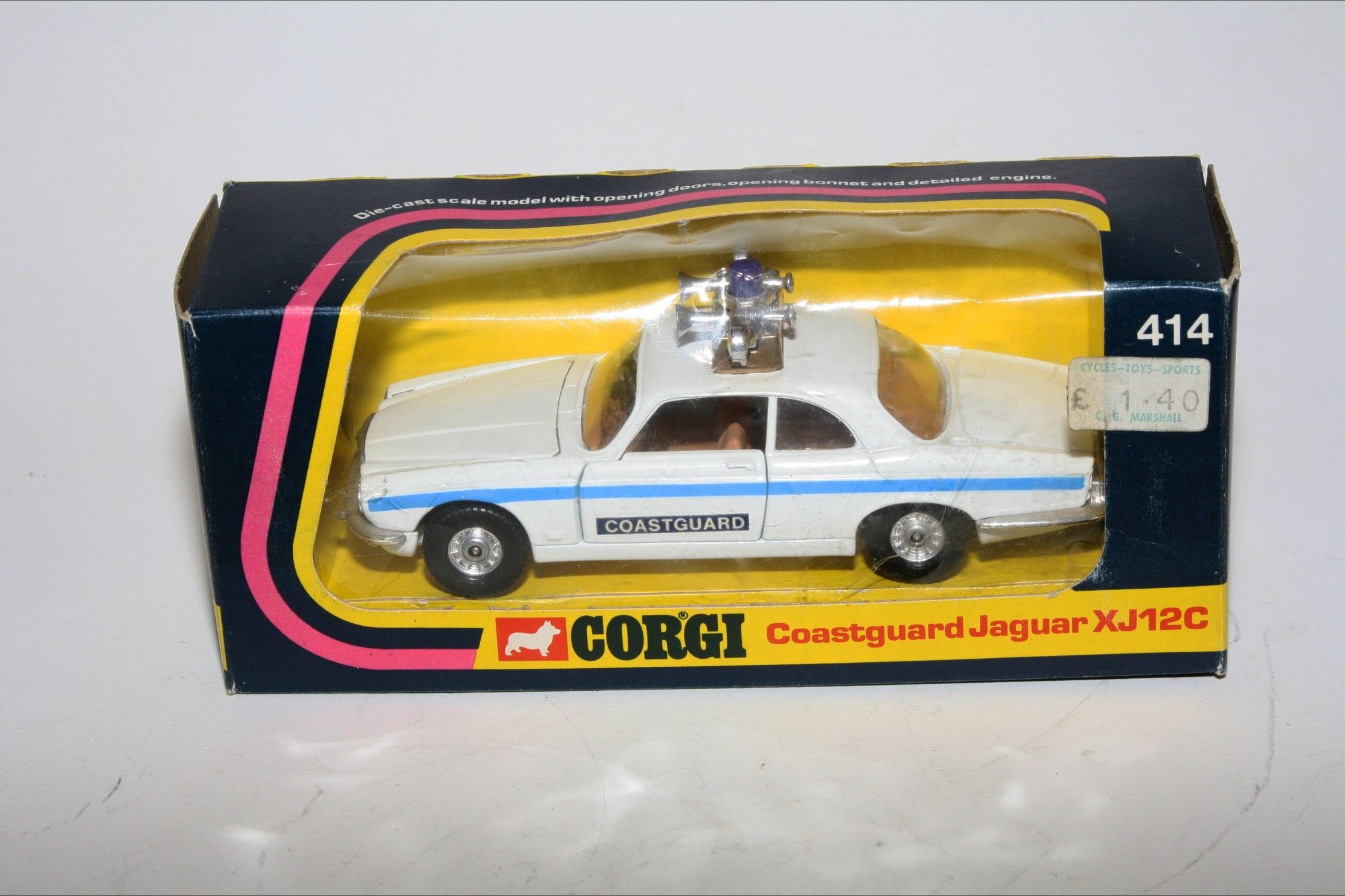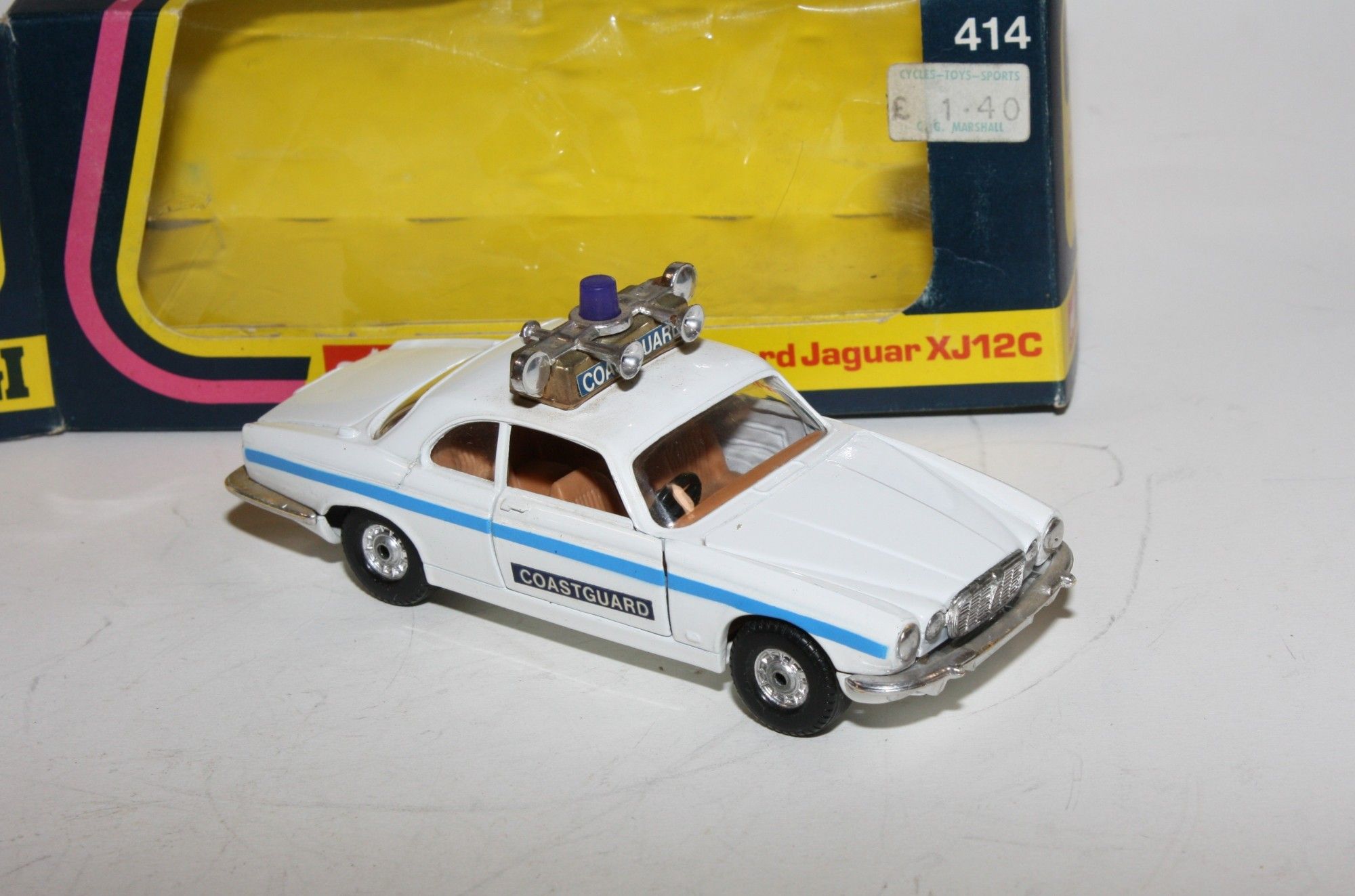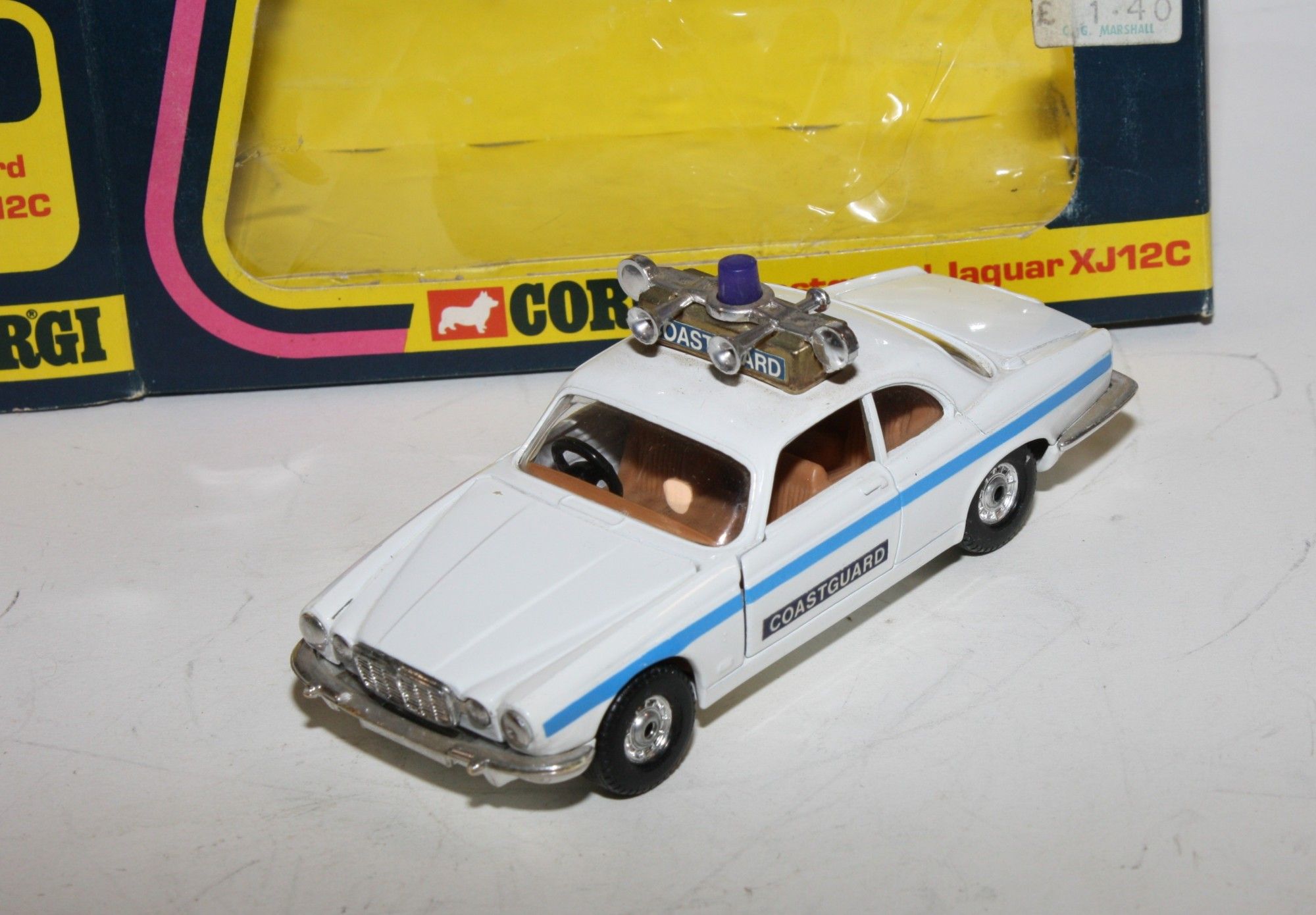 A super example of this Corgi model. Gleaming white original paintwork is virtually mint, please study the photo for exact condition. Good chrome wheels and free rolling axles, crystal clear windows, tan interior, perfect blue stripes and Coastguard door stickers, roof sign, beacon and horns all fine. Opening door and bonnet. Mint underside.