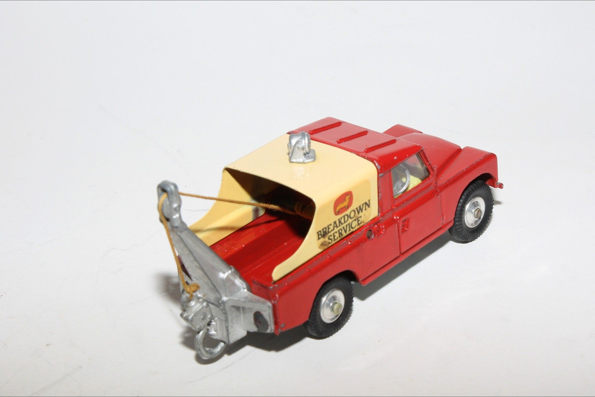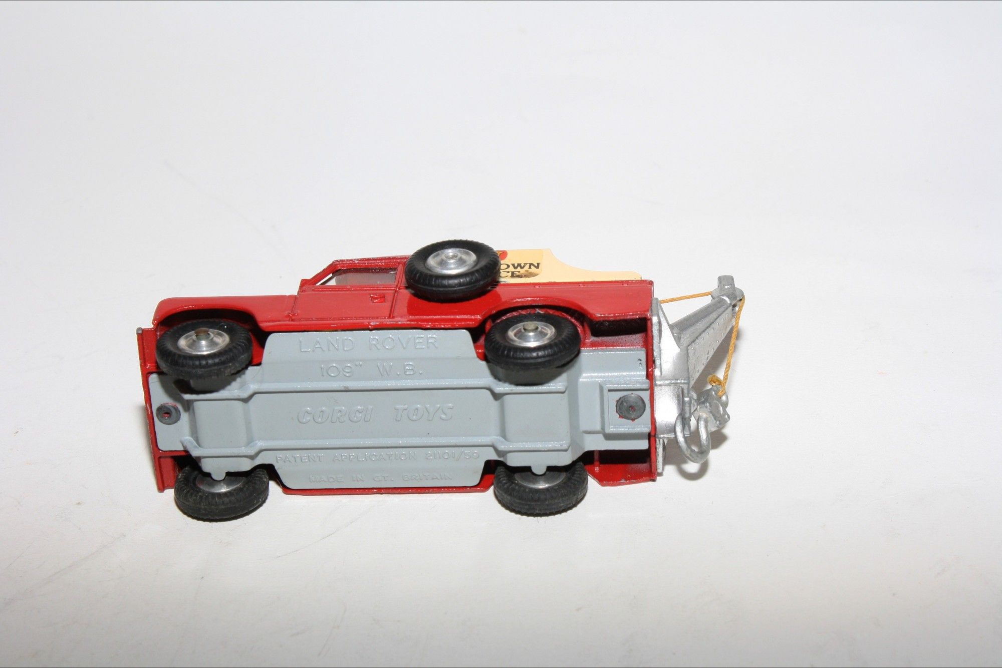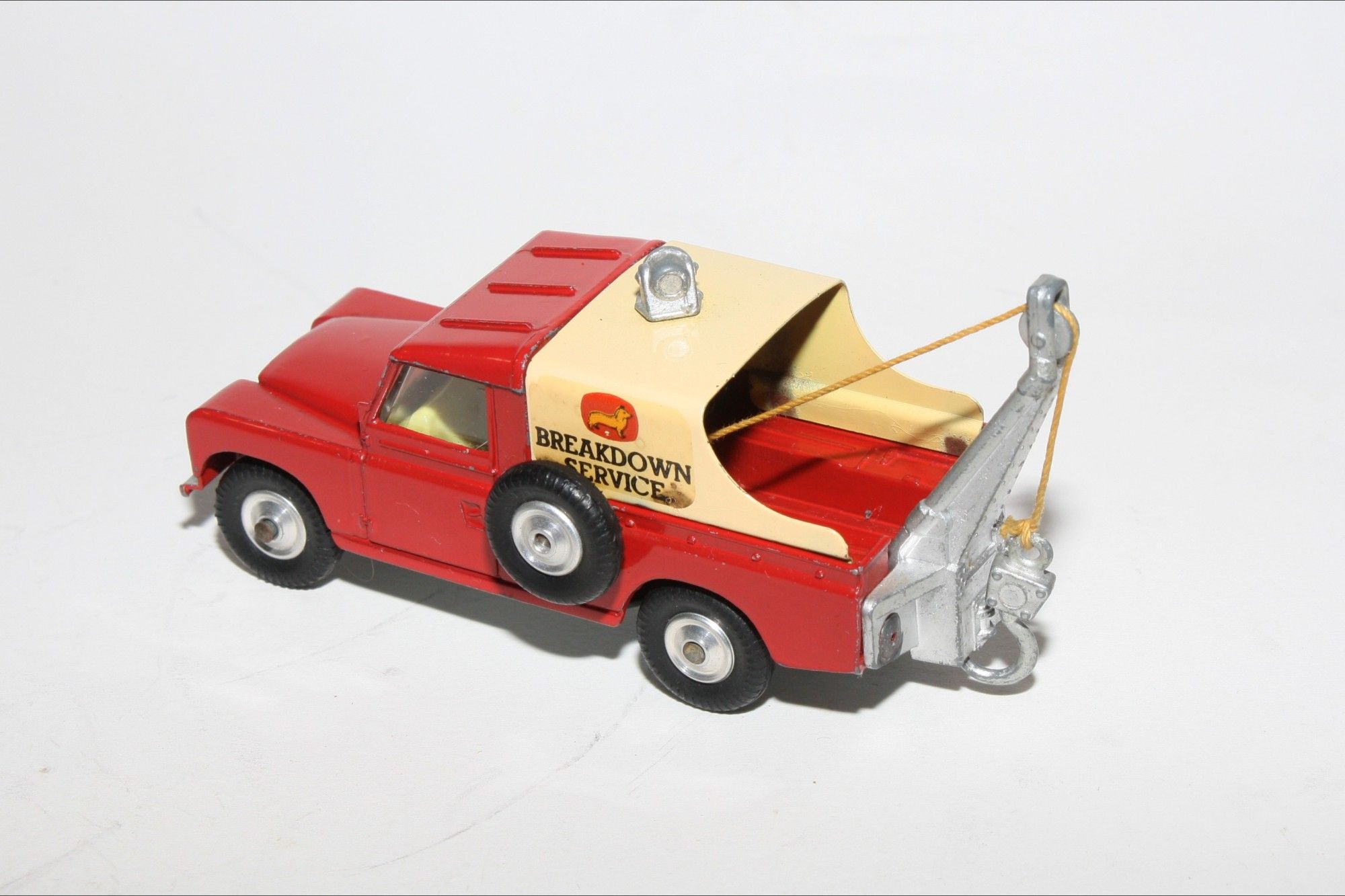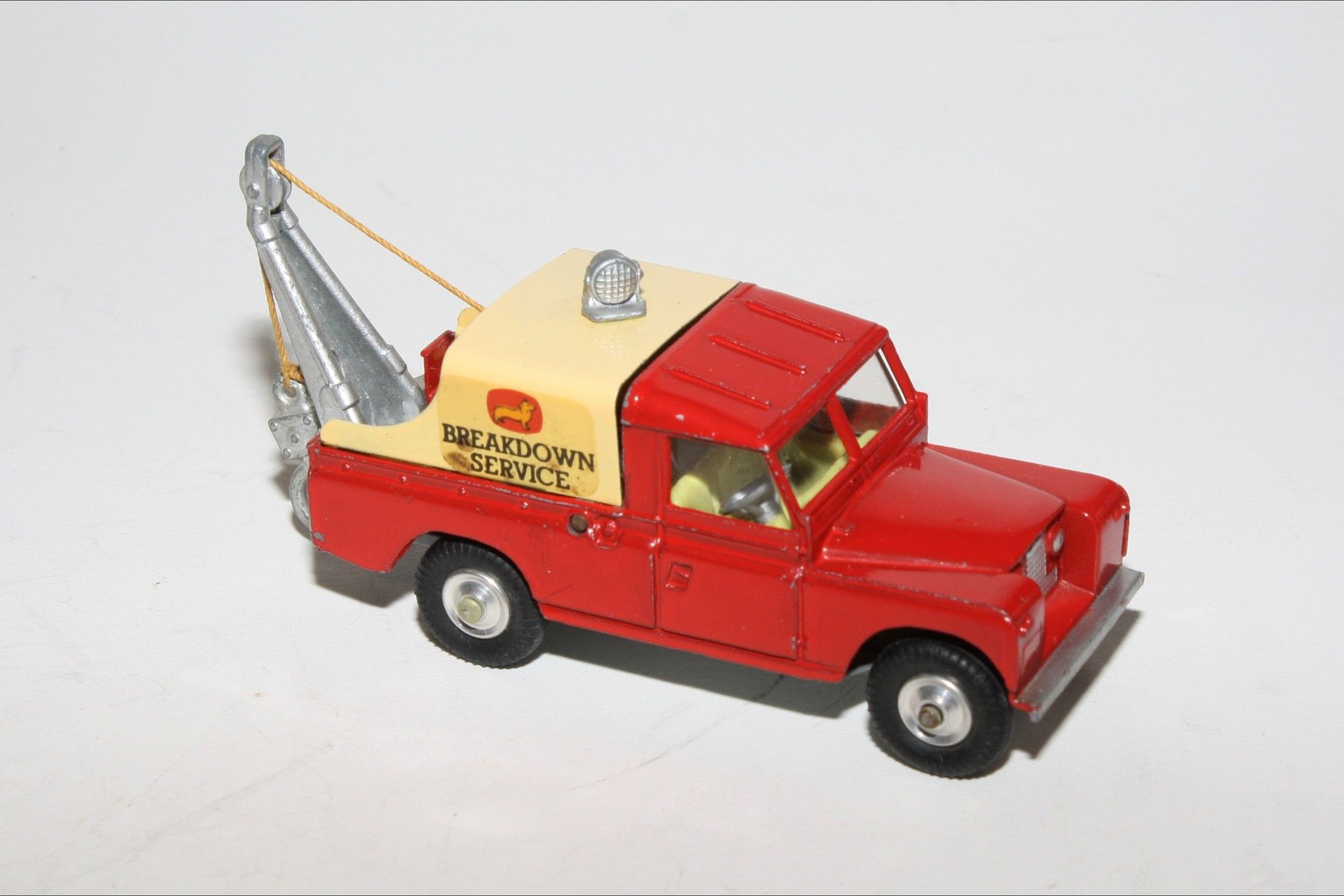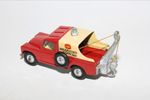 A nice example of this hard to find transitional version Corgi model. Gleaming original red paintwork is excellent with a few flea bite nicks, please study the high resolution photos for exact condition. Perfect original tyres on shaped hubs, good suspension, crystal clear windows, yellow interior, tin tilt with good stickers, hook and original cord all present, very good grey underside.