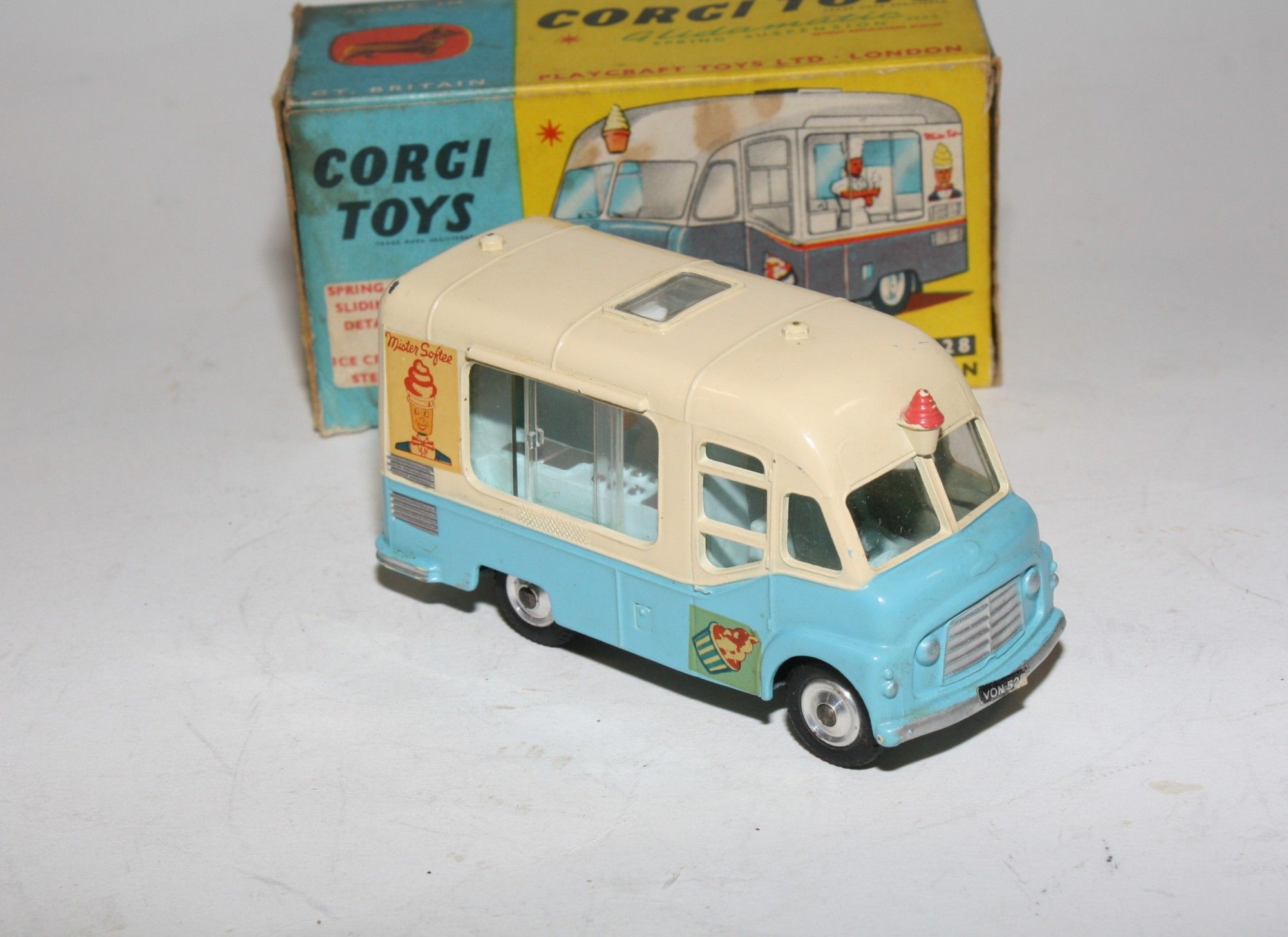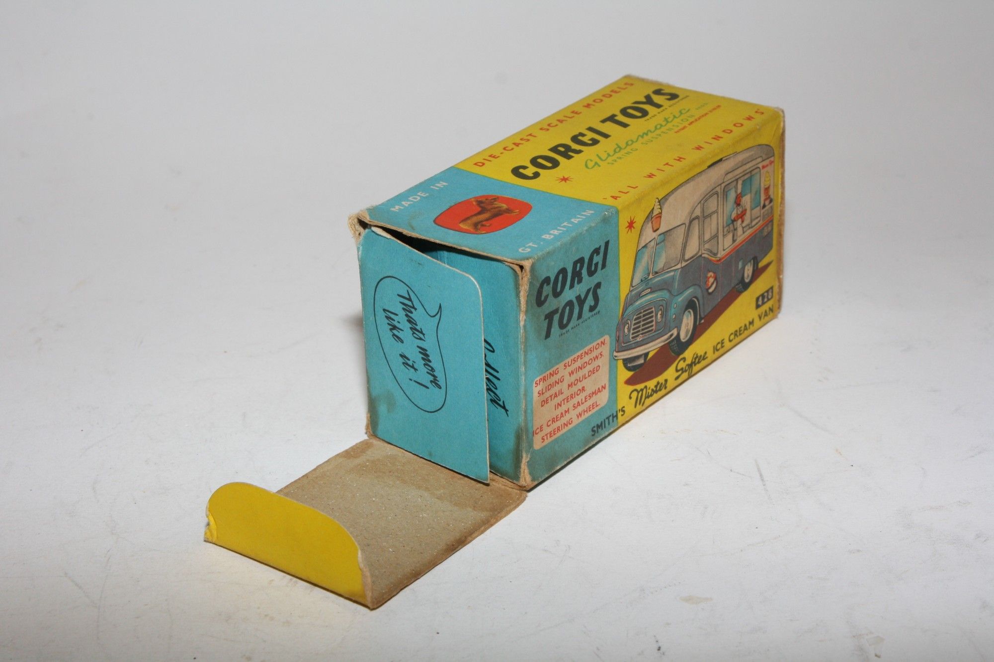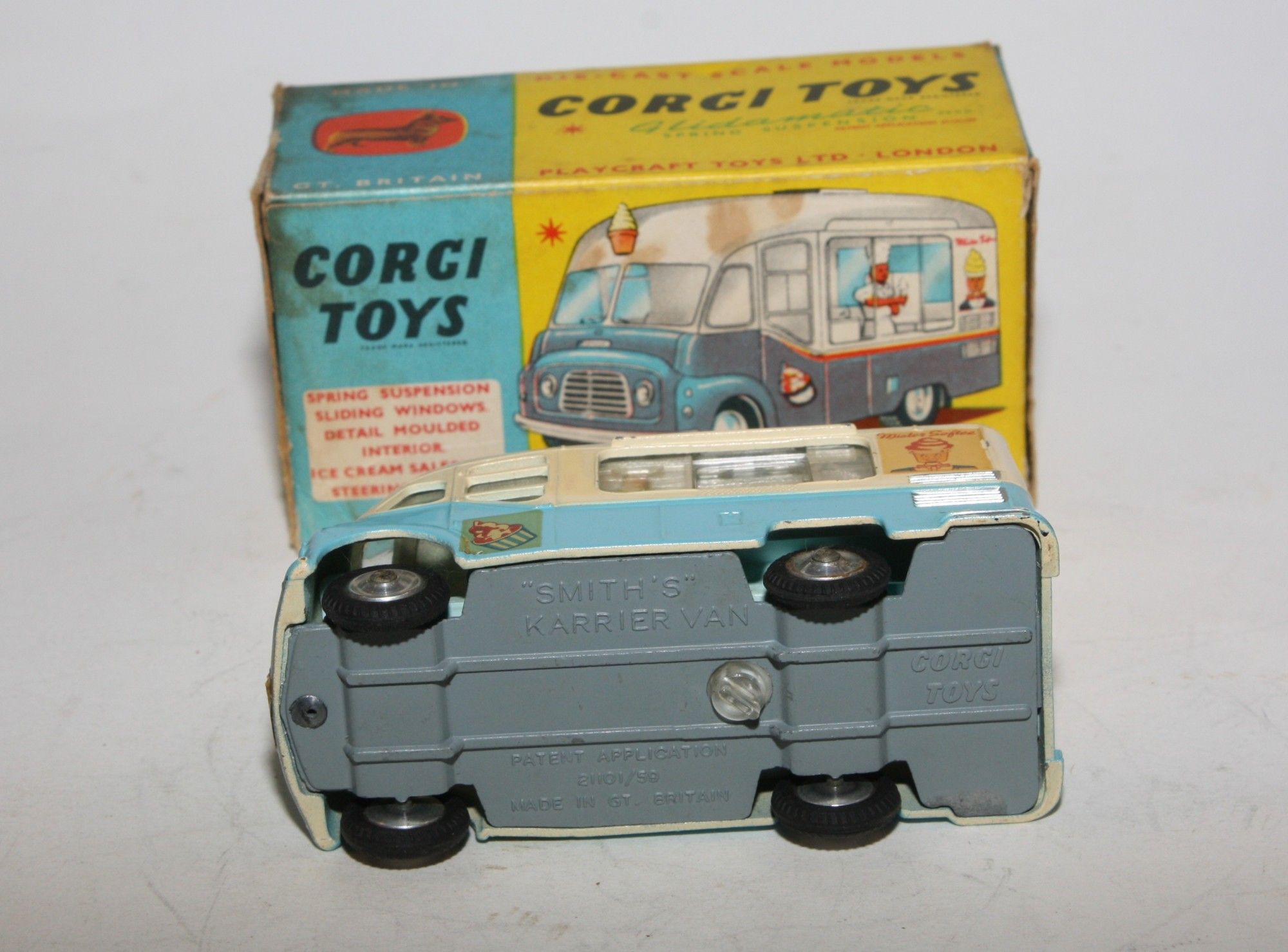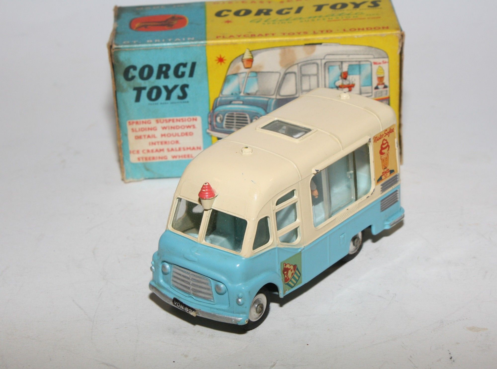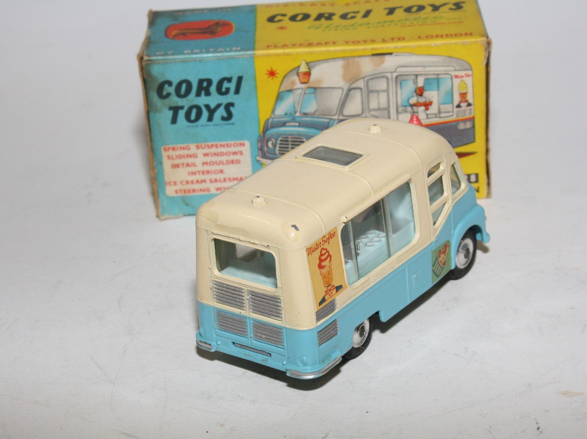 A very nice example of this sort after Corgi. Original two tone paint is excellent but with some small chips & some touch in to roof , please study the photos for exact condition. Good original tyres on spun hubs, excellent suspension, perfect interior, windows including sliding sides, mint original decals, rotating figure present and moving fine, grey mint underside.
