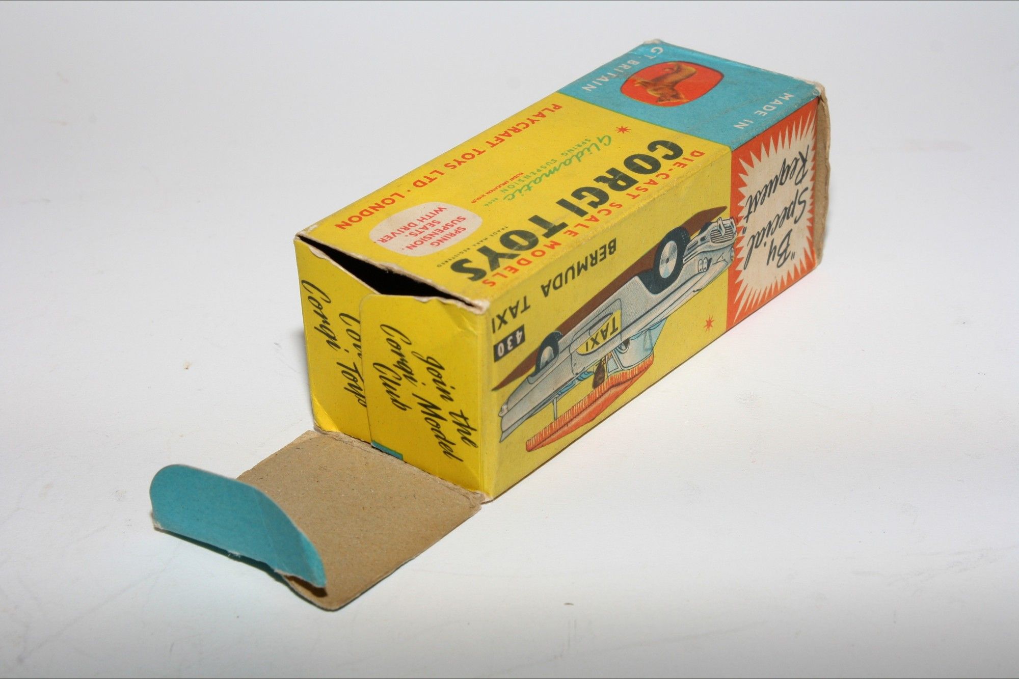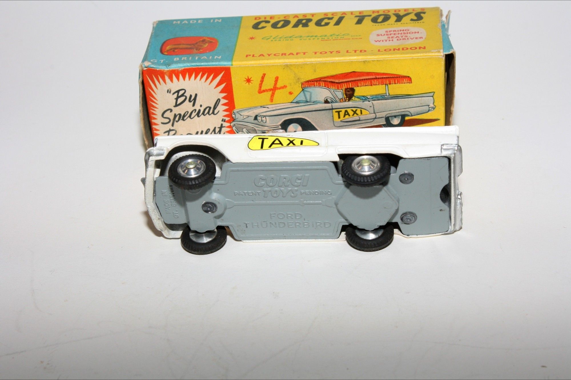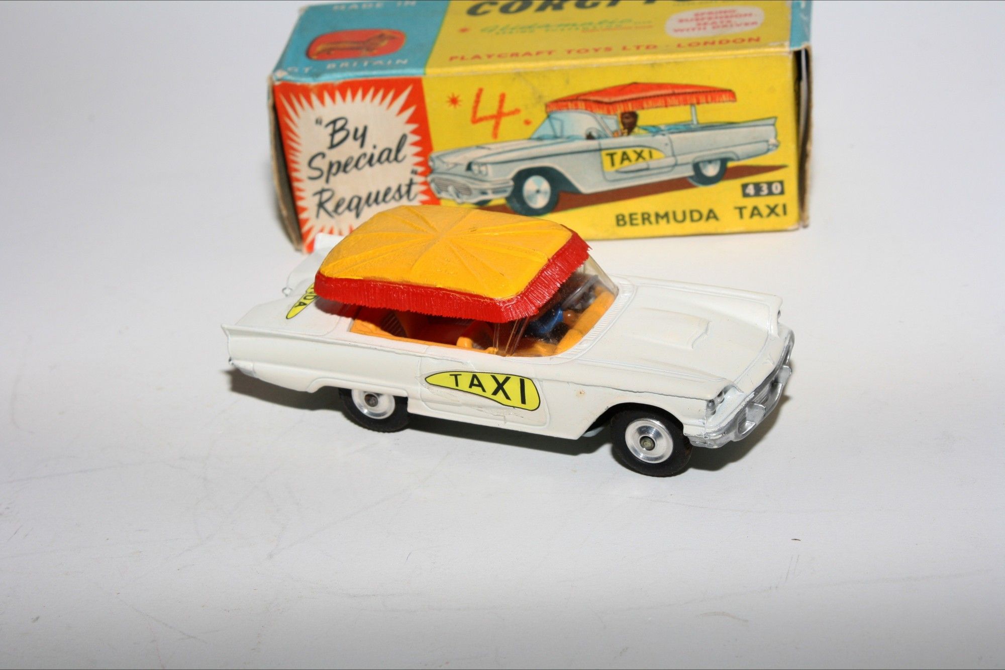 A lovely example of this early 1960's Corgi. Gleaming original white paintwork is mint, please study the photos for exact condition. Original tyres are perfect on spun hubs, perfect crystal clear windscreen with yellow interior and original driver figure. Plastic canopy is intact and all original decals are mint. Excellent grey baseplate.