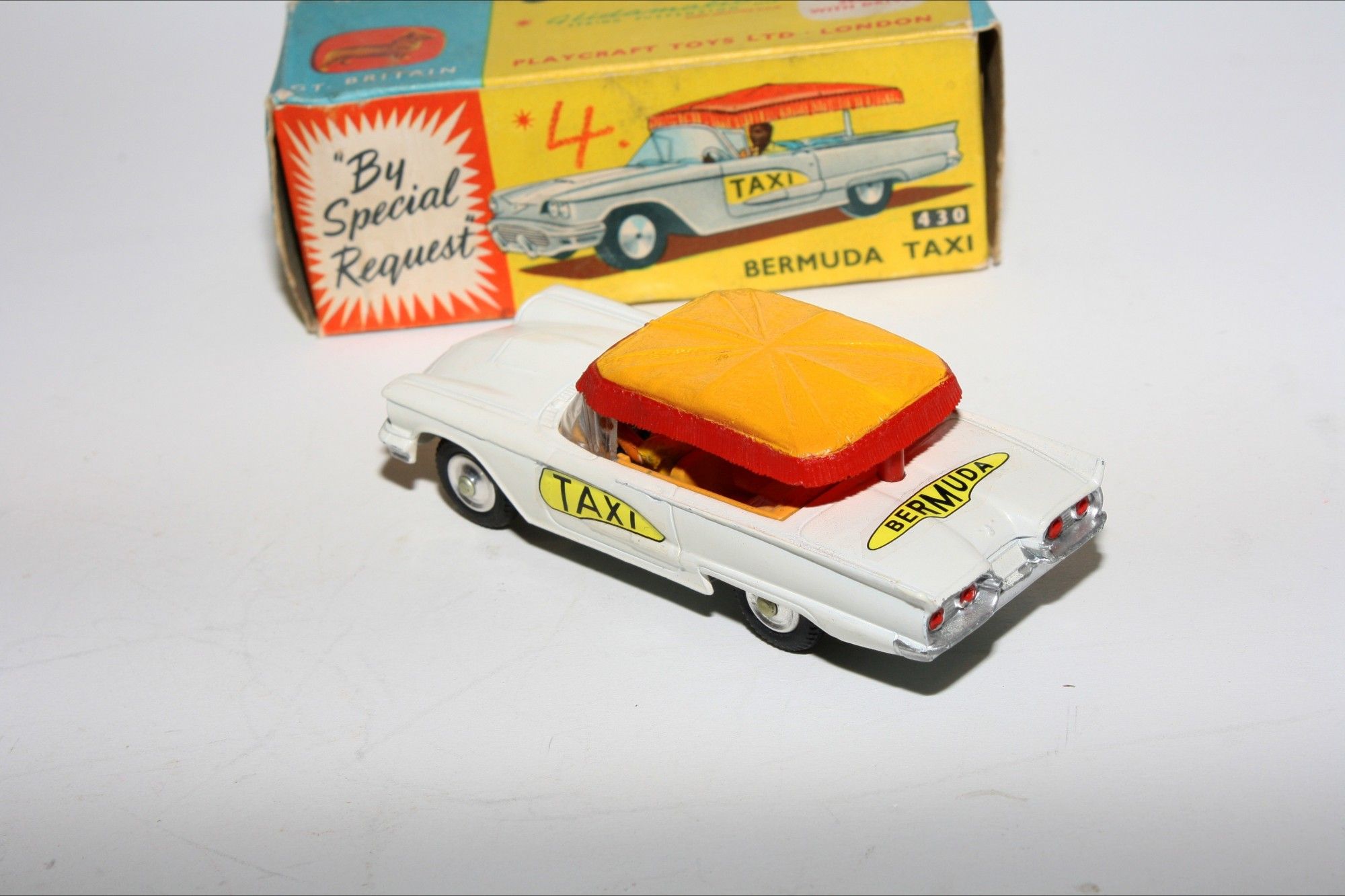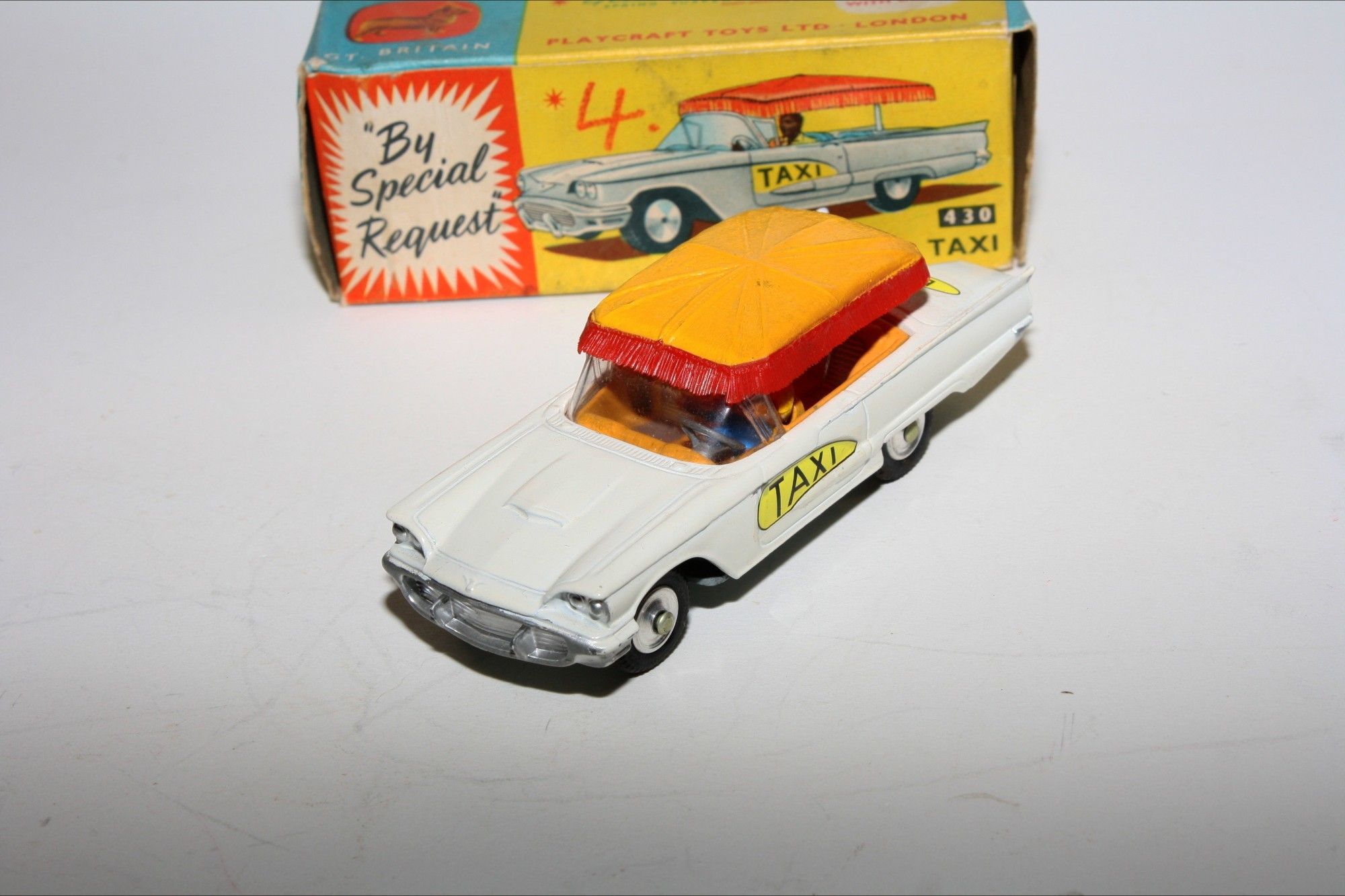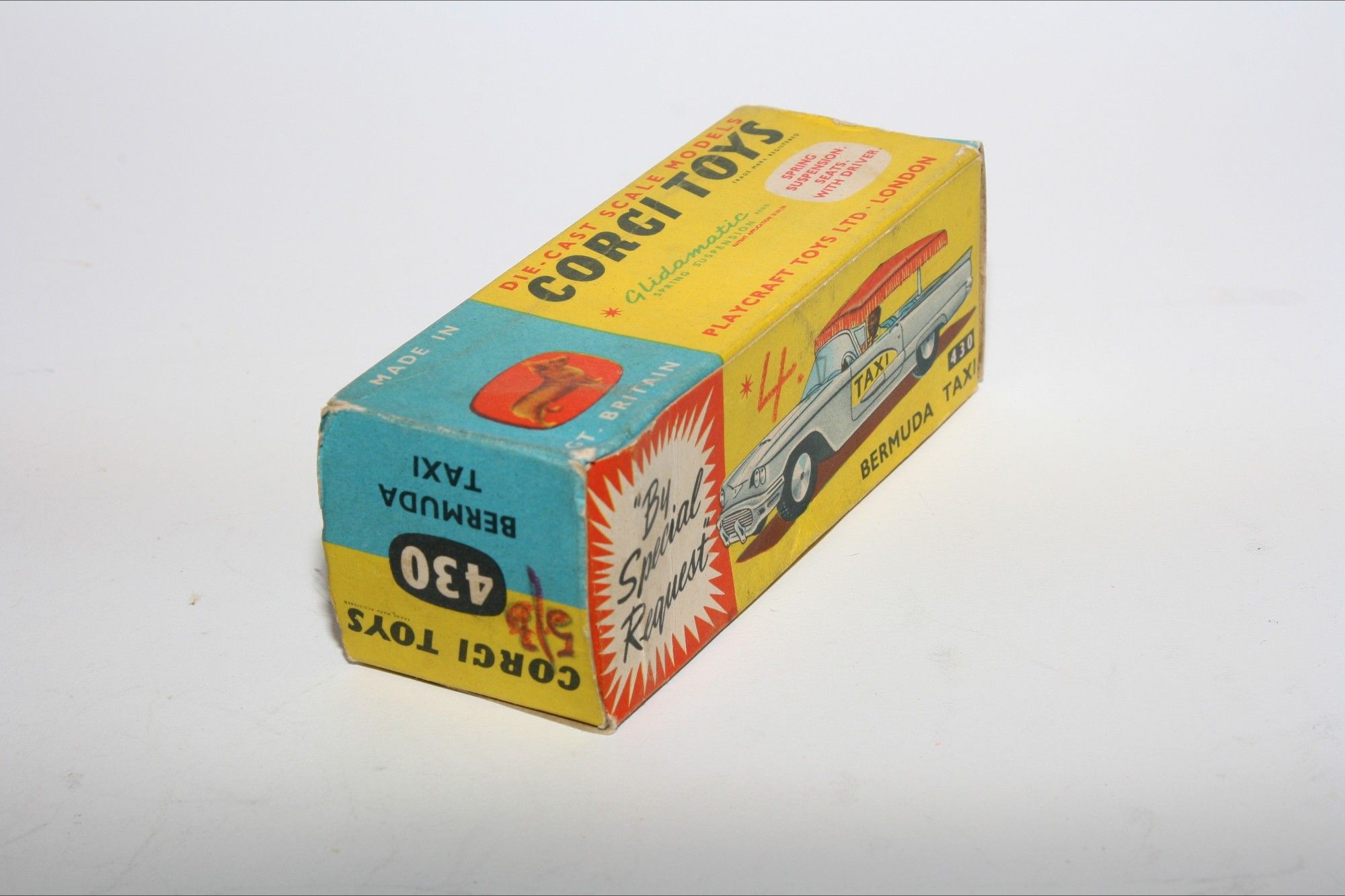 A lovely example of this early 1960's Corgi. Gleaming original white paintwork is mint, please study the photos for exact condition. Original tyres are perfect on spun hubs, perfect crystal clear windscreen with yellow interior and original driver figure. Plastic canopy is intact and all original decals are mint. Excellent grey baseplate.