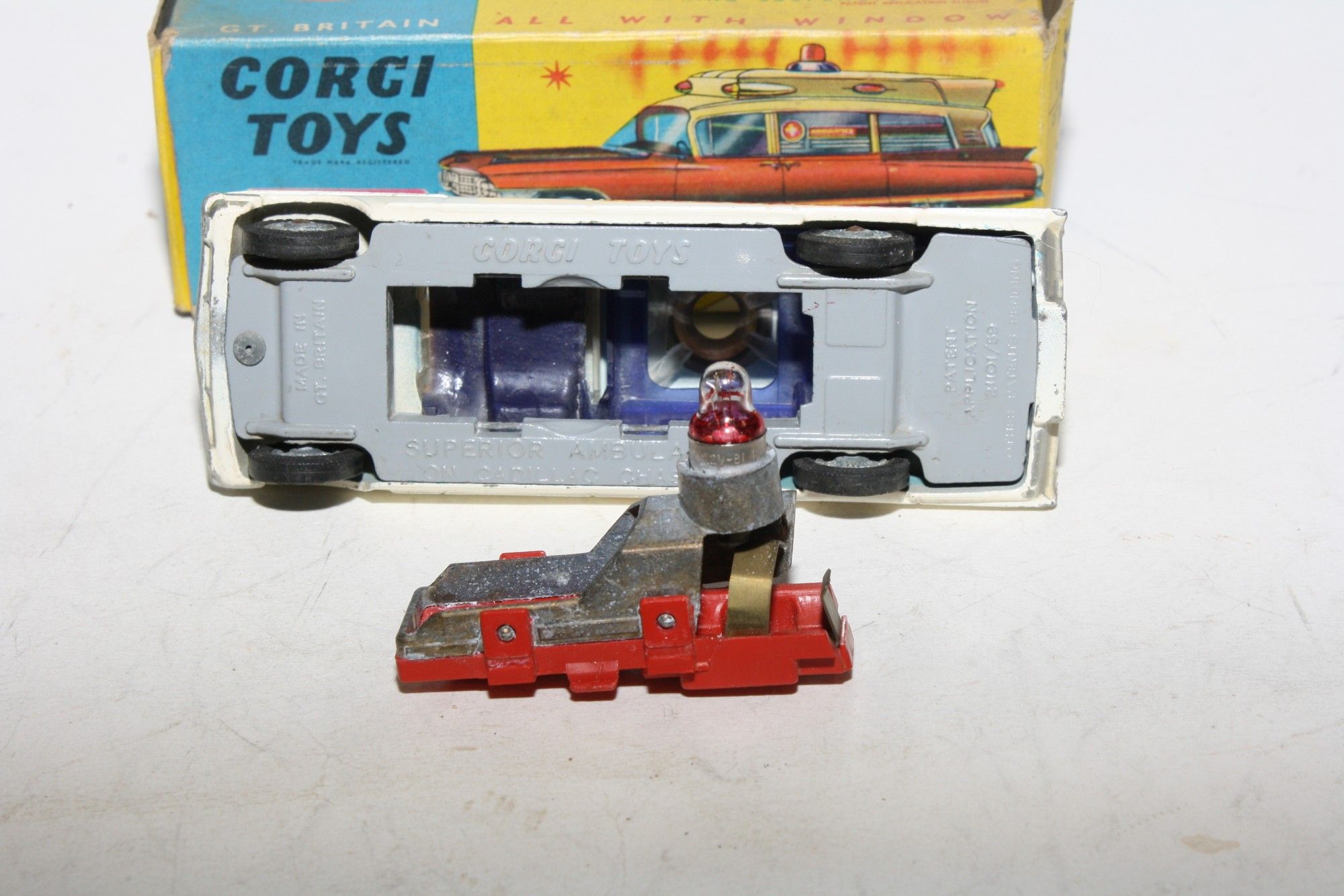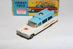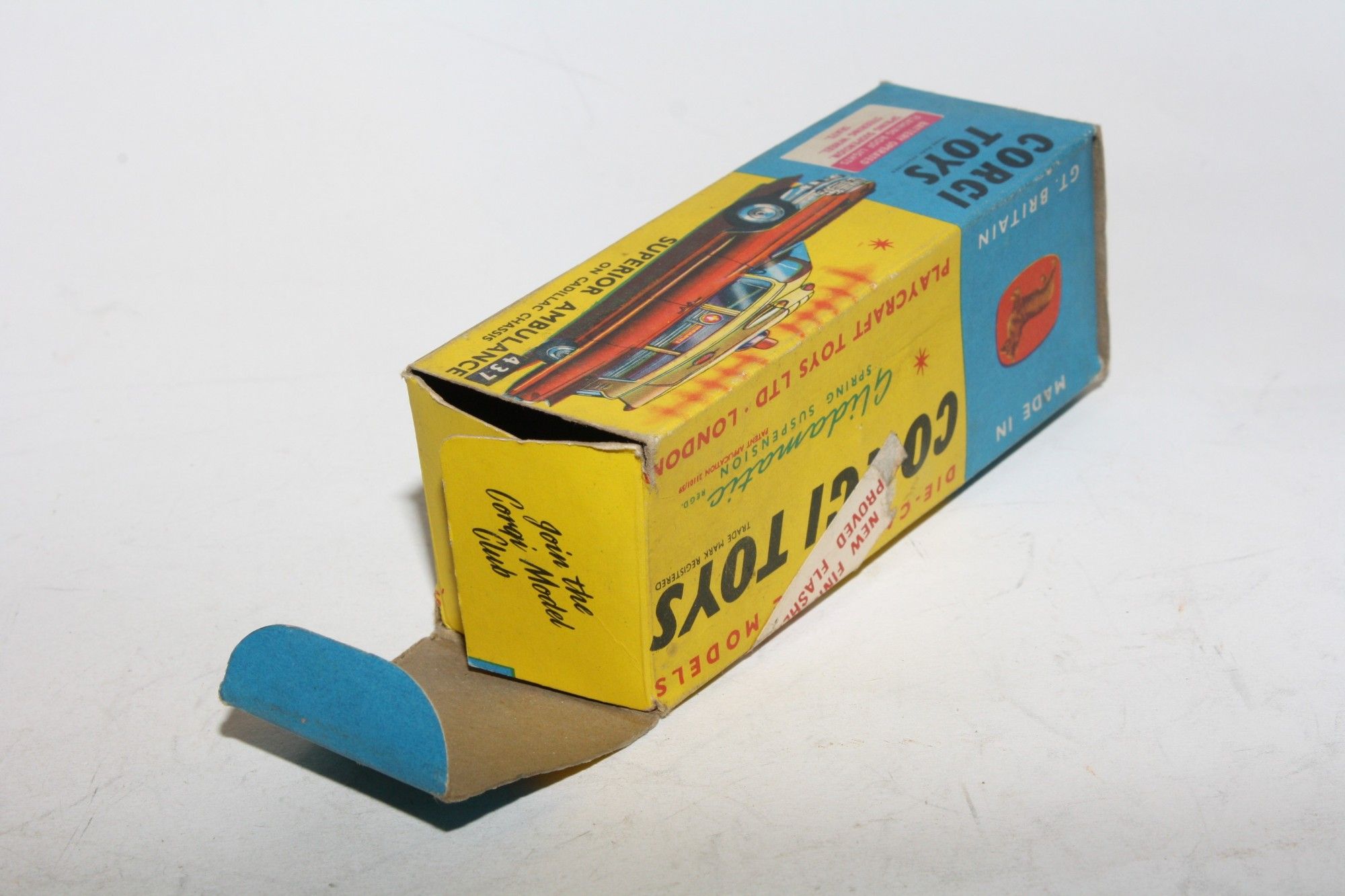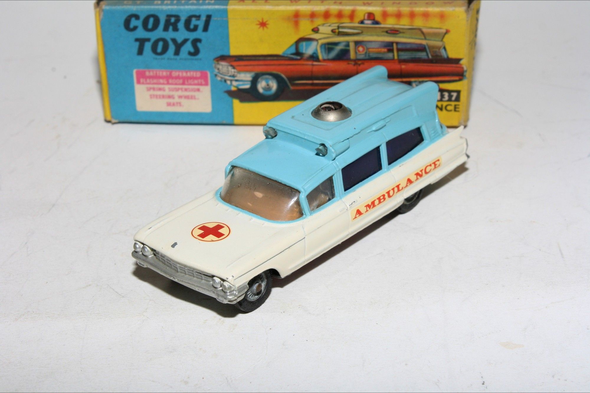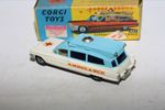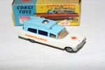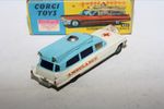A very nice example of this 1960's Corgi. Gleaming original harder to find blue/white paintwork is excellent with just a chip to bonnet, please study the high resolution photos for exact condition. Perfect original tyres on spun hubs, good suspension, windscreen cloudy, perfect original decals, excellent later issue original battery holder all intact, flashing light not tested. Excellent grey base.