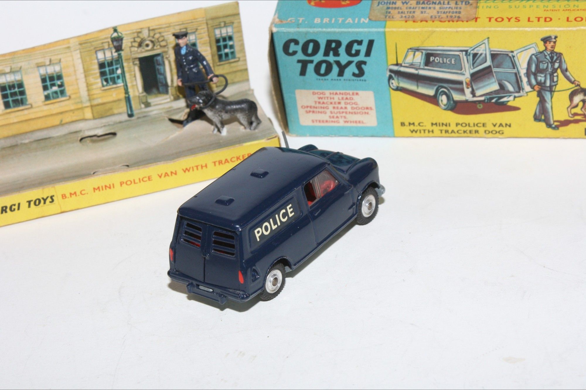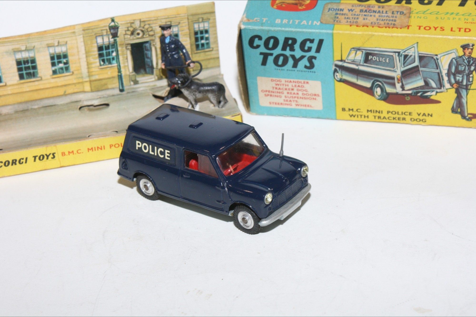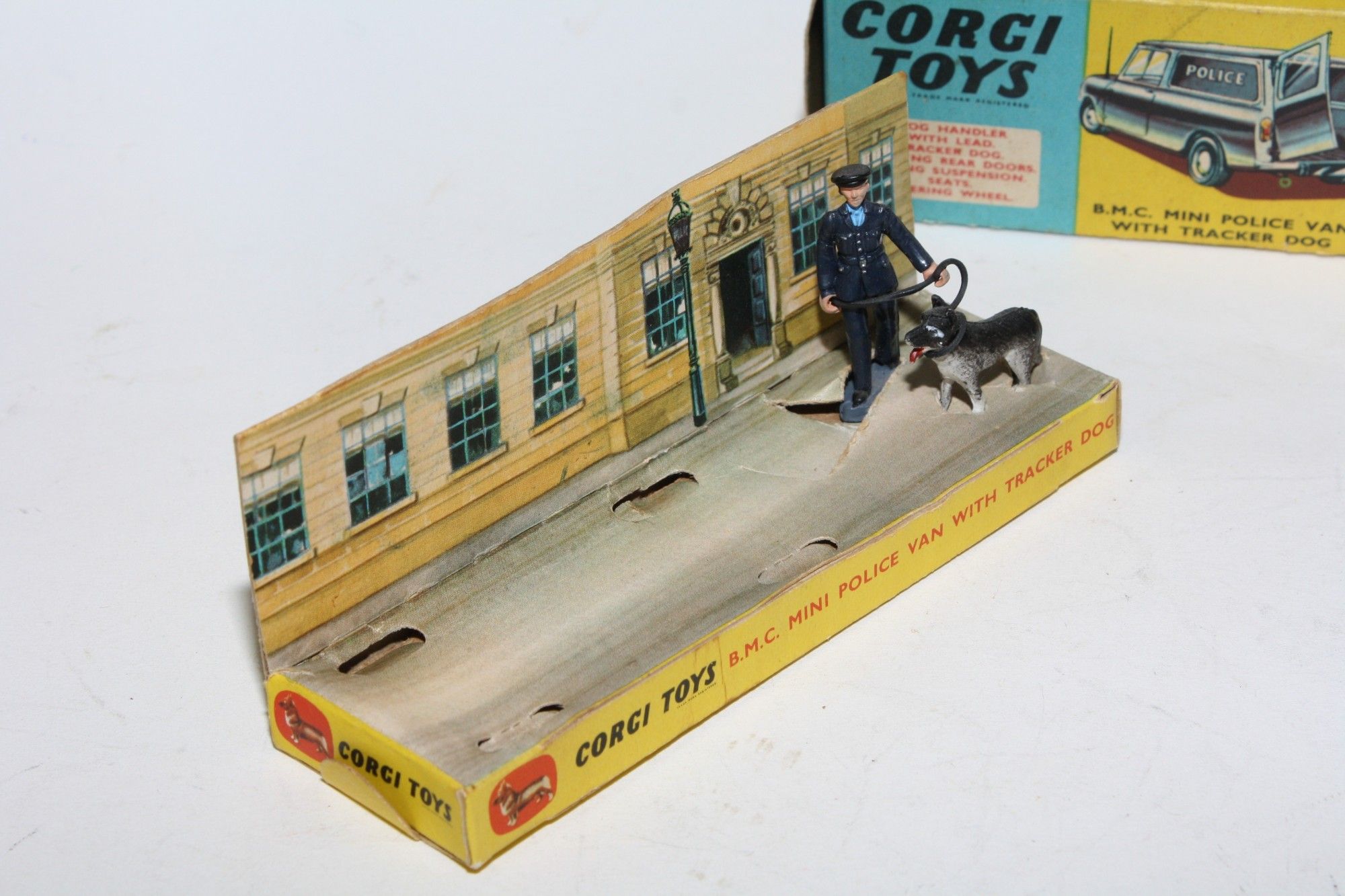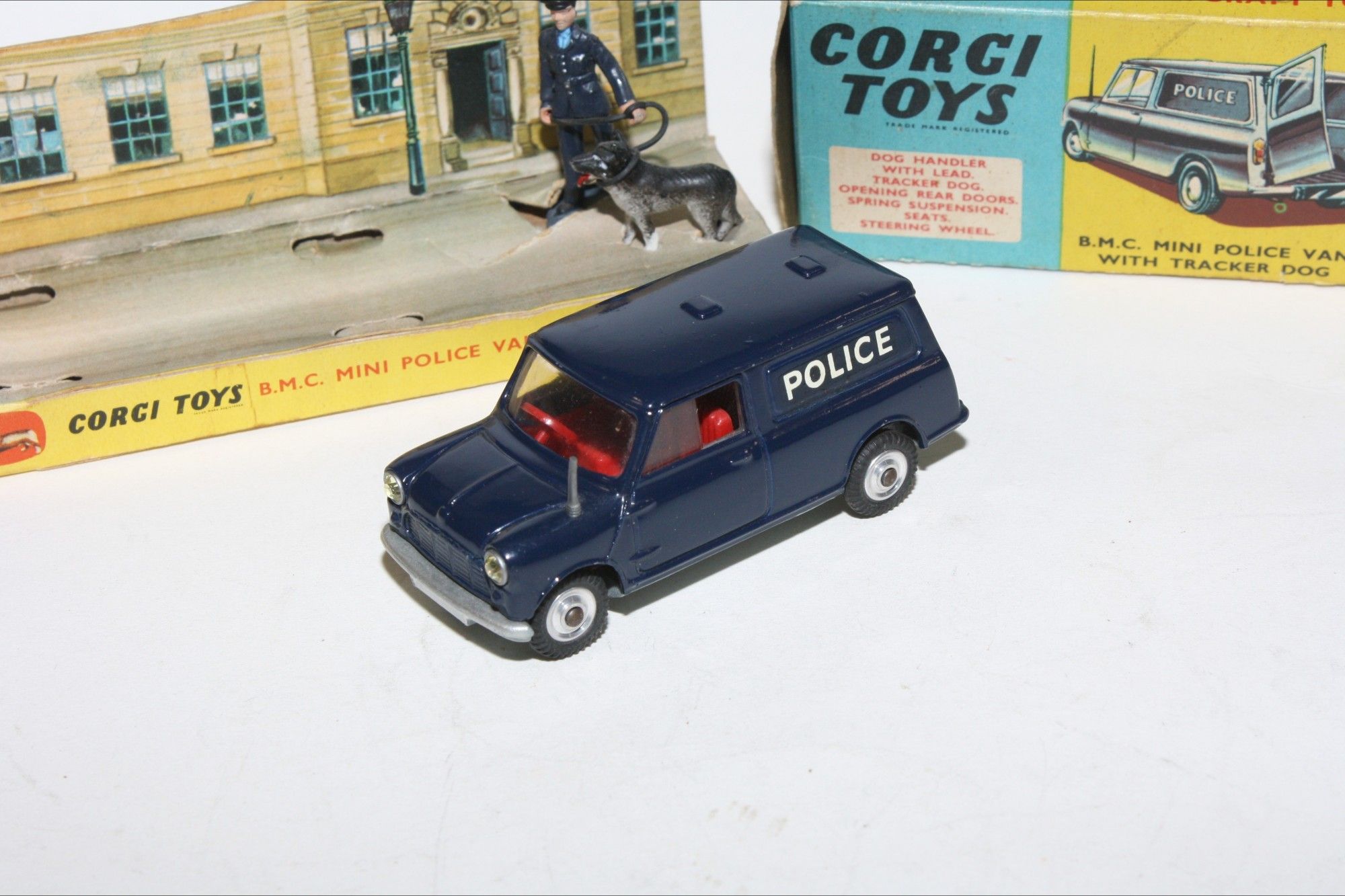 A lovely example of this 1960's Corgi Police set. Gleaming original dark blue paintwork is very near mint, please study the high resolution photos for exact condition. Perfect original tyres on spun hubs, suspension perfect, crystal clear windows and red interior, excellent original decals, aerial tip missing, both rear doors present, jewelled headlights. Comes with original policeman and dog figures with original leash. Gleaming gloss grey underside mint.