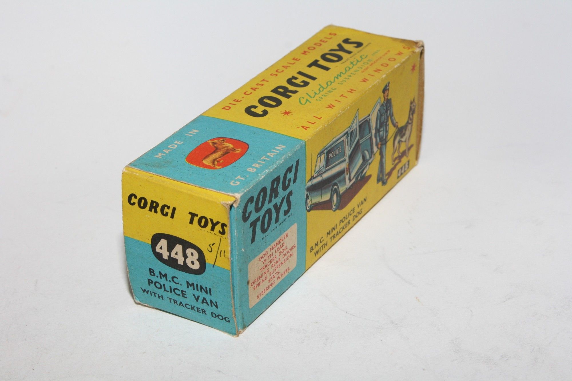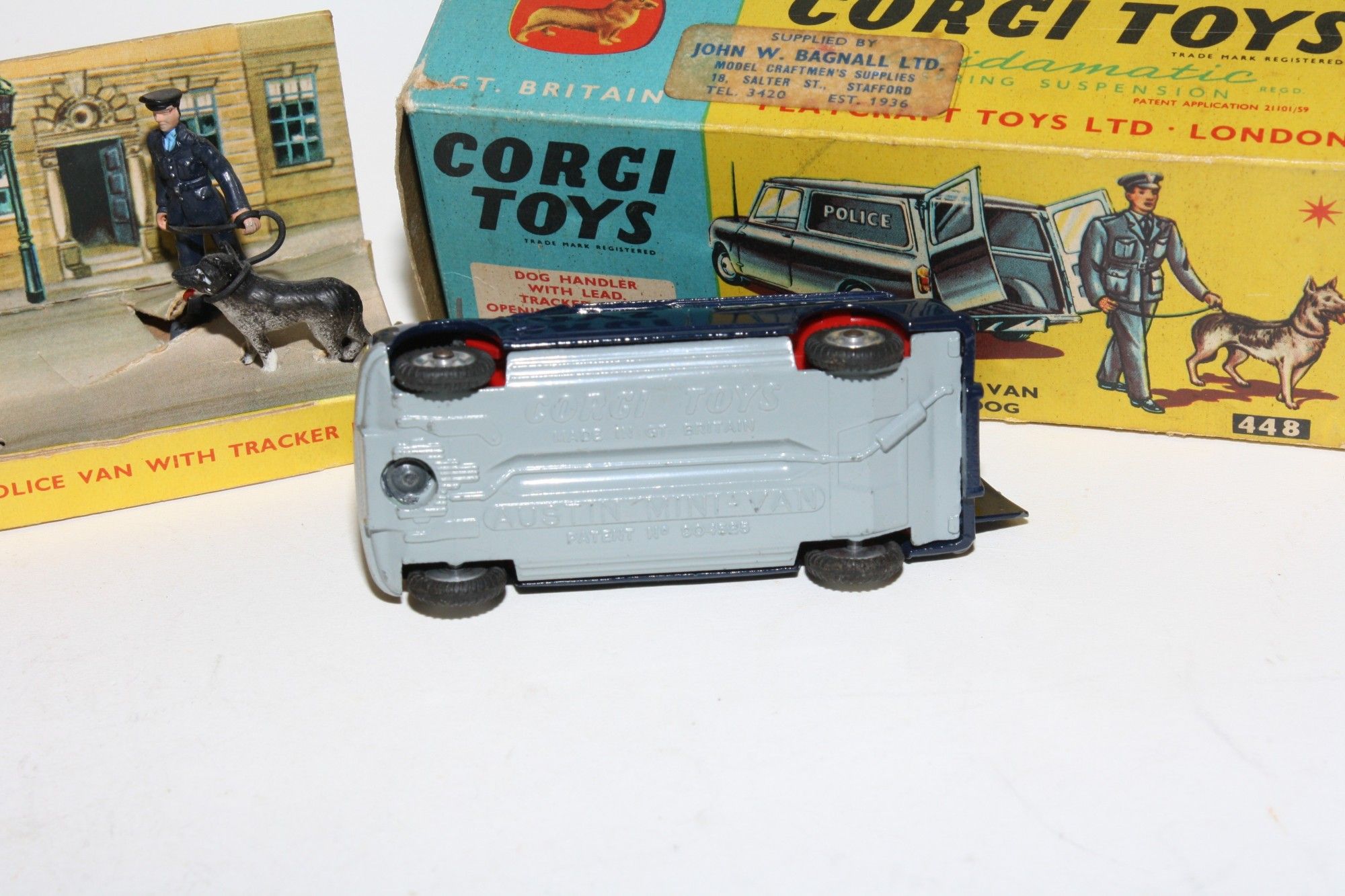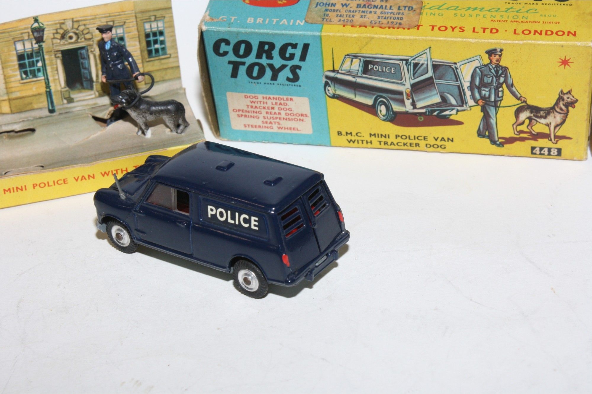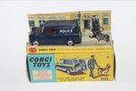 A lovely example of this 1960's Corgi Police set. Gleaming original dark blue paintwork is very near mint, please study the high resolution photos for exact condition. Perfect original tyres on spun hubs, suspension perfect, crystal clear windows and red interior, excellent original decals, aerial tip missing, both rear doors present, jewelled headlights. Comes with original policeman and dog figures with original leash. Gleaming gloss grey underside mint.