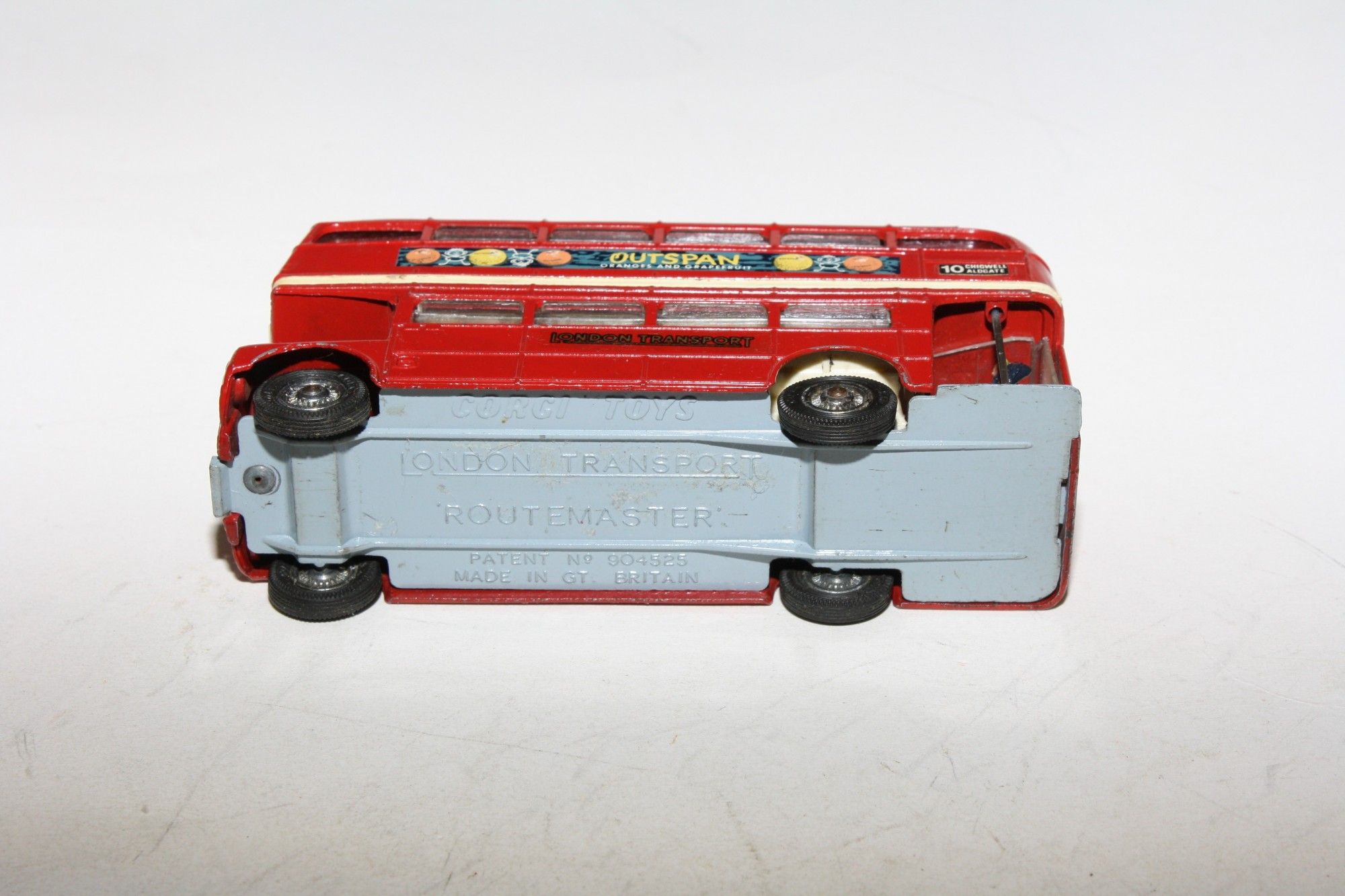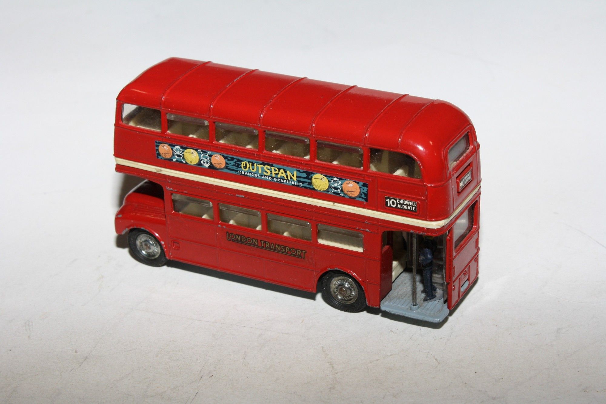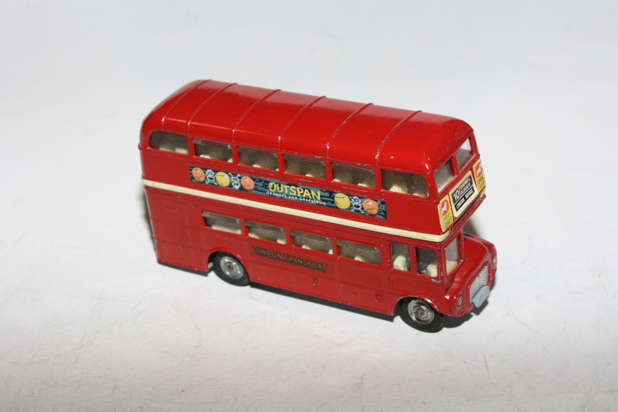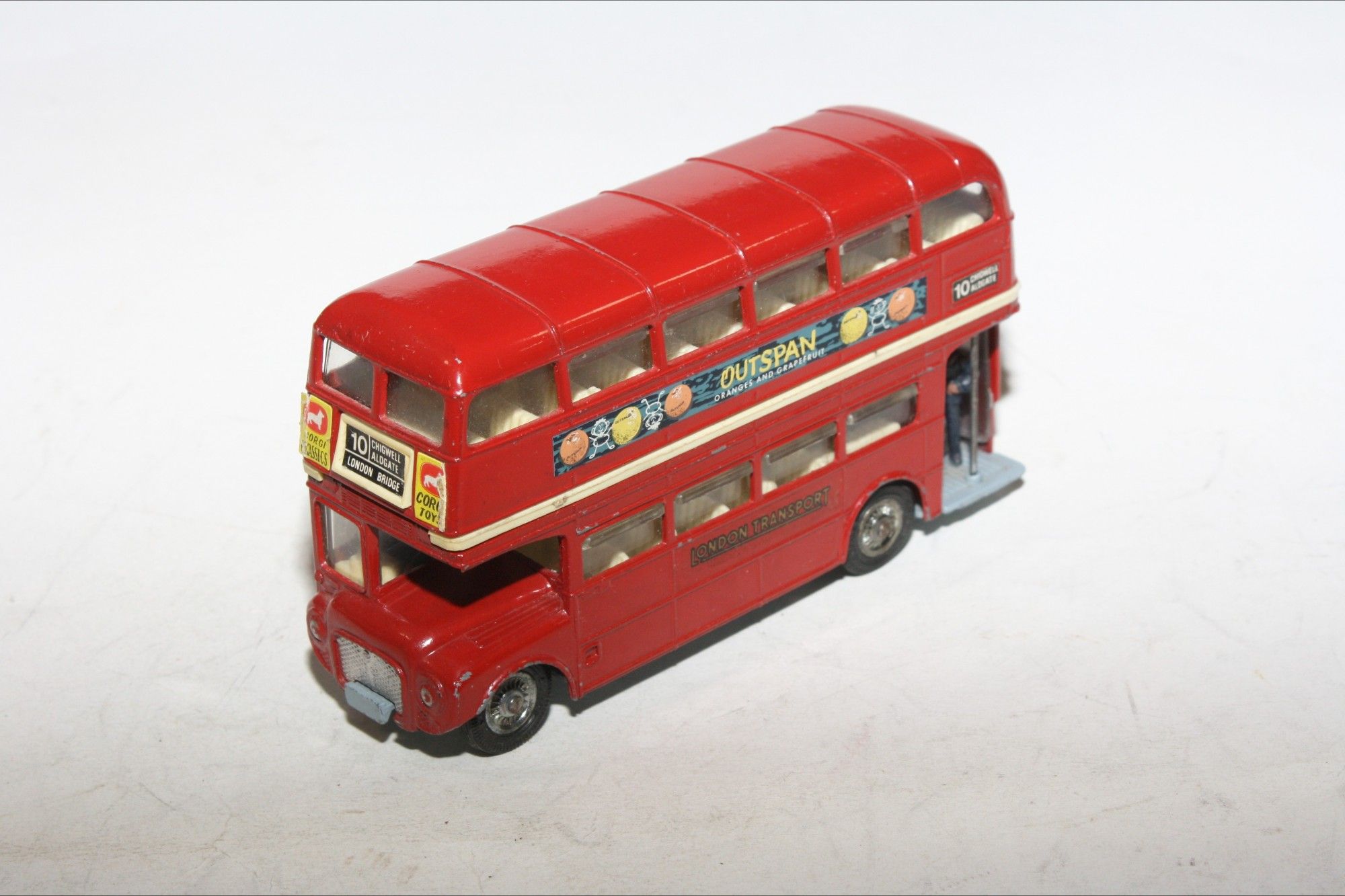 A nice example of this transitional Corgi bus with the Outspan Oranges livery. Gleaming original paintwork is very good with some rubs chips mainly to raised edges, please study the photos for exact condition. Perfect cast hubs with good original tyres, straight free rolling axles, good suspension, cream interior, perfect windows, jewelled headlights, clippie and driver figures present, excellent original decals/stickers including Corgi Classics adverts, grey underside excellent.
