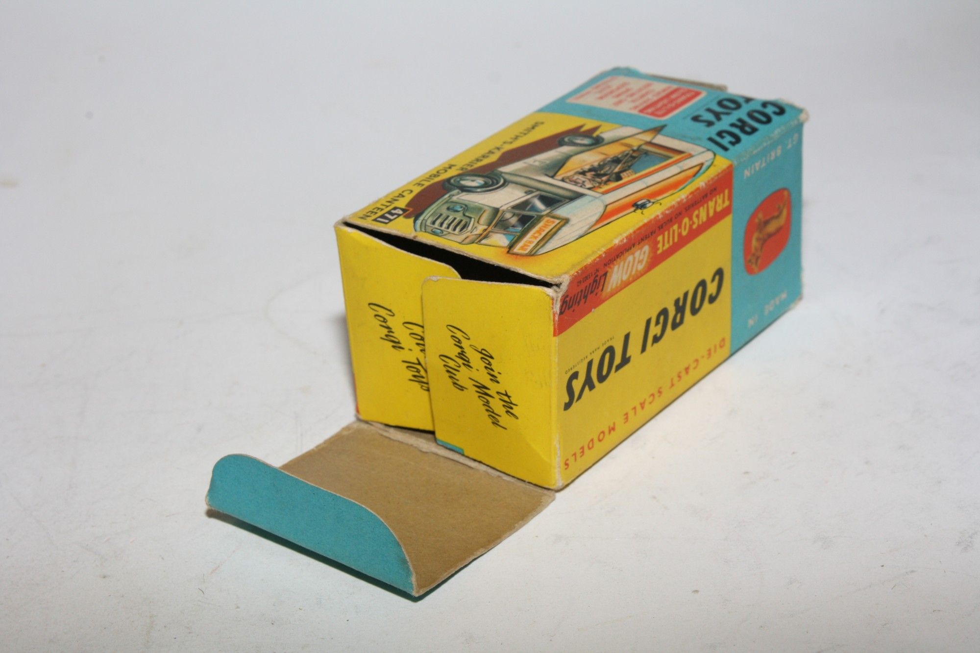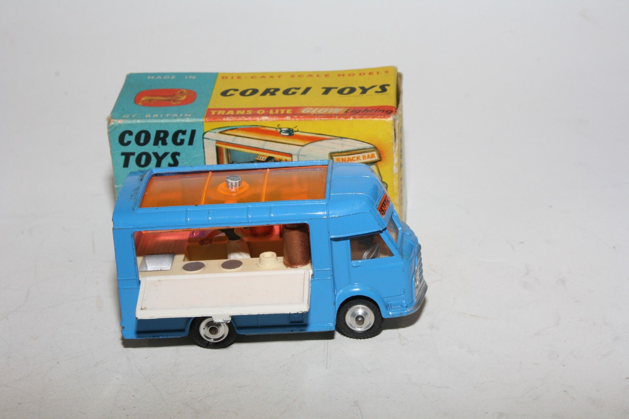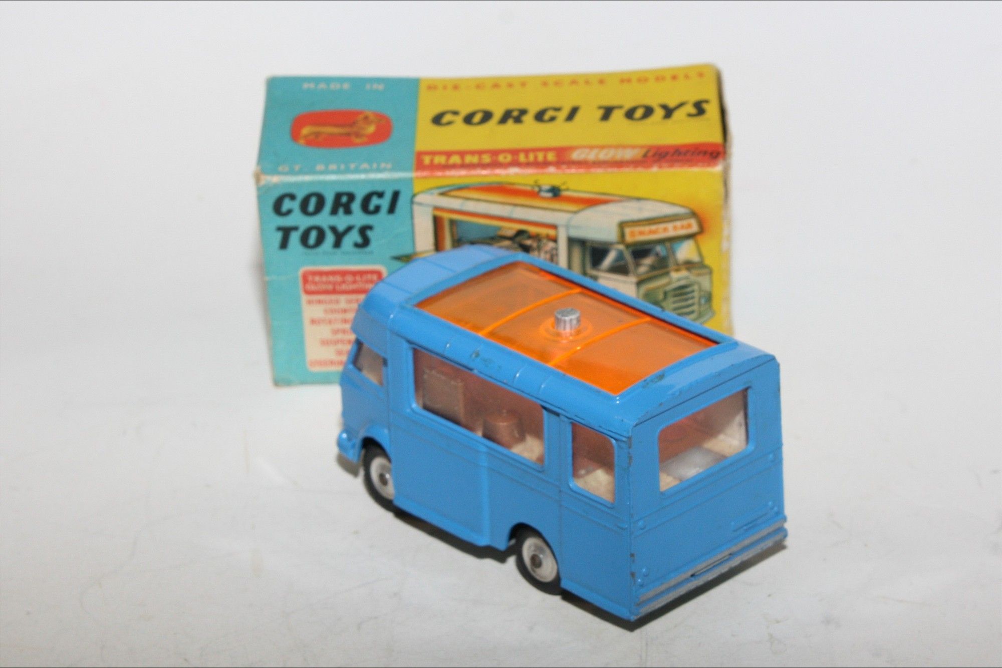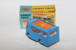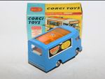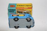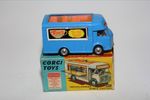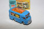A superb example of this lovely vintage Corgi. Gleaming original blue paintwork is near mint with a few nicks to raised edges, please study the photos for exact condition. Excellent original tyres on spun hubs, perfect suspension, crystal clear windows, white interior, Trans-O-Lite glow lighting to front sign, rotating figure and interior fittings all perfect. Opening serving hatch, original stickers/decals are excellent and gloss grey underside is mint.