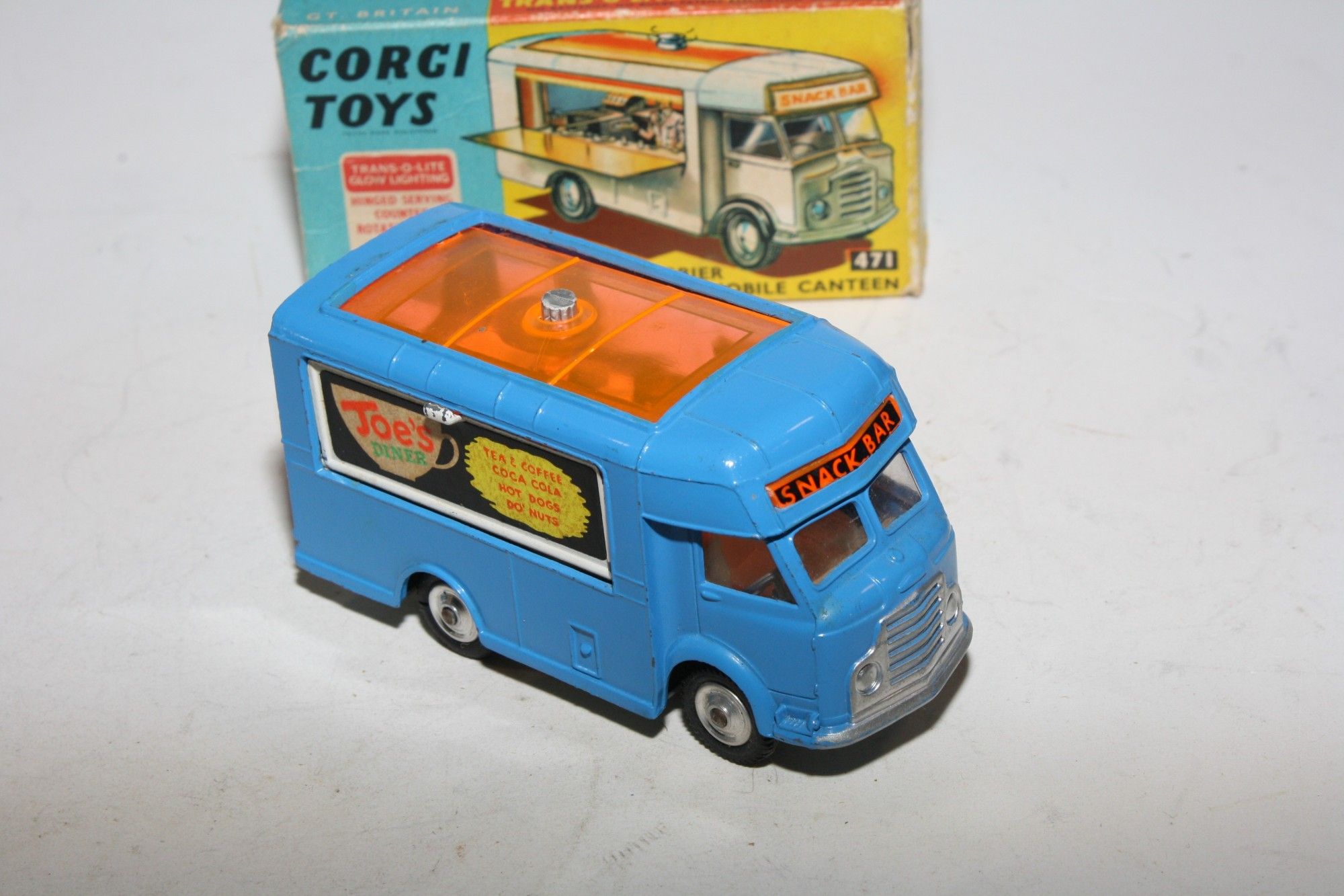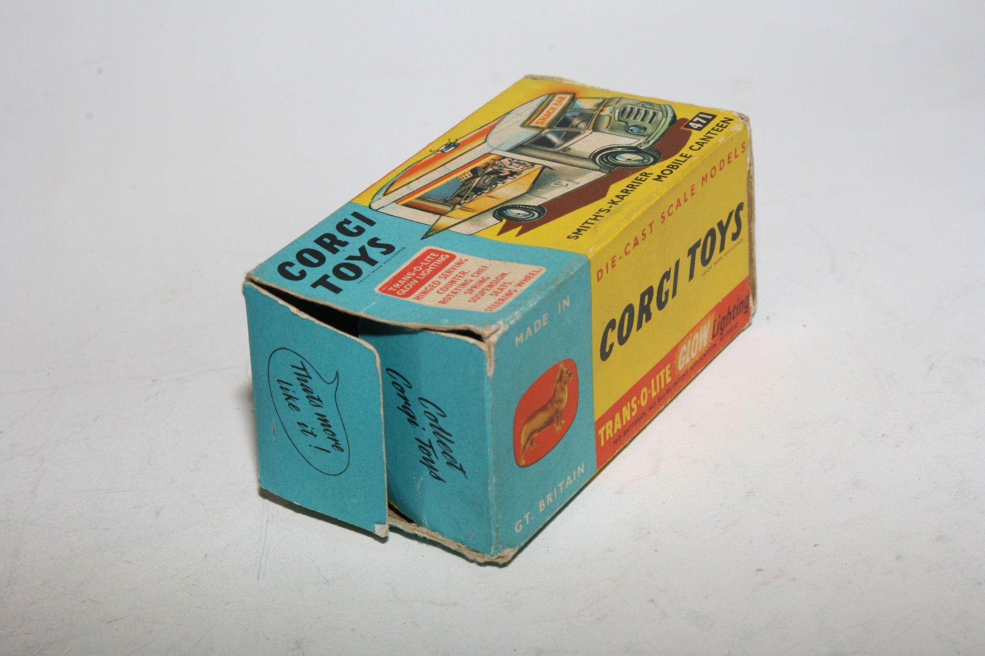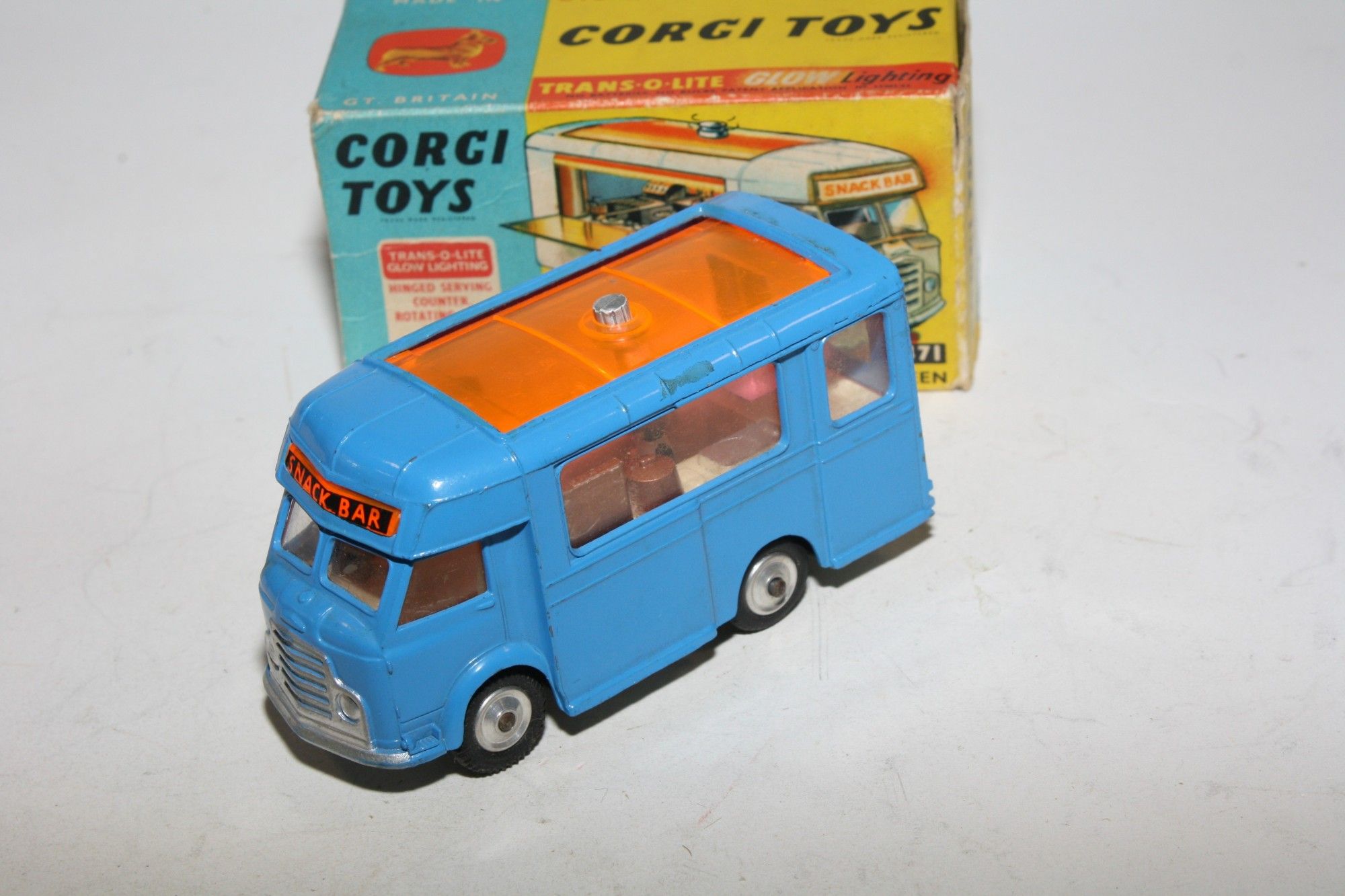 A superb example of this lovely vintage Corgi. Gleaming original blue paintwork is near mint with a few nicks to raised edges, please study the photos for exact condition. Excellent original tyres on spun hubs, perfect suspension, crystal clear windows, white interior, Trans-O-Lite glow lighting to front sign, rotating figure and interior fittings all perfect. Opening serving hatch, original stickers/decals are excellent and gloss grey underside is mint.
