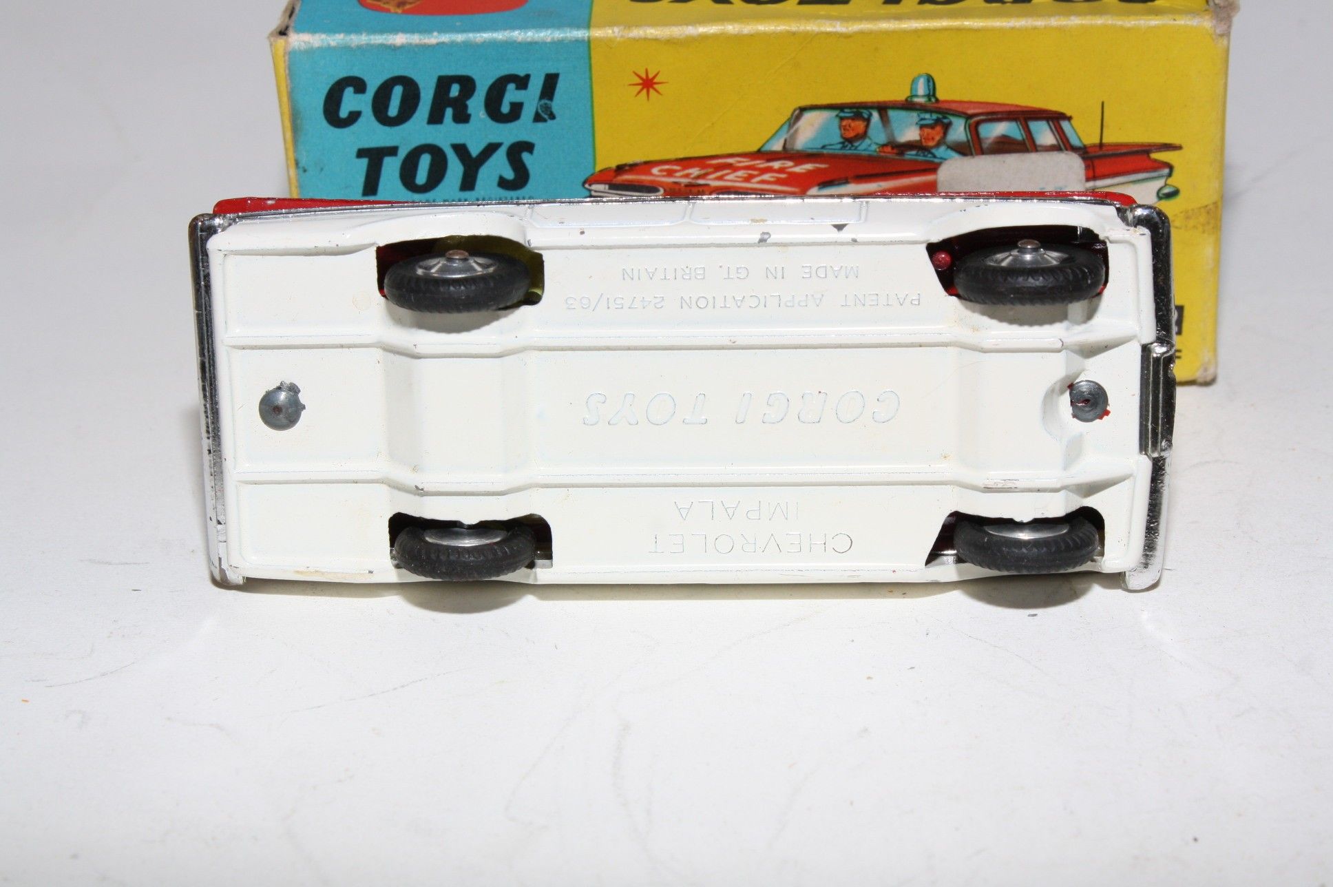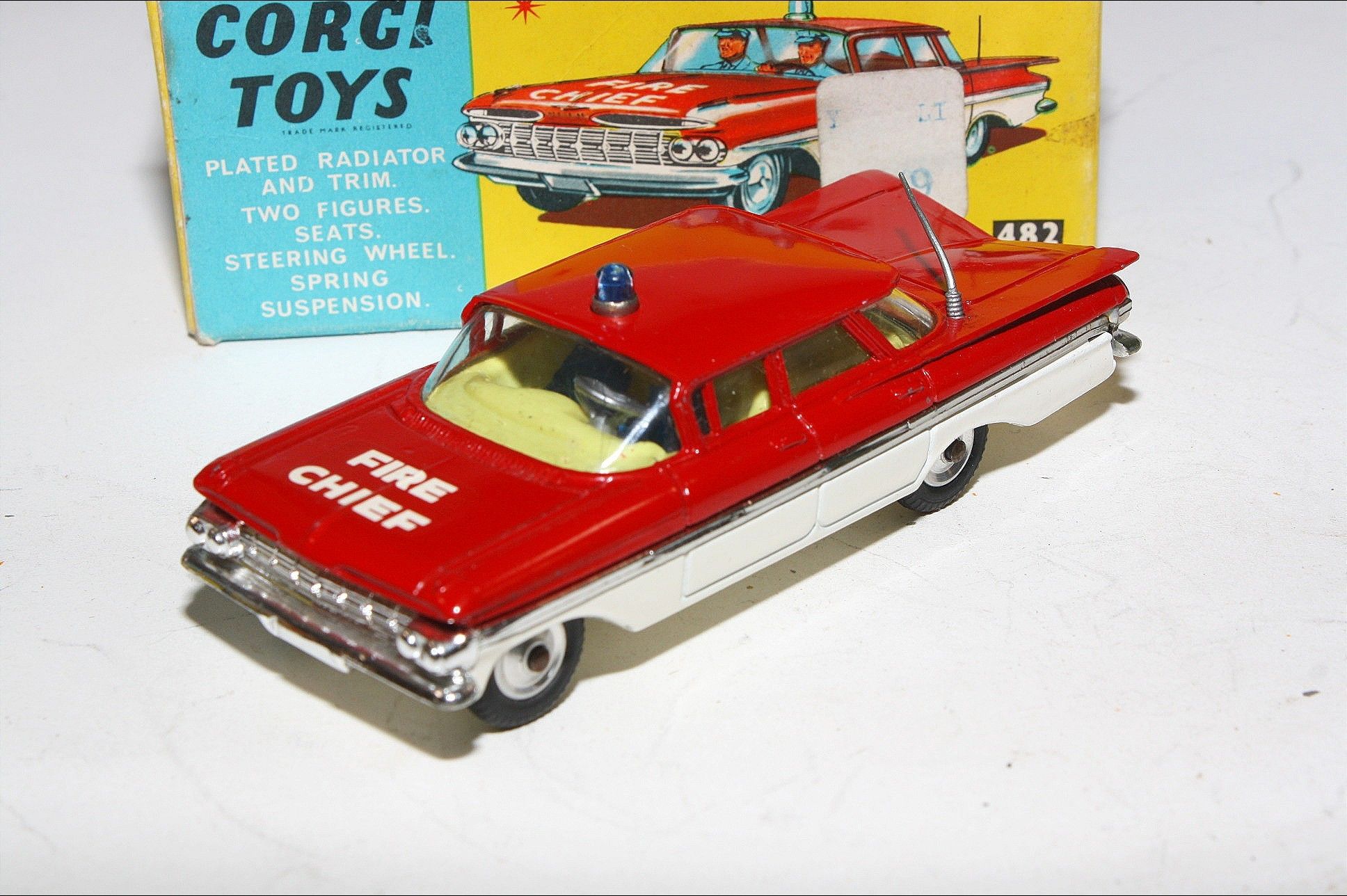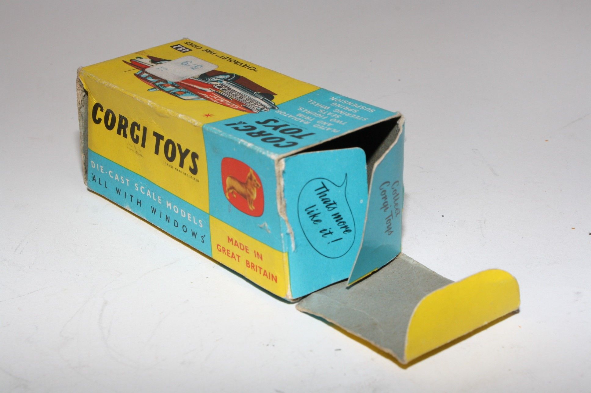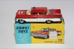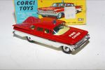 A nice example of this 1960's Corgi. Gleaming red over white paintwork is excellent with just a few small chips, please study the photos for exact condition. Perfect original tyres on harder to find spun hubs, perfect suspension, clear windows, (hairline crack on left of windscreen, hardly visible) yellow interior, gleaming chrome, roof light, no door stickers, original aerial, good white baseplate.