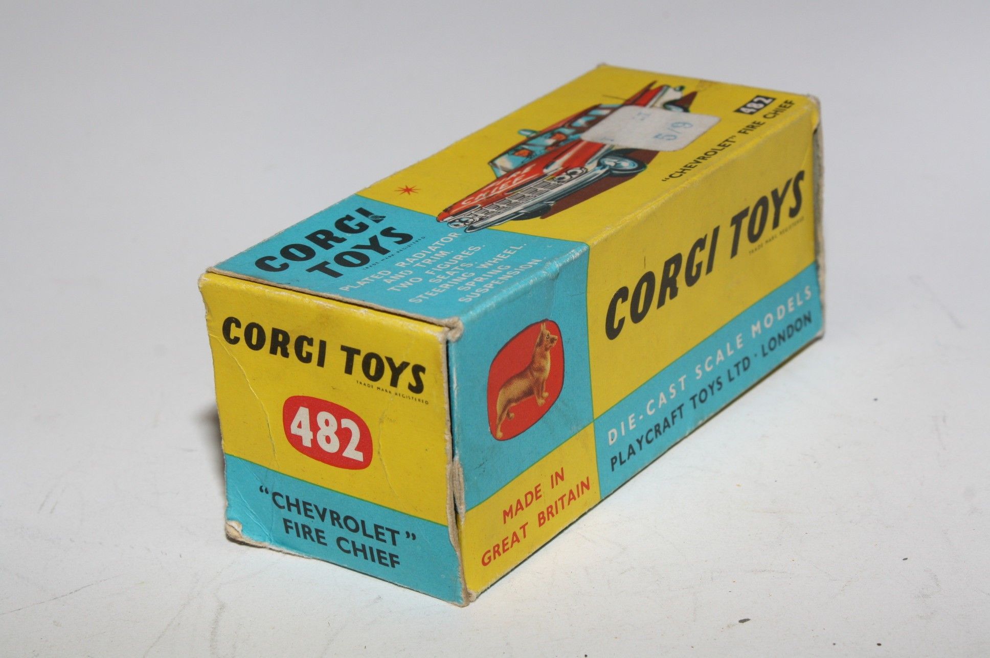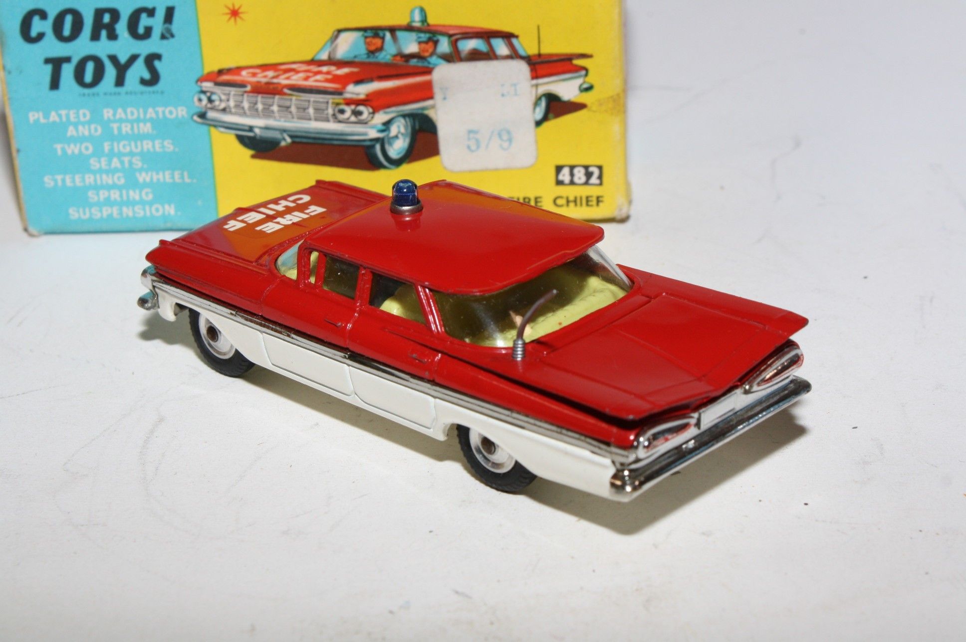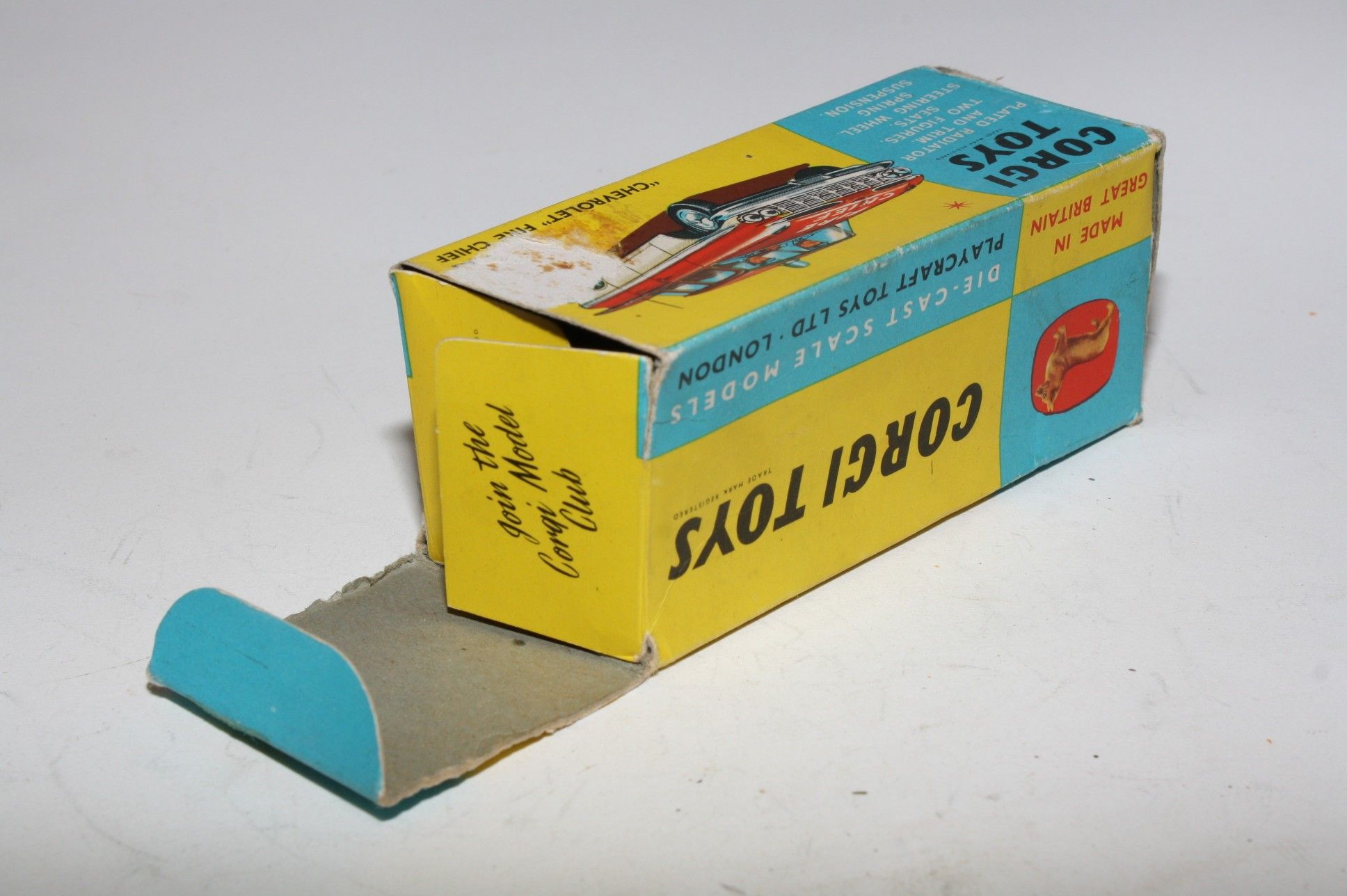 A nice example of this 1960's Corgi. Gleaming red over white paintwork is excellent with just a few small chips, please study the photos for exact condition. Perfect original tyres on harder to find spun hubs, perfect suspension, clear windows, (hairline crack on left of windscreen, hardly visible) yellow interior, gleaming chrome, roof light, no door stickers, original aerial, good white baseplate.
