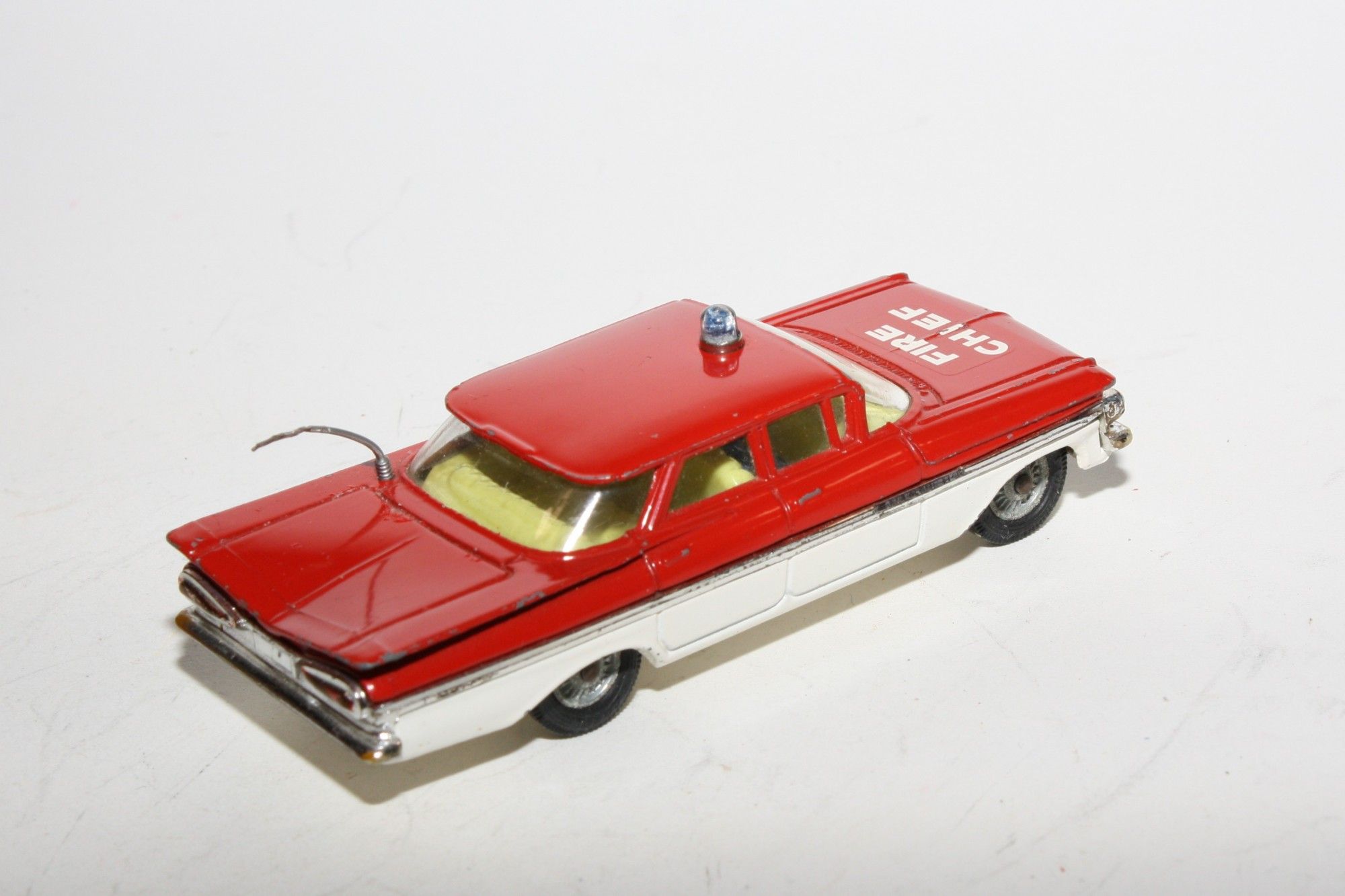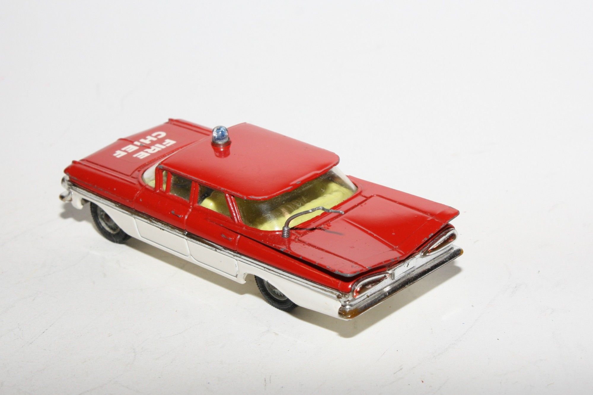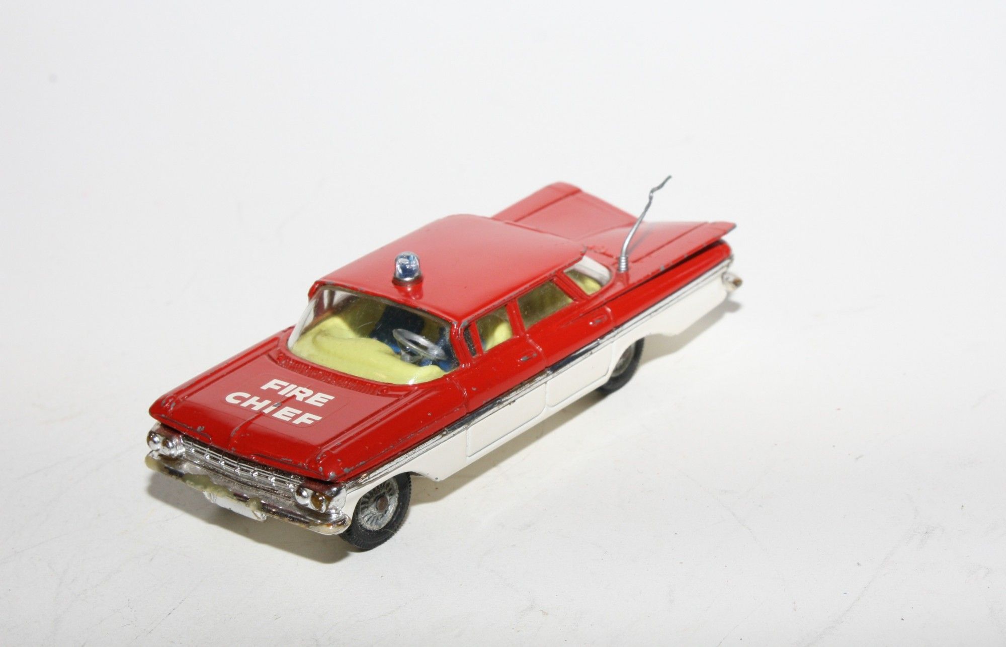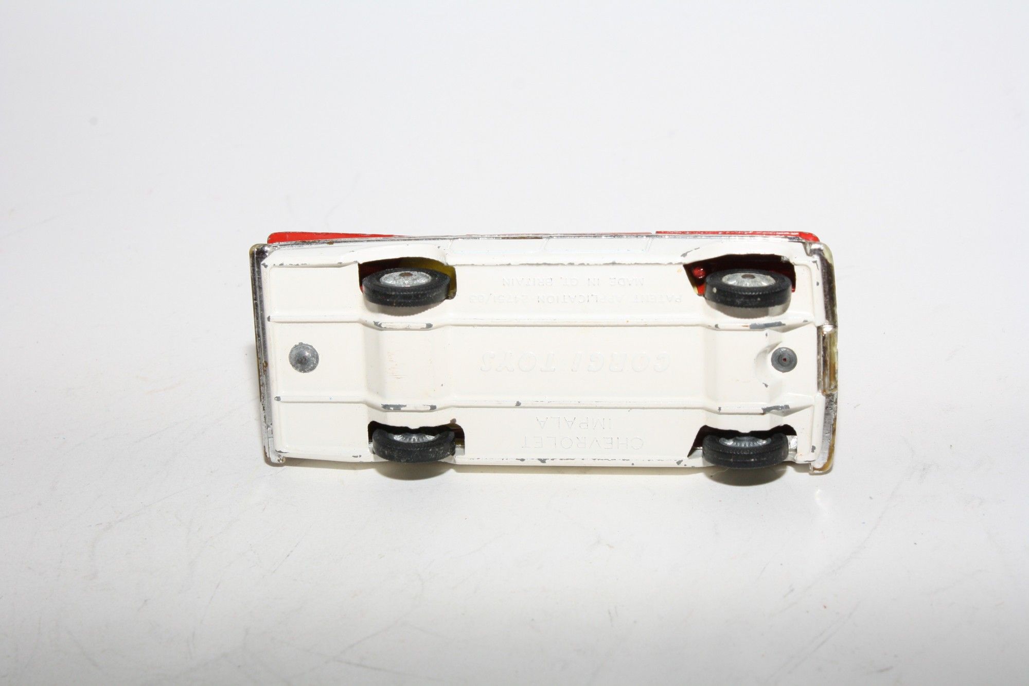 A nice example of this 1960's Corgi. Gleaming red over white paintwork is excellent with just a few small nicks mainly to raised edges/corners, please study the photos for exact condition. Perfect original tyres on cast hubs, perfect suspension, clear windows, yellow interior, some wear to chrome in places, roof light, two figures and steering wheel in place, original aerial, good white baseplate.