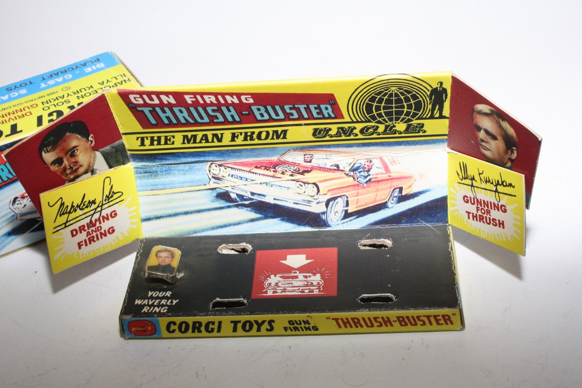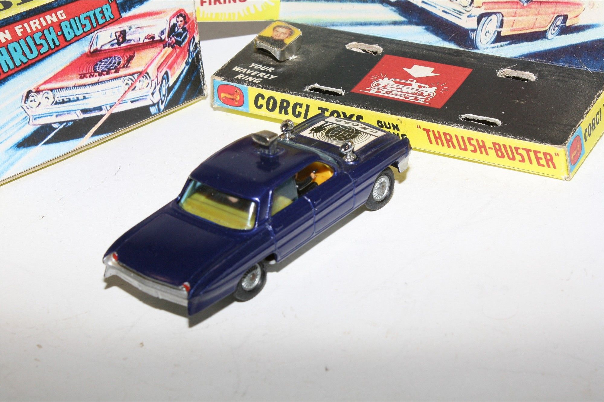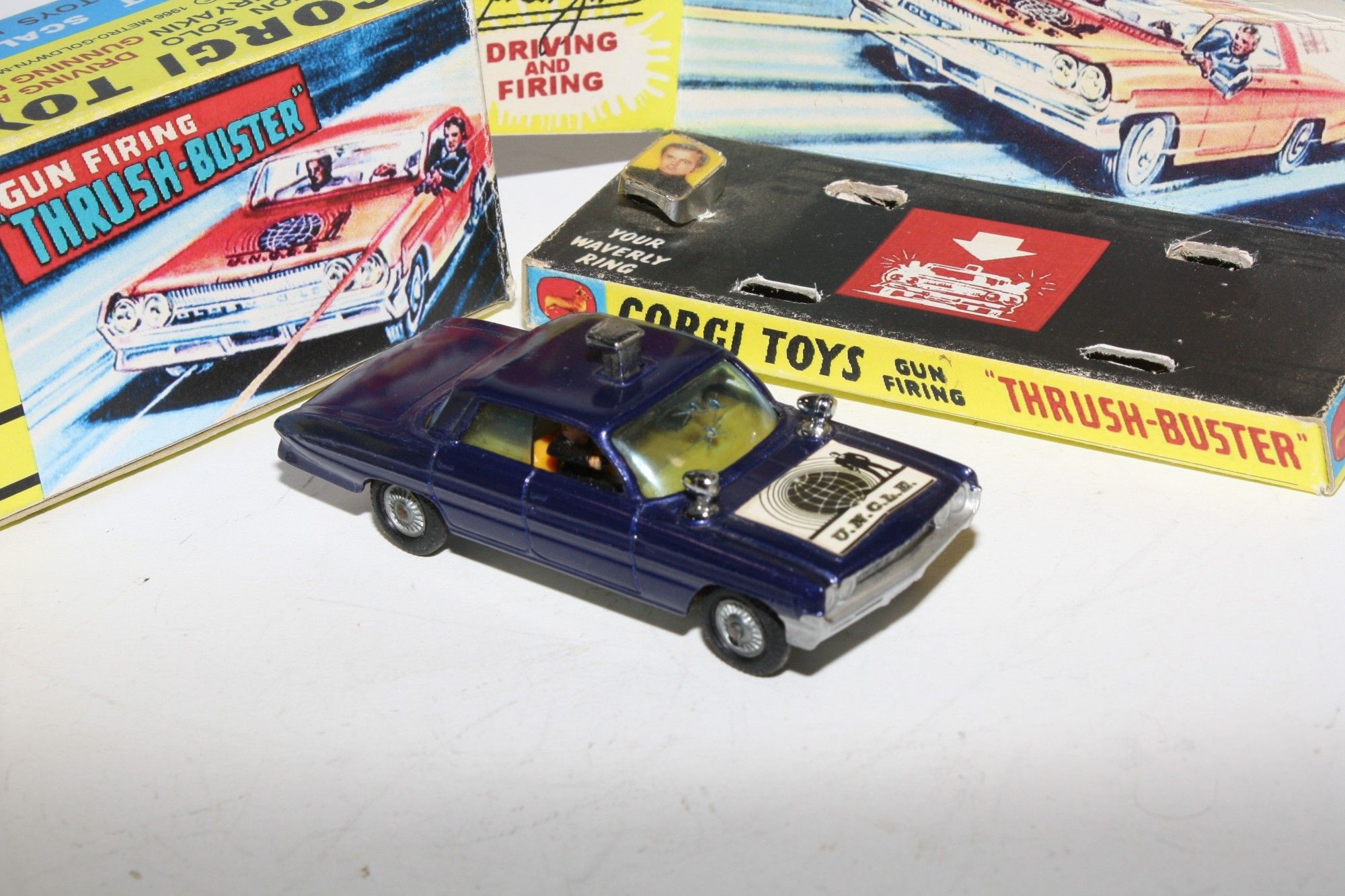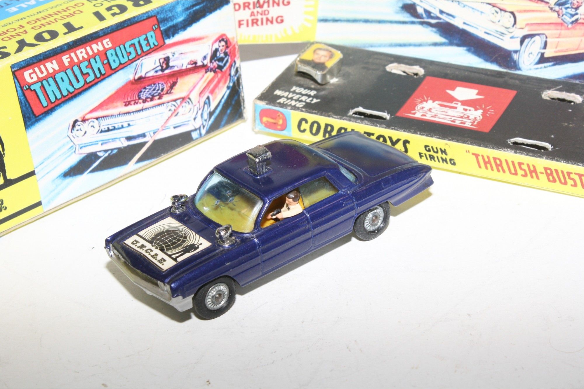 The blue Oldsmobile Super 88, made famous in MGM's 1966 series, The Man from U.N.C.L.E Featuring Solo and Kuryakan fighting evil in New York City. Model has been nicely restored at some point, please study the photos for exact condition. Glass (complete with bullet holes) is clear and free of any blemishes, interior good as in bonnet sticker, chrome spotlights intact, chrome finish on rooflight/button. Wheels turn freely, tyres are in good condition on cast hubs. Gun firing Thrush-Buster action works as intended with both figures perfect. Good underside.