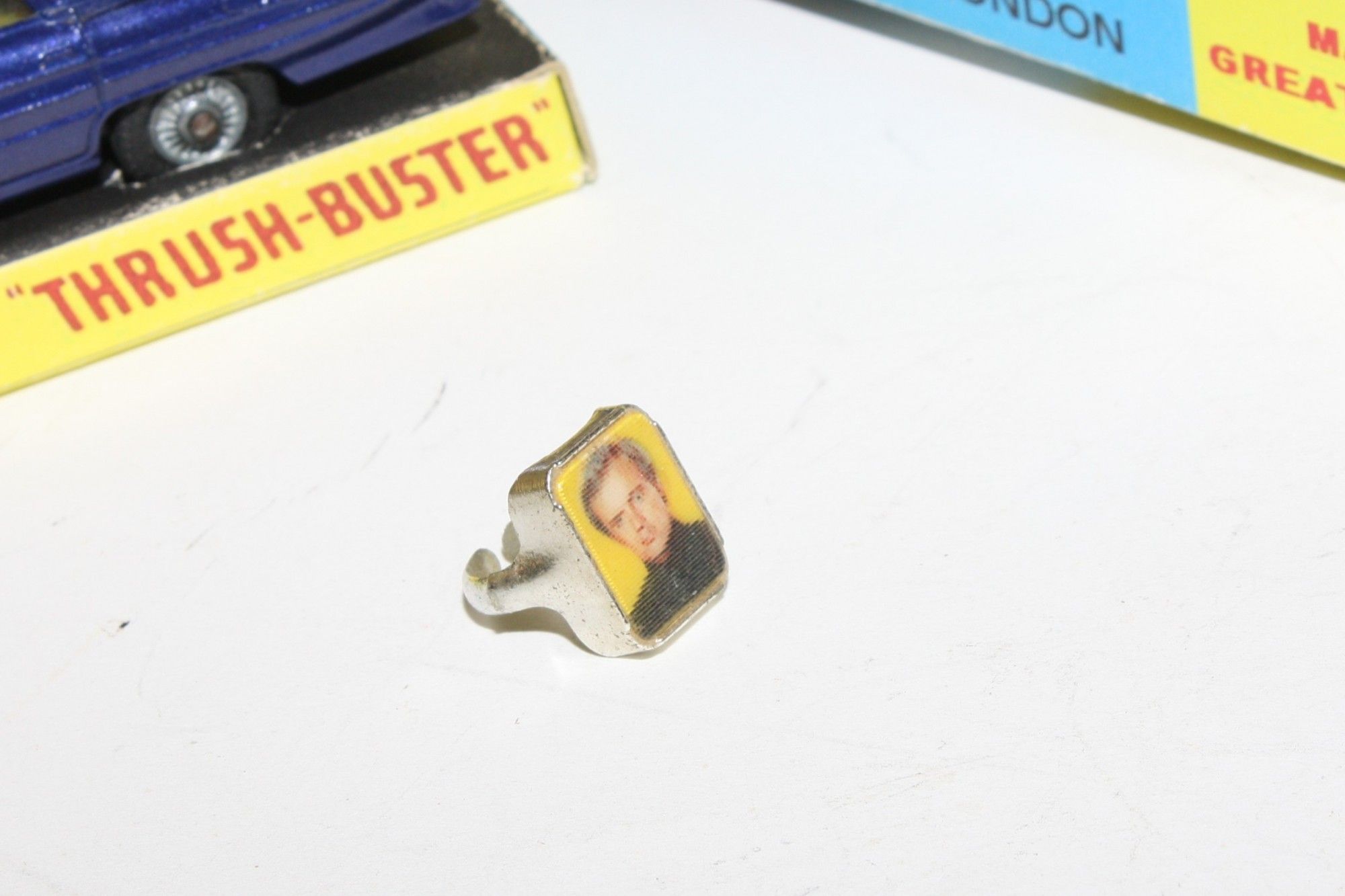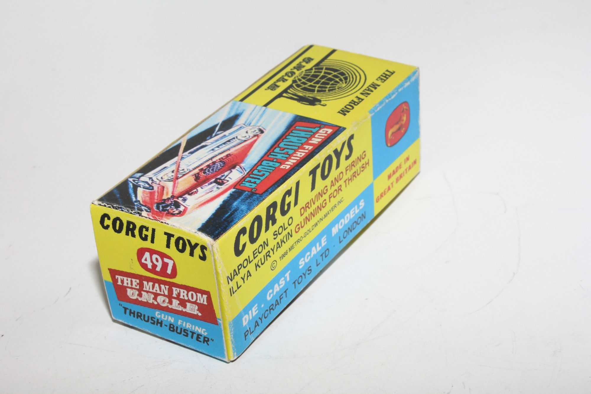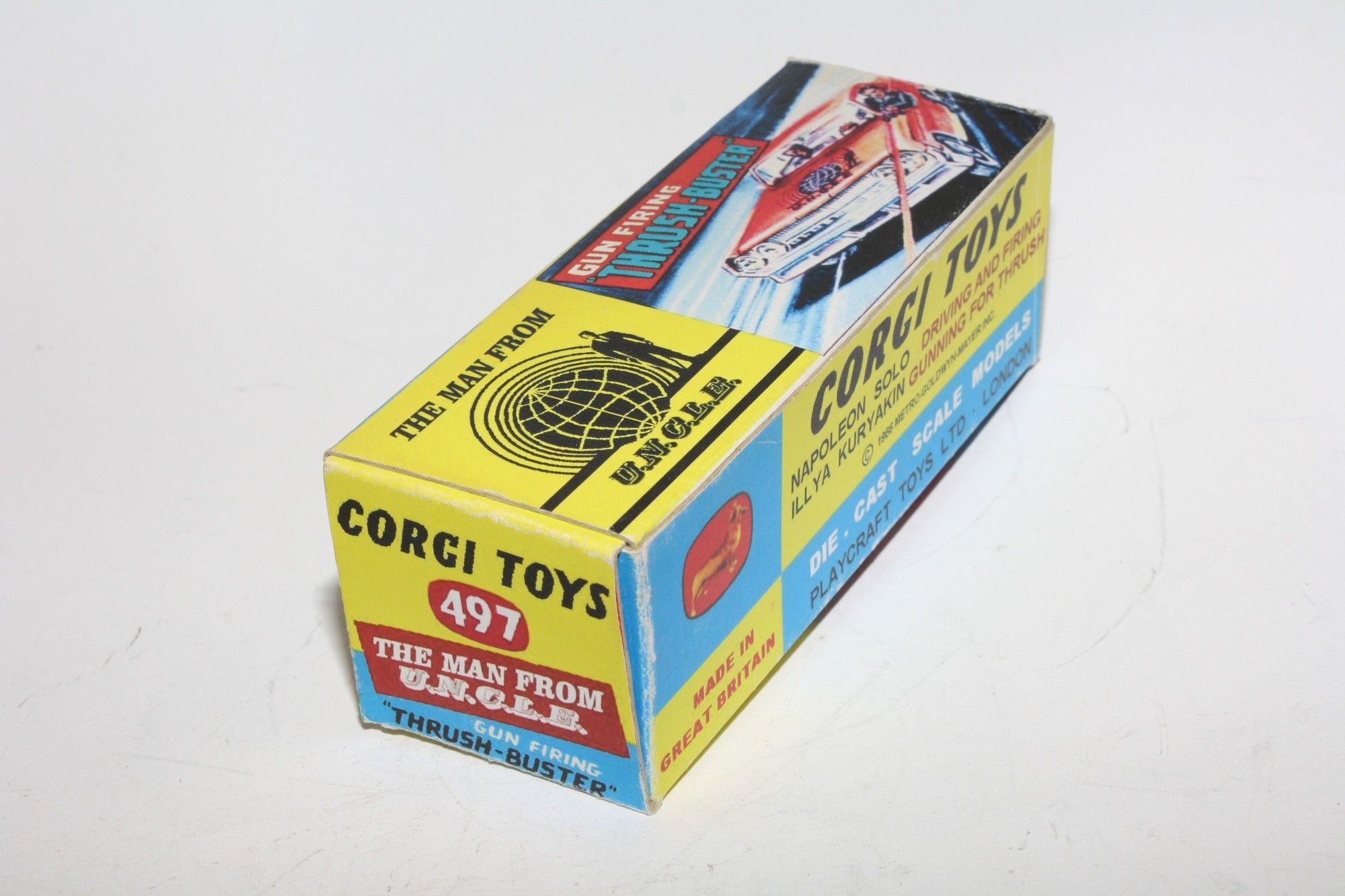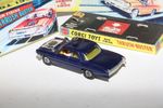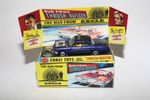 The blue Oldsmobile Super 88, made famous in MGM's 1966 series, The Man from U.N.C.L.E Featuring Solo and Kuryakan fighting evil in New York City. Model has been nicely restored at some point, please study the photos for exact condition. Glass (complete with bullet holes) is clear and free of any blemishes, interior good as in bonnet sticker, chrome spotlights intact, chrome finish on rooflight/button. Wheels turn freely, tyres are in good condition on cast hubs. Gun firing Thrush-Buster action works as intended with both figures perfect. Good underside.